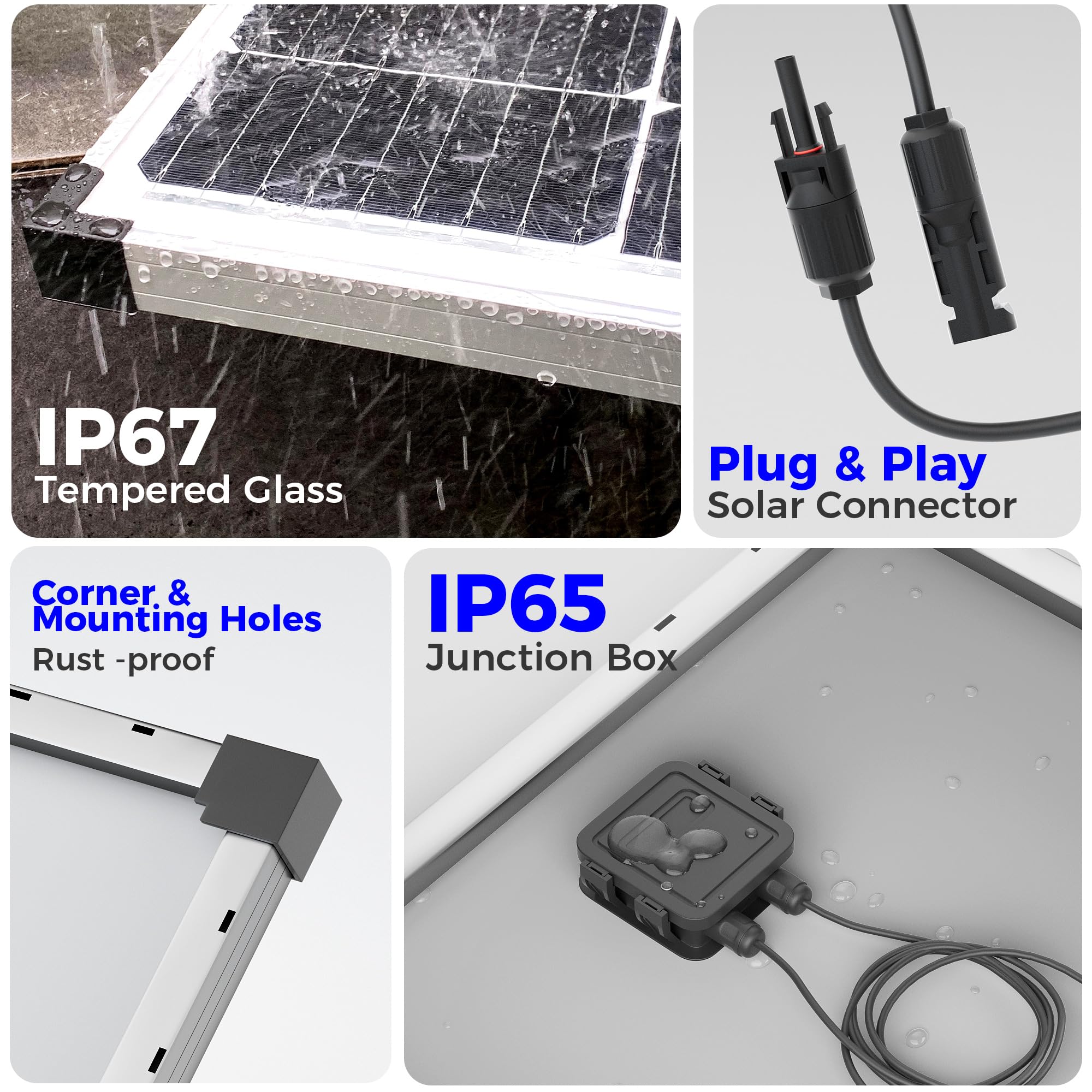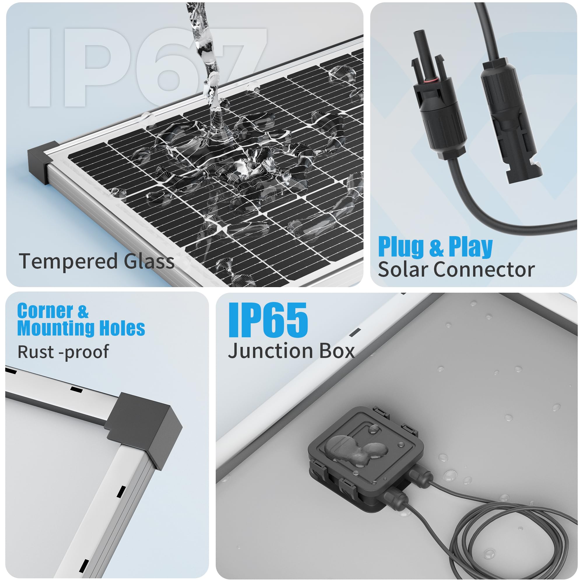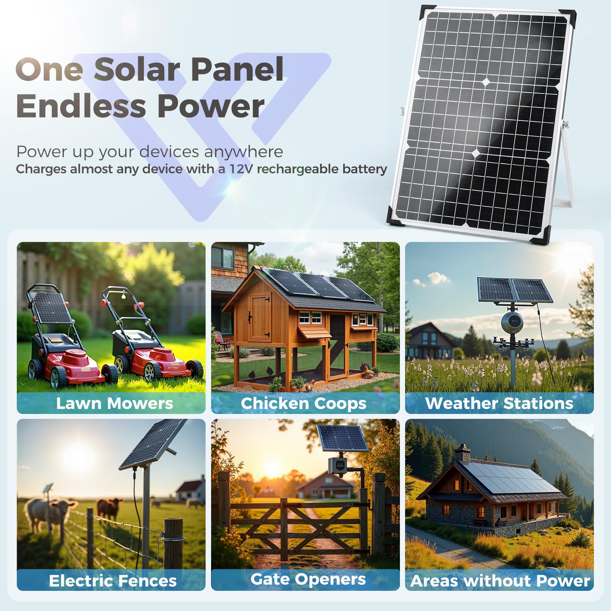 Sun Tracking Flexibility: Our 12V monocrystalline solar panel+ 360° adjustable aluminum bracket allows for precise angle optimization to maximize sunlight absorption throughout the year, The bracket can be rotated ±15° to follow the sun, increasing the average daily sunlight absorption by 12%