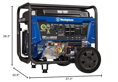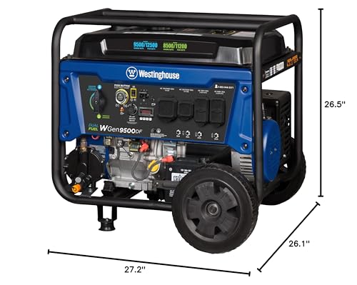The Westinghouse WGen9500DF Dual Fuel Portable Generator produces up to 12,500 peak watts and 9,500 running watts. The WGen9500DF is a dual fuel generator that operates on gasoline or propane (LPG). The heavy duty 457cc 4-Stroke OHV Westinghouse Engine is constructed of a durable cast iron sleeve and runs for up to 12 hours on a 6.6 gallon (25 L) gas tank, keeping you powered through the day with built-in fuel gauge, automatic low oil shutdown, and GFCI outlets. Push-Button Electric Start makes starting the WGen9500DF effortless while the remote start key fob offers added ease from a distance. Its intuitive control panel spotlights the Transfer Switch Ready L14-30R 30A and larger 14-50R 50A to power your major appliances like the air conditioner, refrigerator, and sump pump as well as any lights or entertainment centers all at the same time with a single cord hookup. VFT Data Center displays volt output, frequency, and lifetime hours to keep you up to date with real-time information and regular maintenance. Conveniently portable with an included set of heavy duty never-flat wheels, handle, and lift bracket, it'll have your house, travel trailer, or jobsite powered in seconds. The WGen9500DF is complete with a 3-Year Limited Warranty and Lifetime Technical Support backed by our nationwide customer service and support network.