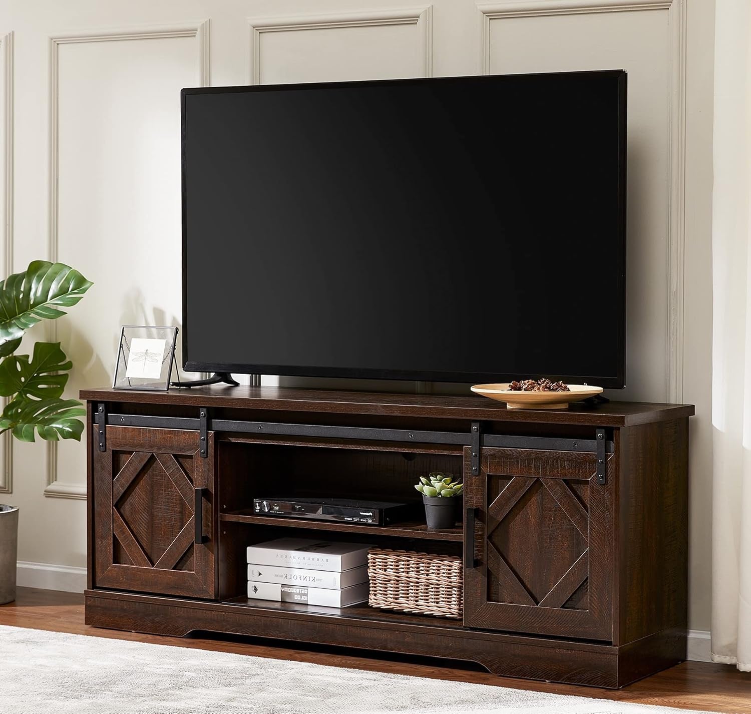 Transform your living room with our Rustic Sliding Barn Door TV Stand, perfectly designed for 65" TVs. This beautifully crafted piece combines farmhouse charm with modern functionality, making it a stunning addition to any decor style. The sliding barn doors not only enhance the aesthetic but also provide convenient access to your media essentials.