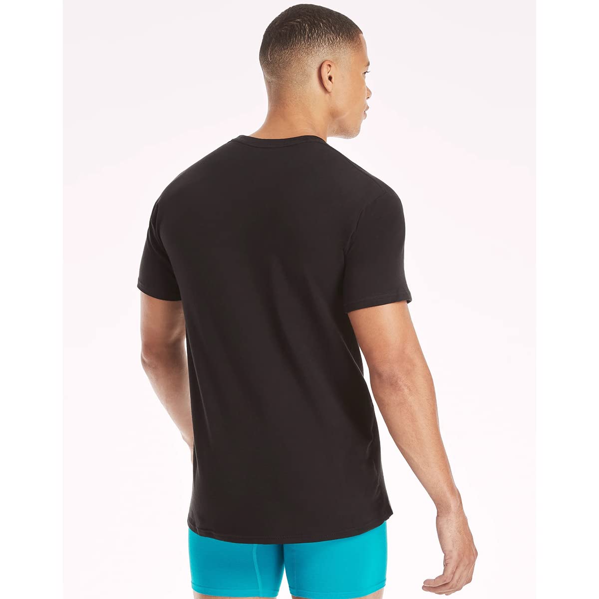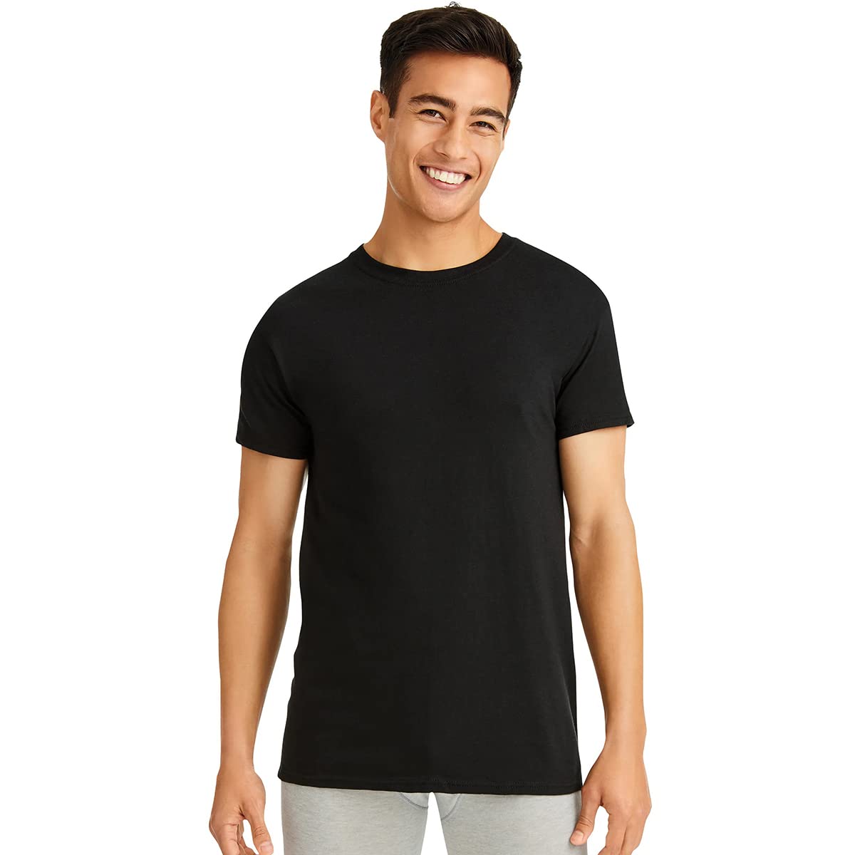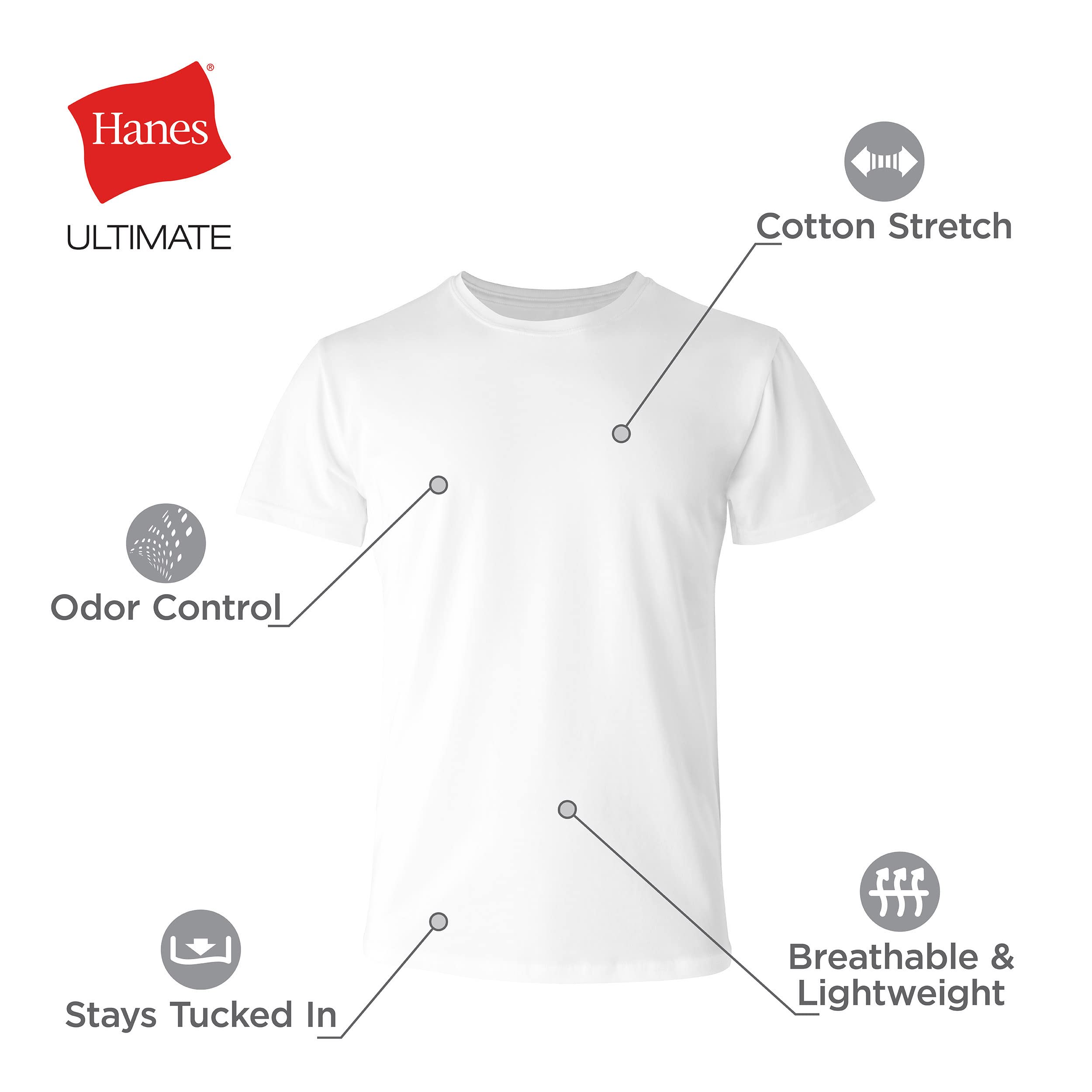 Hanes Ultimate® Comfort Fit stay-tucked t-shirts are crafted from lightweight, stretch, breathable ringspun cotton that includes just a touch of spandex for move-with-you comfort. The moisture-wicking fabric features anti-odor technology, keeping you cooler and fresher all day long. The classic crewneck design stays tucked in for the perfect fit under shirts. No need to worry about irritating tags, thanks to the smooth Tagless® interior. This men’s undershirt comes in a convenient 4-pack, so you can always keep a fresh Hanes tee on hand.