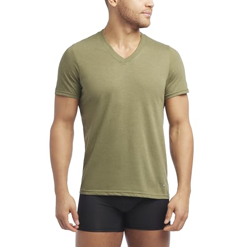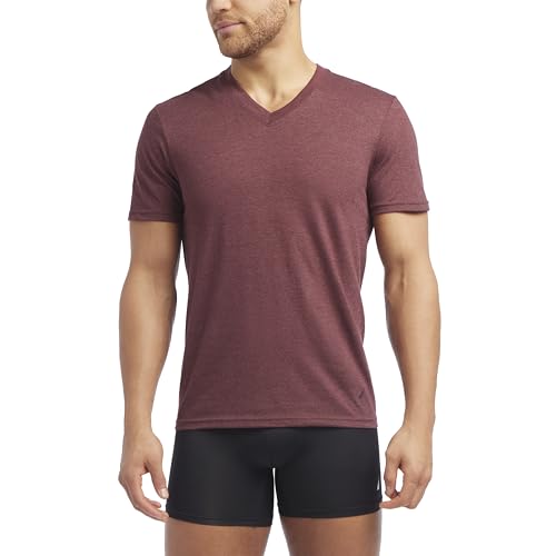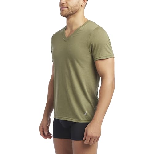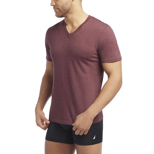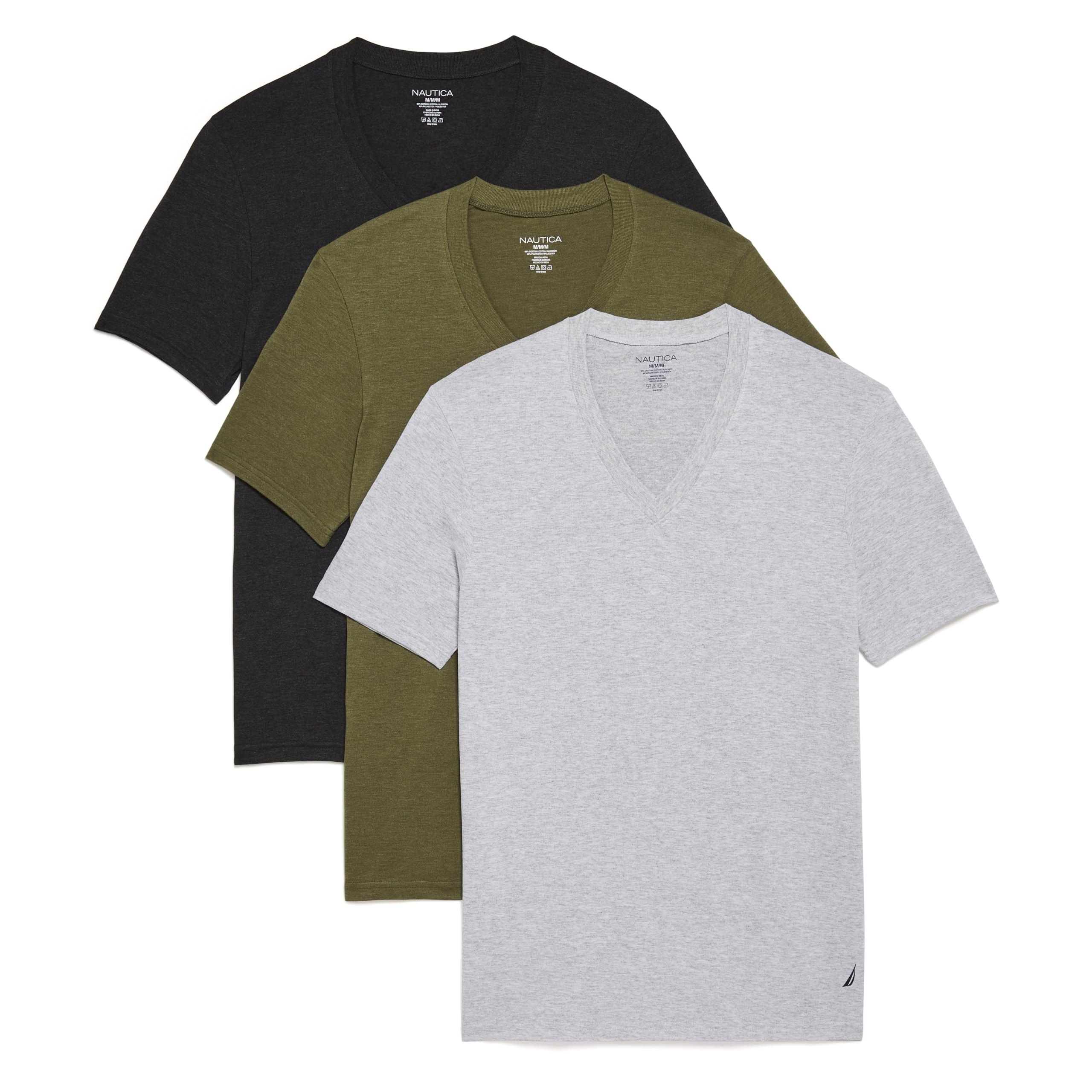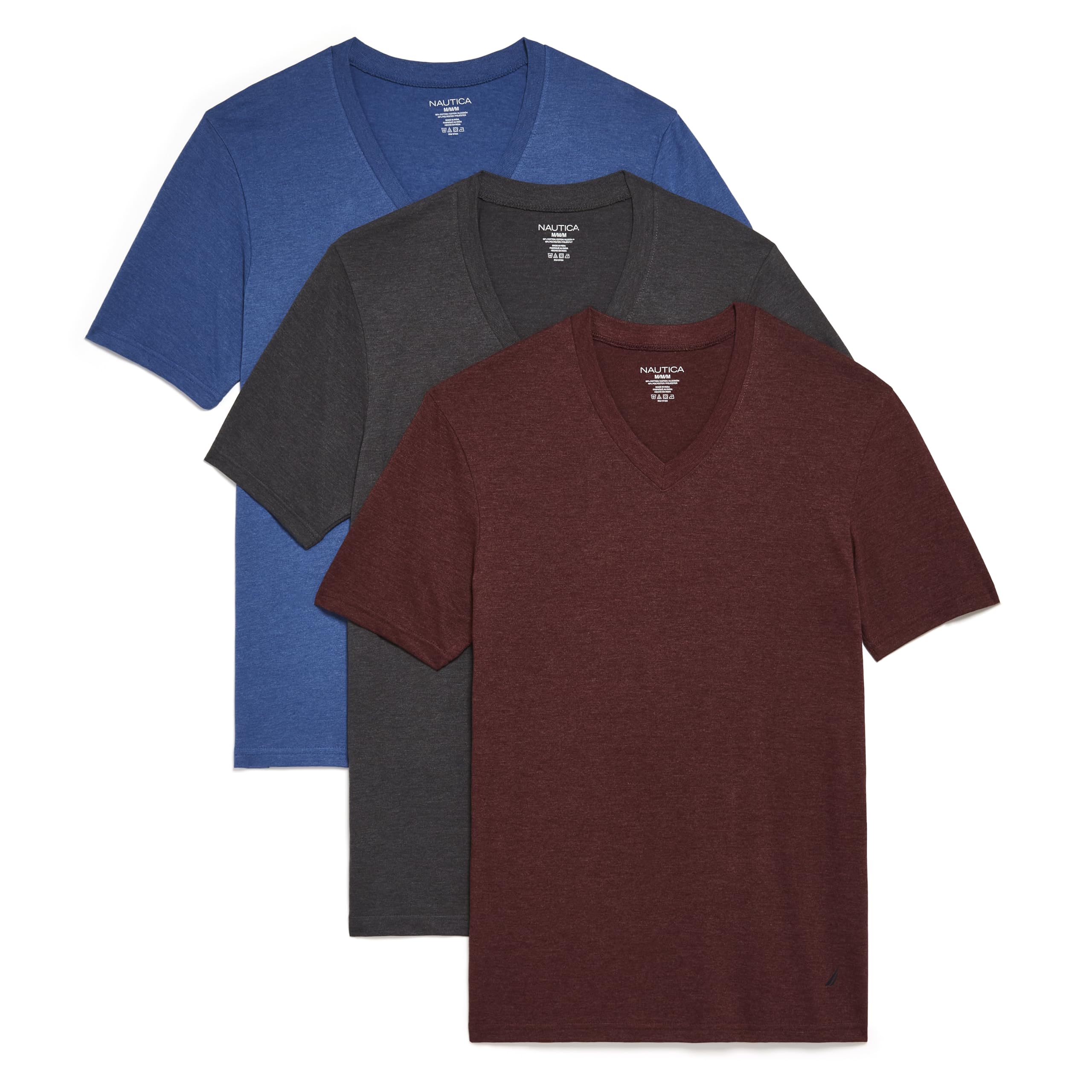A timeless silhouette from Nautica offered in a pack of 3, these classic V-Neck undershirts feature heathered fabrication and lightweight, super soft cotton/polyester construction. Always tagless for ultimate comfort, these cotton stretch t-shirts are perfectly tailored and will not bunch up under clothes. The flat ribbed collar will keep it's shape wash after wash. Short sleeve design finished with Iconic Nautica Sail logo at left hem.