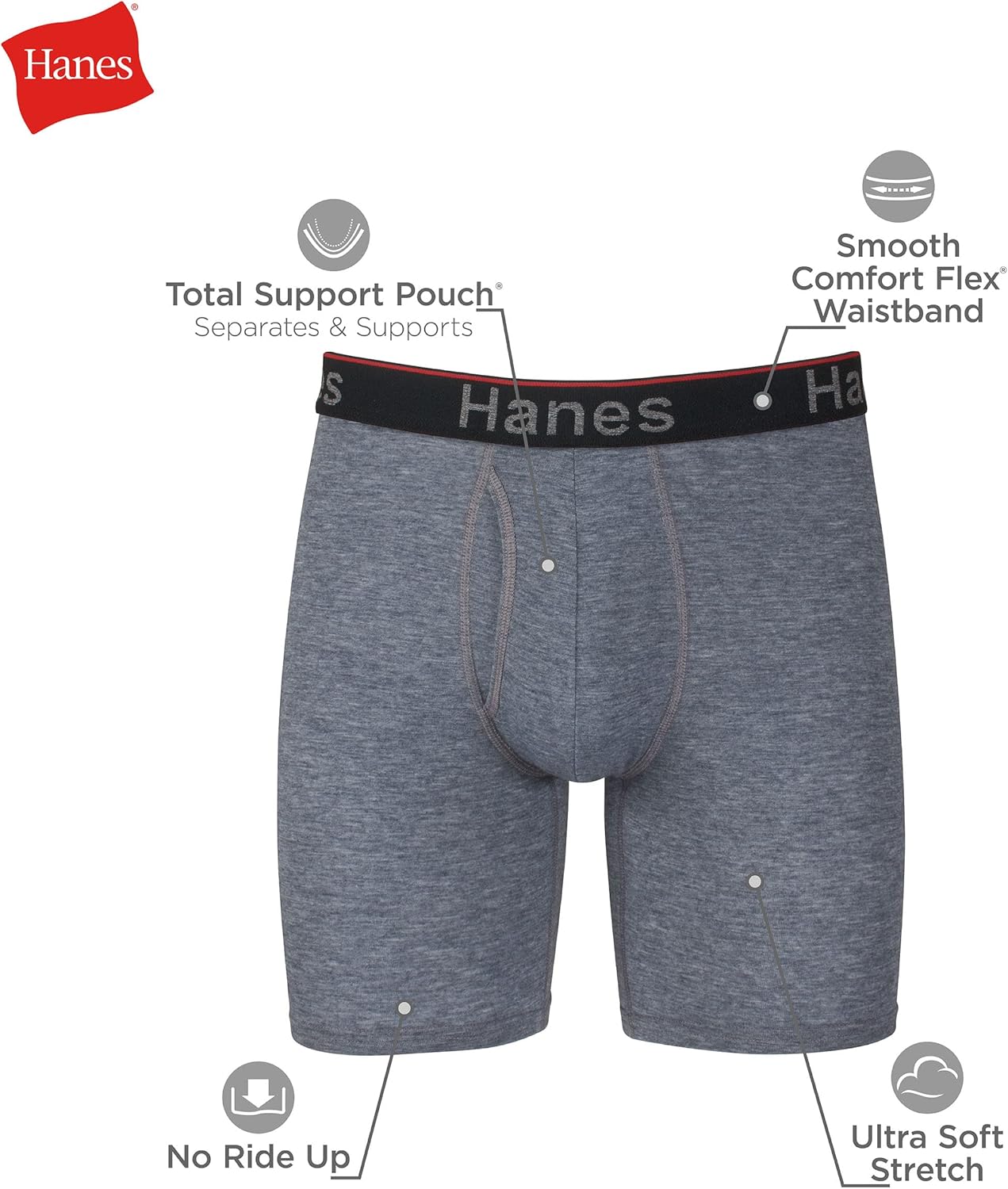 This Hanes® anti-chafing men's boxer brief underwear is made from an ultra-stretchy fabric that's amazingly soft. The stretchable Comfort Flex® waistband moves with you while the Total Support Pouch® is a mesh liner that lifts, separates, and supports - keeping everything right where it should be and helping to prevent chafing. Moisture-wicking and odor-control technology team up to keep you cool and fresh. Throw them right in the washer when they need a quick refresh. And the best part of all? These men's boxer brief underwear packs are available in sizes up to 3XL and in regular, shorter (trunk), or longer lengths.