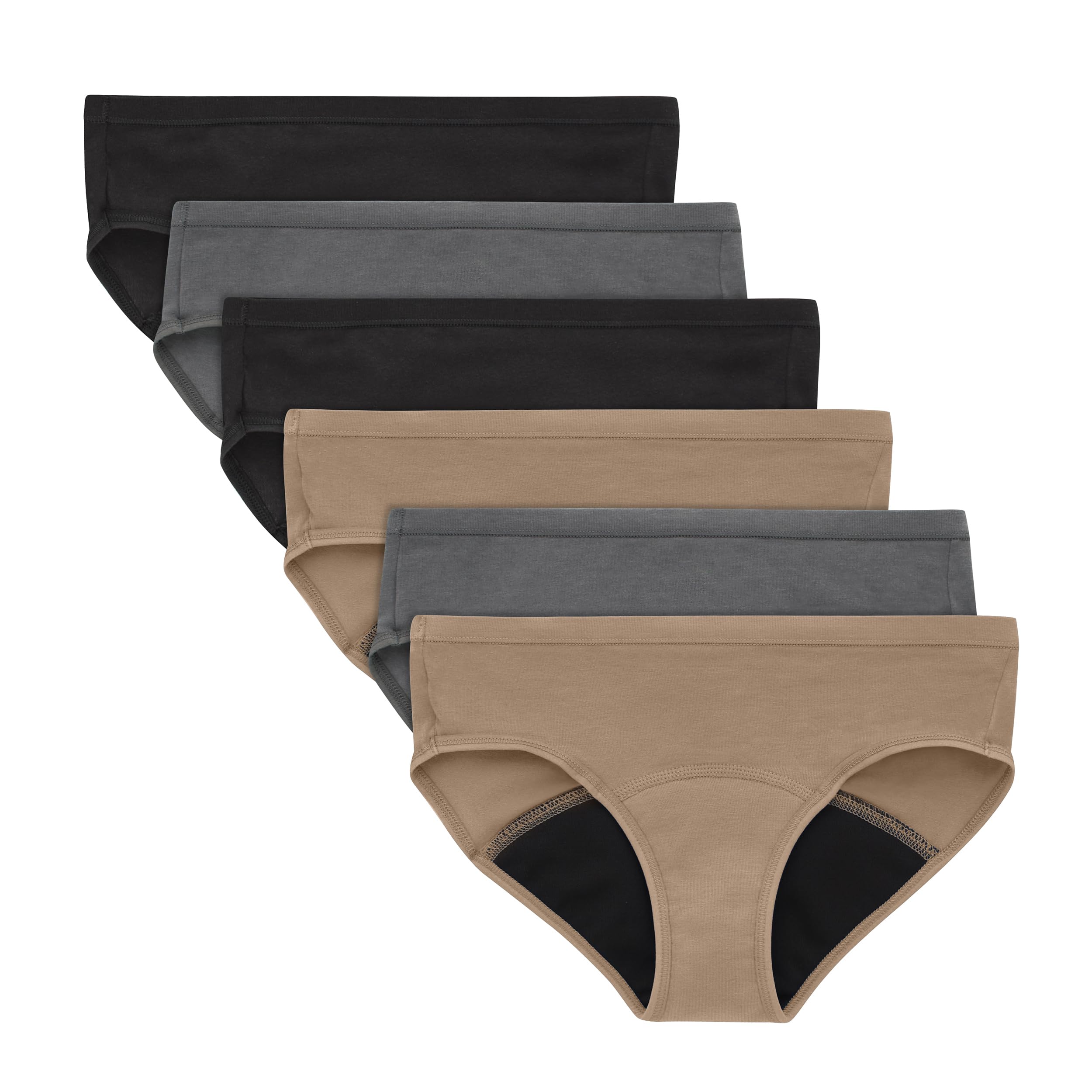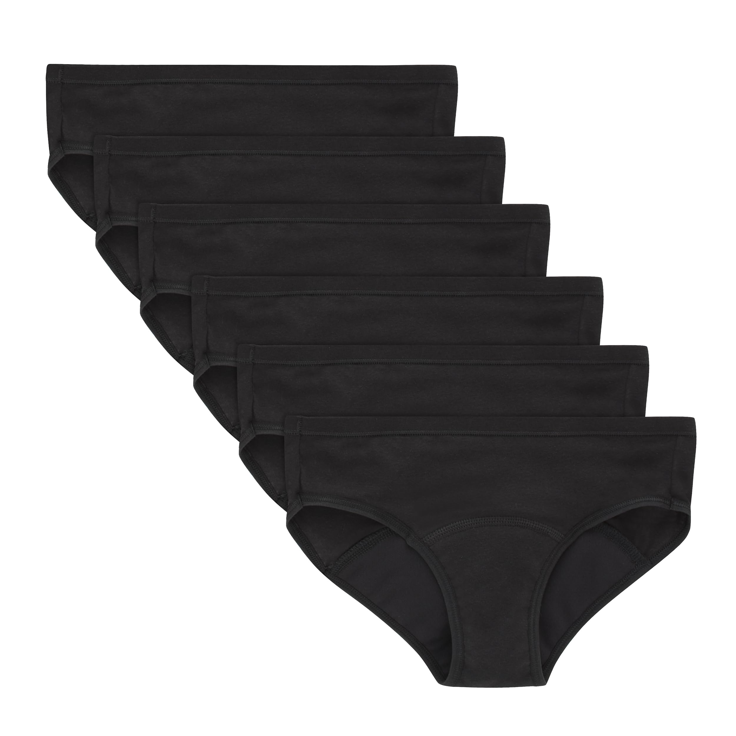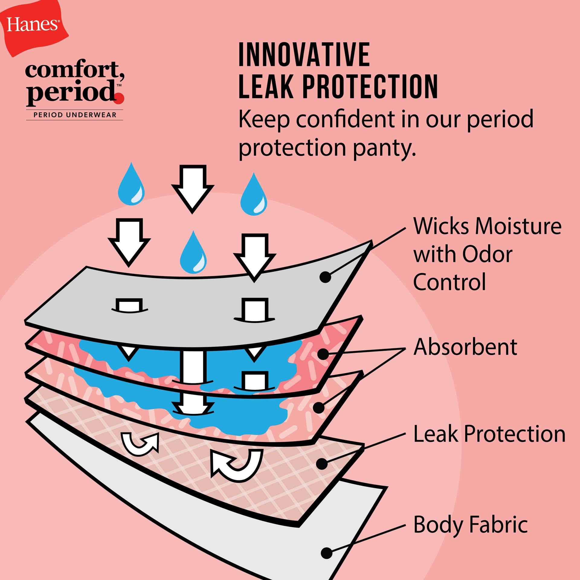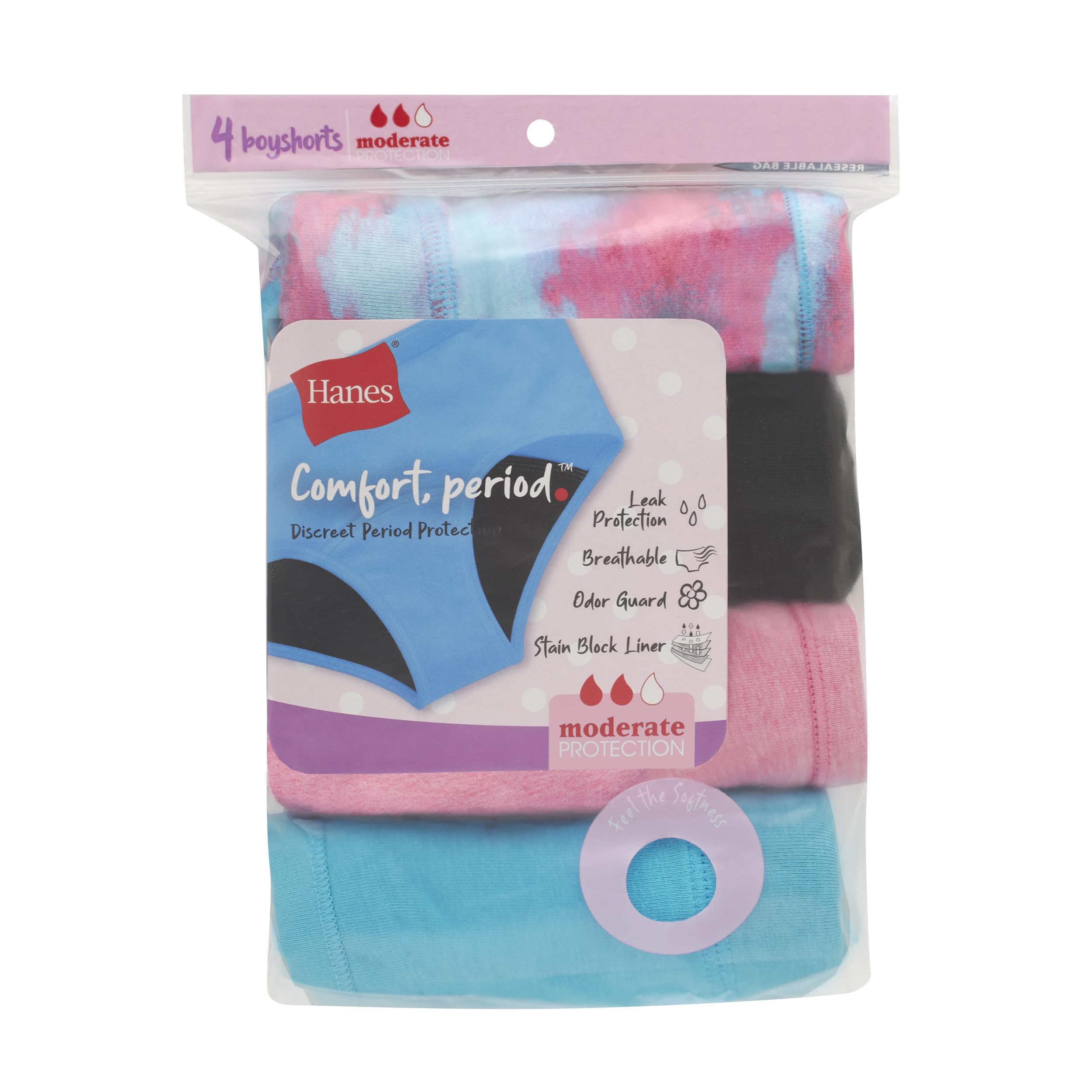 Say goodbye to bulky pads and liners with Hanes® girl’s Comfort Period.™ hipster panties. Designed for moderate protection, the breathable 5-layer liner works to eliminate odors and stains for all-day comfort. The no-ride-up style offers a smooth pinch-free waistband so she can move easily and freely. Finished with a Tagless® interior for an itch-free style she’s sure to appreciate. Stock up with this convenient Hanes® 4-pack in an array of colorful solids and prints.