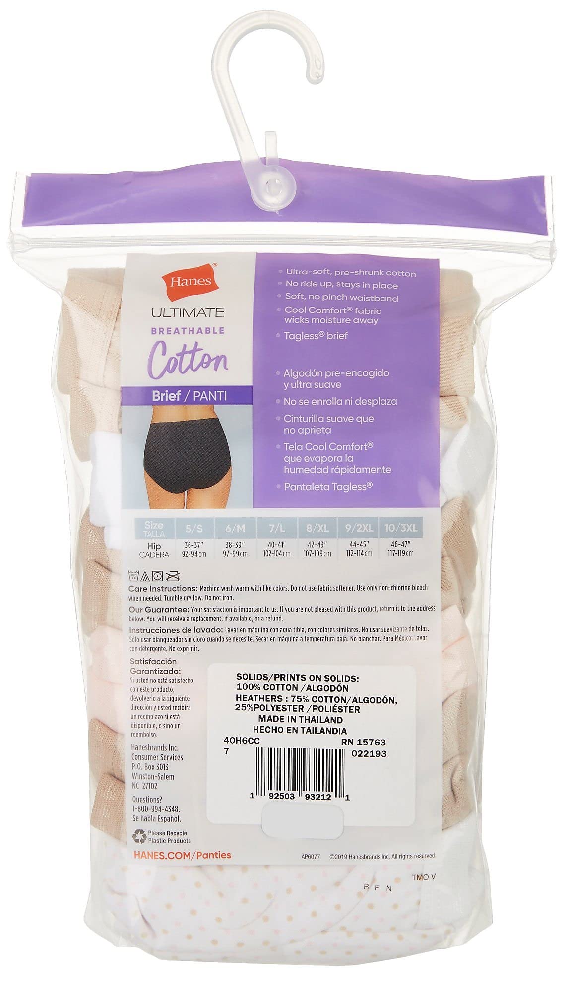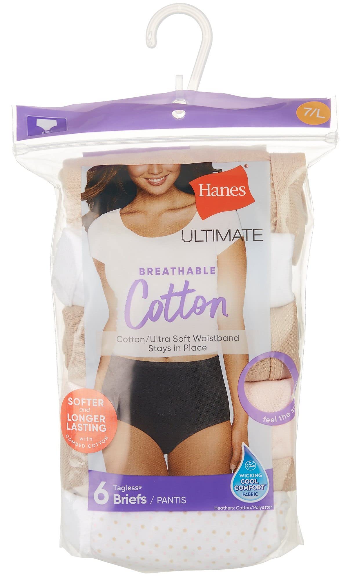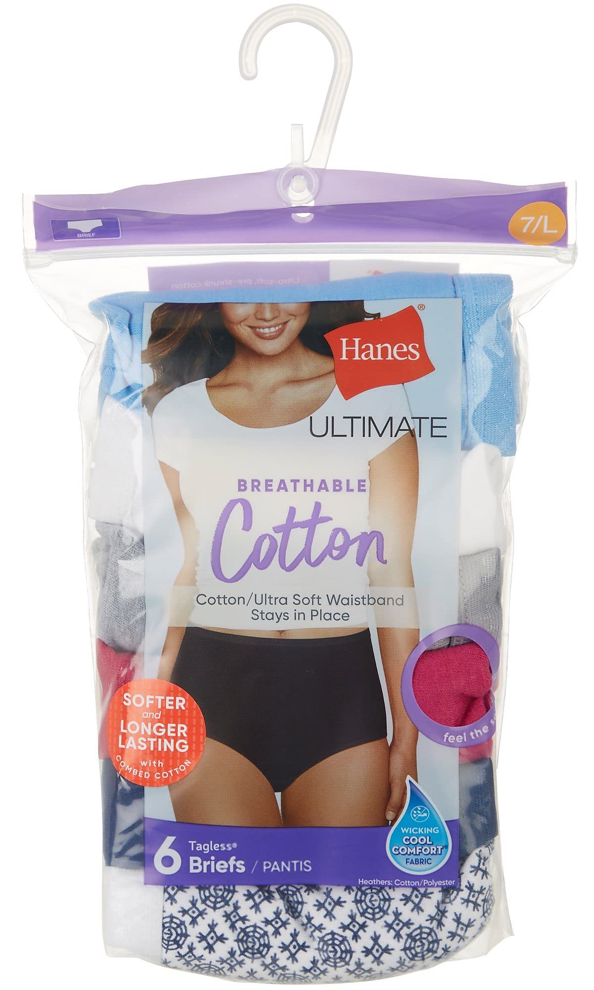 We love these women's classic briefs, made from soft, lightweight, preshrunk cotton with Cool Comfort® fabric that wicks away moisture to keep you cool and comfortable. They're designed with a comfortable waistband that prevents your women's panties from pinching and binding and banded legs for no-ride-up ease. They also offer a higher rise and excellent seat coverage. This brief underwear 6-pack is available in multiple women's underwear size and color options, so you're sure to find your favorites.