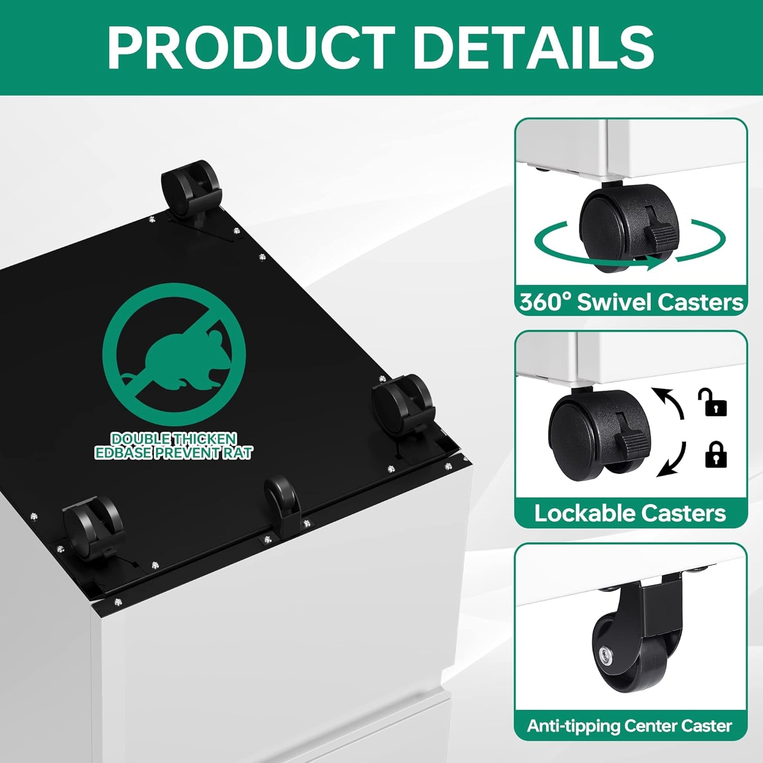 〖Detail Design〗All drawers interlocking mechanism design,only one drawer can be opened at a time, it will prevent tipping;High-quality ball slides make it easier and quieter to use, lockable wheels + 1 universal wheel to prevent tipping.