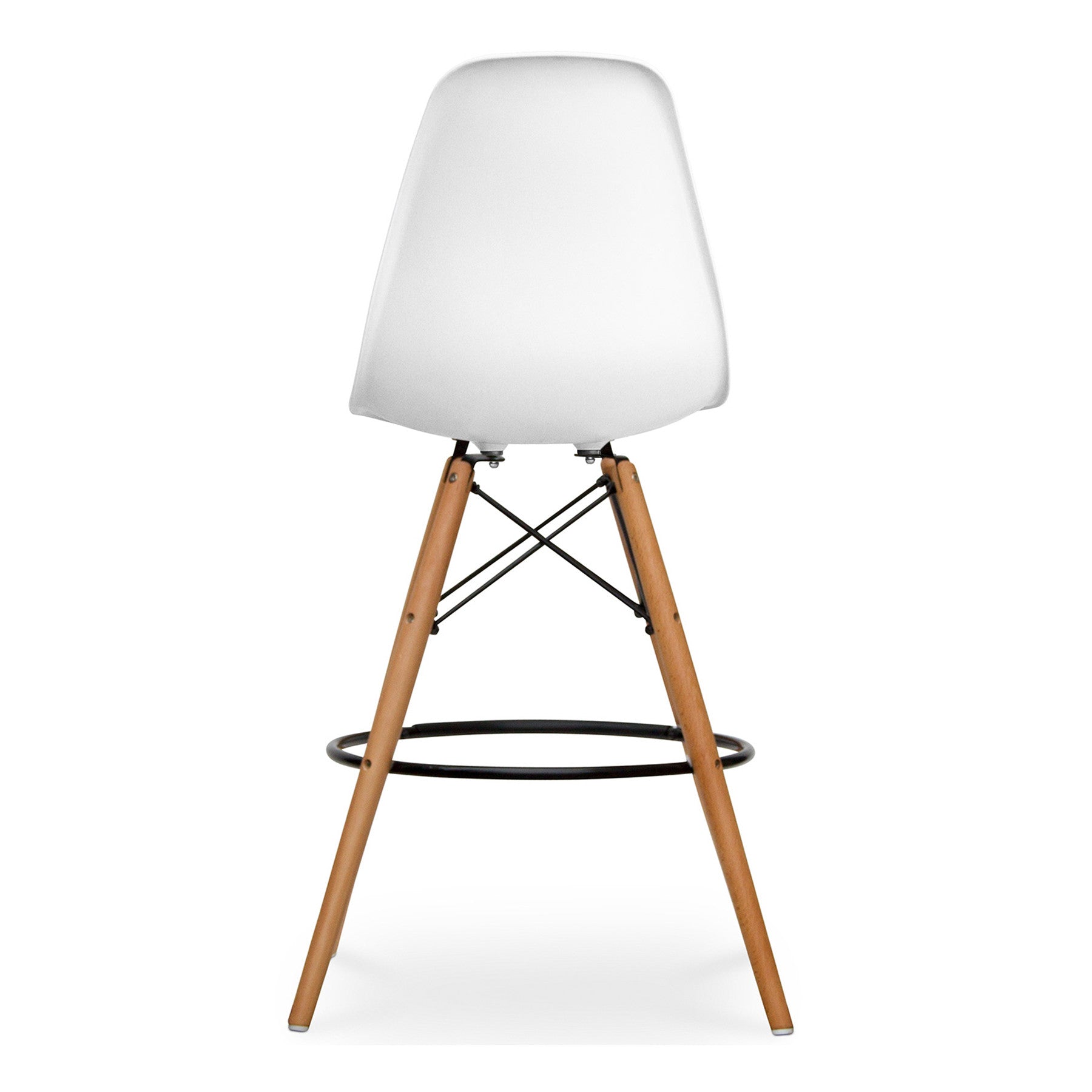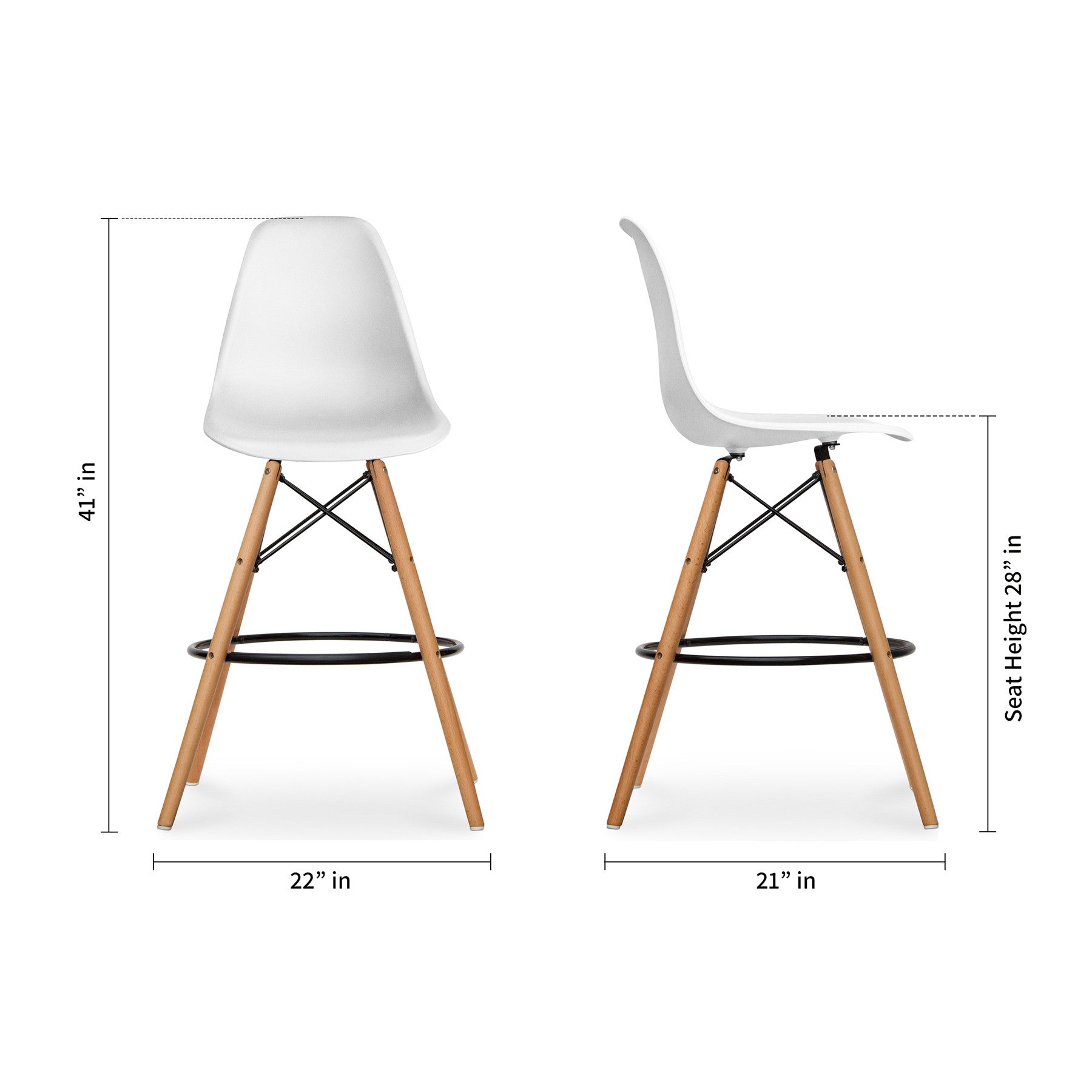 This 28-inch white and brown heavy duty plastic and solid wood counter height bar chair will be the perfect way to add some cool design and utility to your space similar to what you find in your favorite cafes or pubs. The white plastic seat of this stool is a nice contrast to the high quality, brown solid wood of the base. Designed with a footrest for comfort and convenience. 41-inch H x 22-inch W x 21-inch D Dimensions: 41(H) x 22(W) x 21(D)