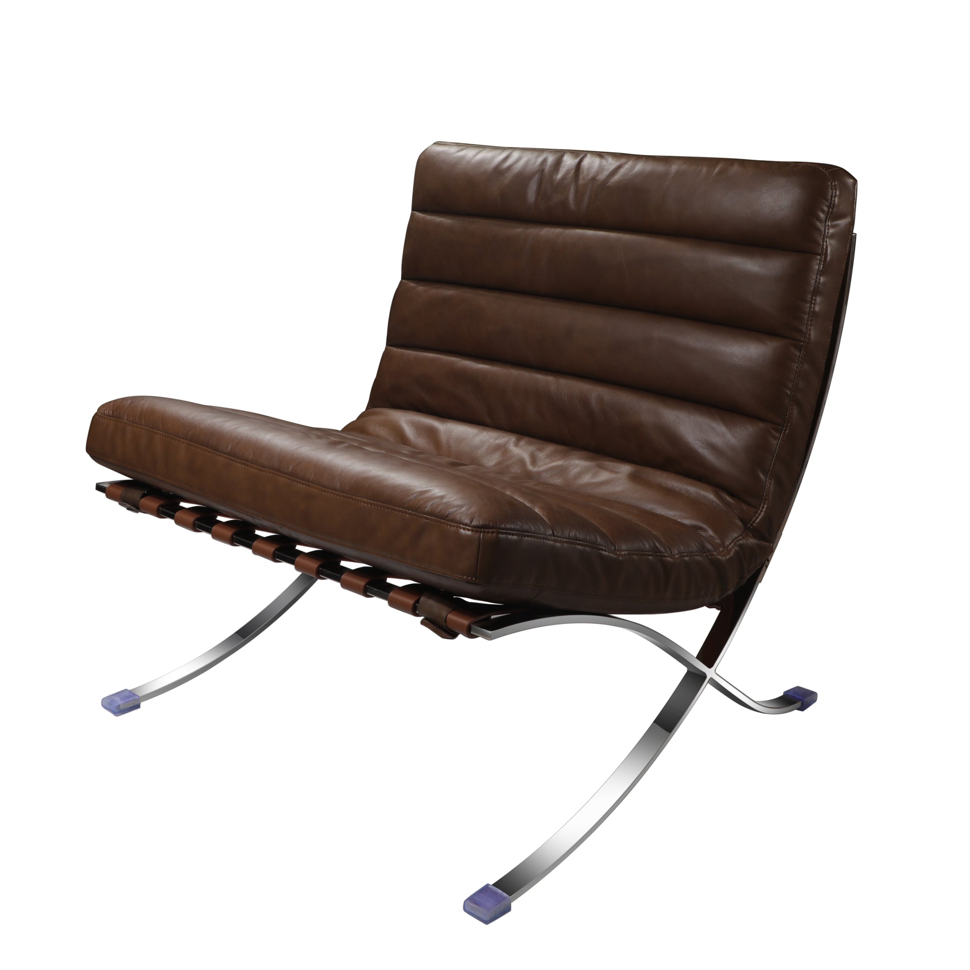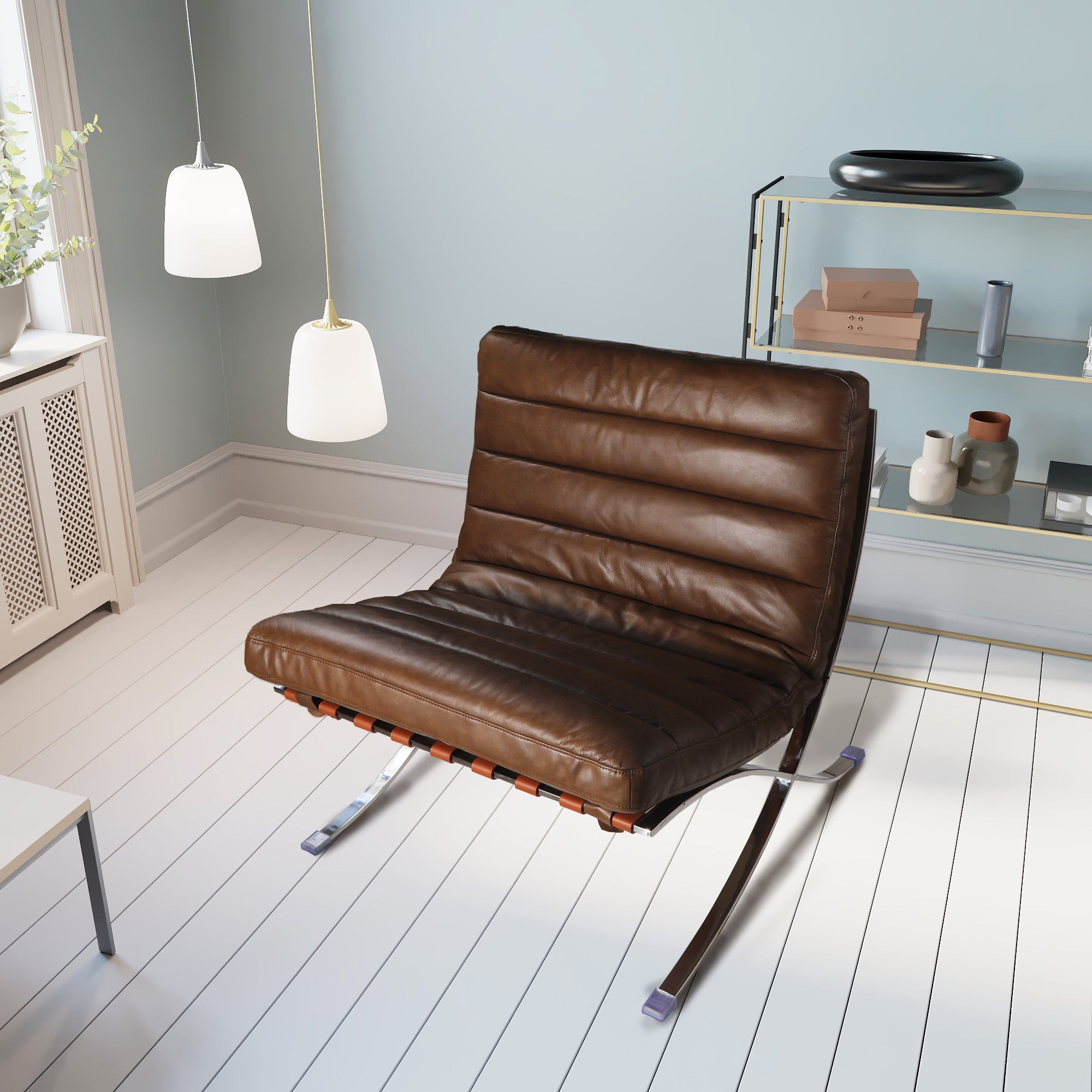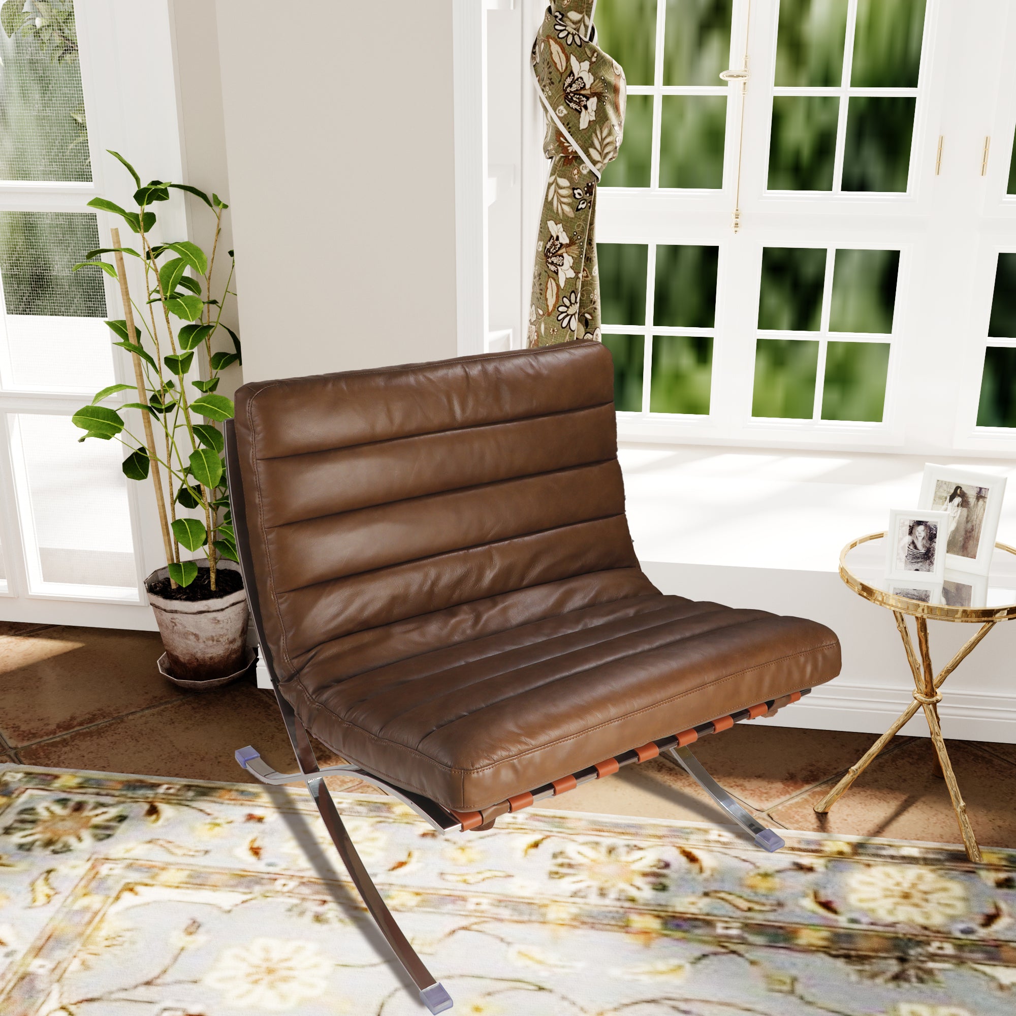 This 29-inch brown and silver tufted leather and upholstered folding lounge chair is the perfect decorative yet functional accessory for your home. This stylish chair is upholstered with genuine top grain leather and features horizontal channel tufting. The sturdy frame and x style legs are crafted from high quality stainless steel. This executive style accent chair adds a pop of modern color and designer style to your living room, bedroom, lounge, office, or lobby. 28.00-inch h x 29.30-inch w x 29.30-inch d. Dimensions: 28(H) x 29.3(W) x 29.3(D)