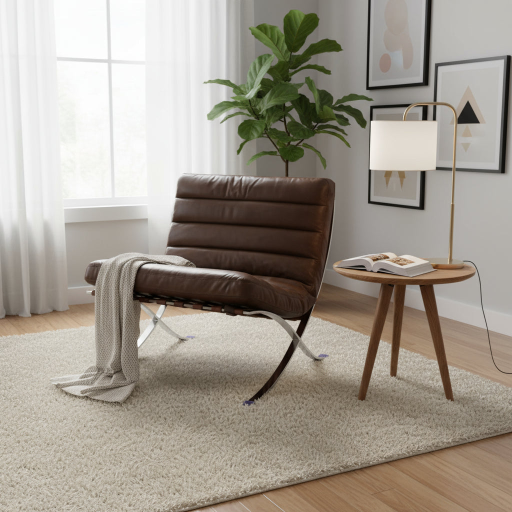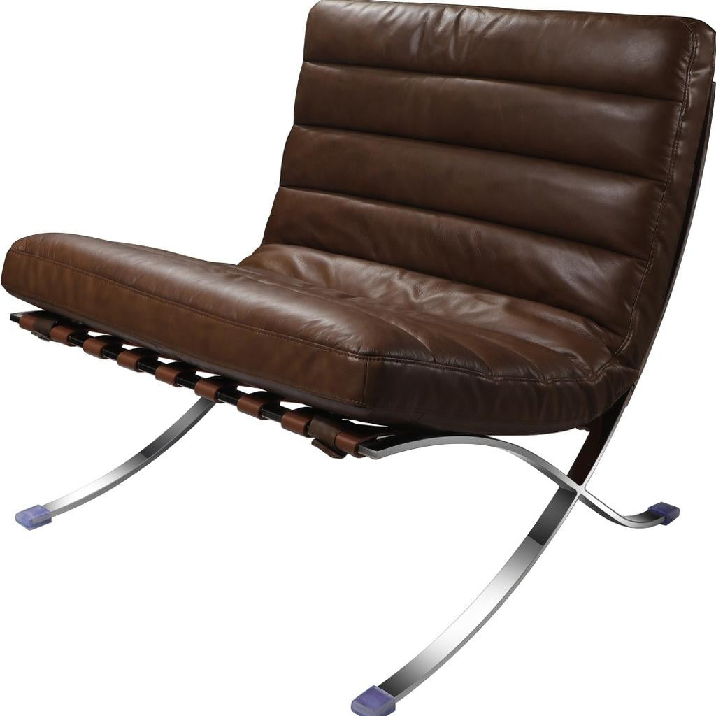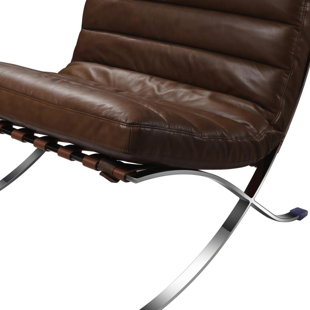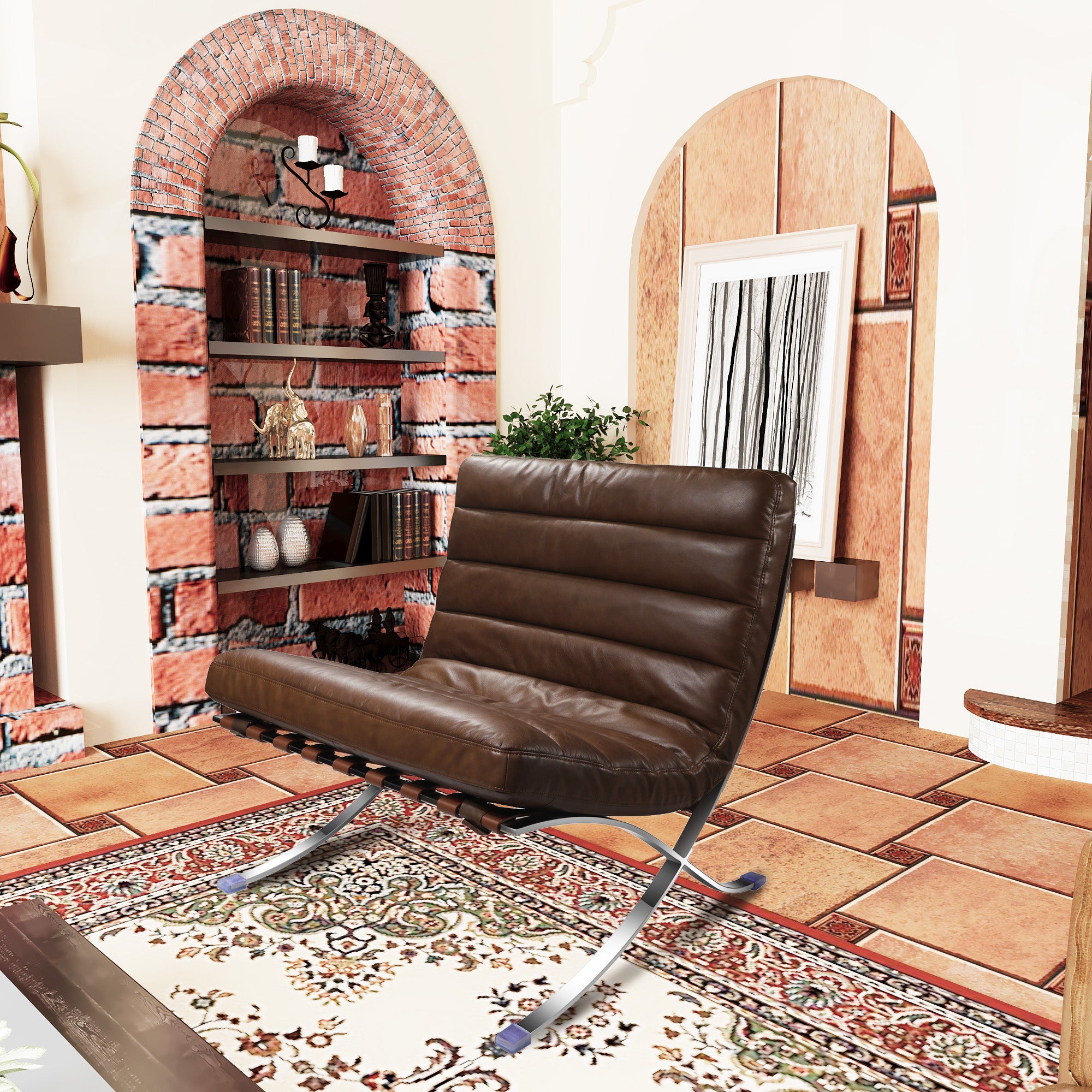 This 29-inch brown and silver tufted leather and upholstered folding lounge chair is the perfect decorative yet functional accessory for your home. This stylish chair is upholstered with genuine top grain leather and features horizontal channel tufting. The sturdy frame and x style legs are crafted from high quality stainless steel. This executive style accent chair adds a pop of modern color and designer style to your living room, bedroom, lounge, office, or lobby. 28.00-inch h x 29.30-inch w x 29.30-inch d. Dimensions: 28(H) x 29.3(W) x 29.3(D)