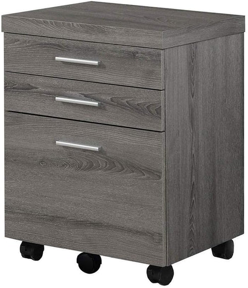 Need a little extra space in your home office? Opt for this practical 3-drawer file cabinet on casters (2 locking, 3 non-locking) accented with beautiful modern silver colored handles on smooth metal glides for easy storage of letters, documents, and legal sized folders. This model is finished in a dark taupe wood look color on all sides so that you can match it with any identical desk (sold separately).