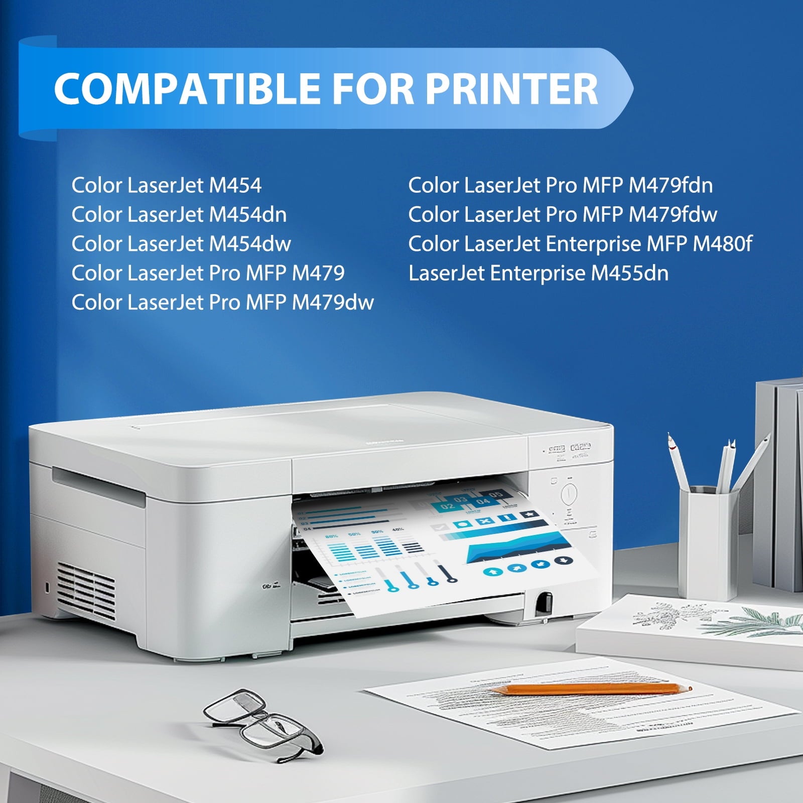 COMPATIBLE MODEL: 414A 414X W2020A W2021A W2022A W2023A PACKAGE INCLUDING: 2-Pack W2020A BLACK Toner Cartridge 1-Pack W2021A CYAN Toner Cartridge 1-Pack W2022A YELLOW Toner Cartridge 1-Pack W2023A MAGENTA Toner Cartridge HIGH PAGE YIELD: Up to 2,400 pages per 414A W2020A Black toner, up to 2,100 pages per 414A W2021A W2022A W2023A Color Toner COMPATIBLE FOR PRINTER MODEL: Color LaserJet Pro Series MFP M479fdw / M479fdn / M479dw / M479 Color LaserJet Series M454dw / M454dn / M454 Color LaserJet Enterprise Series M455dn / MFP M480f INK COLOR:Black, Cyan, Magenta, Yellow PACK OF ITEMS:5-Pack Our products are certified with ISO 9001 and ISO 14001 Due to using the oem old chips, the printer will prompt a message "Cartridge Low", which does not affect normal printing. Please click "Snooze" and choose "2 Months" to close prompt. The cartridge's life ends when the printout text fades