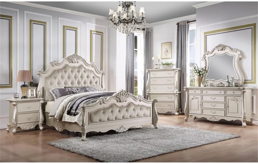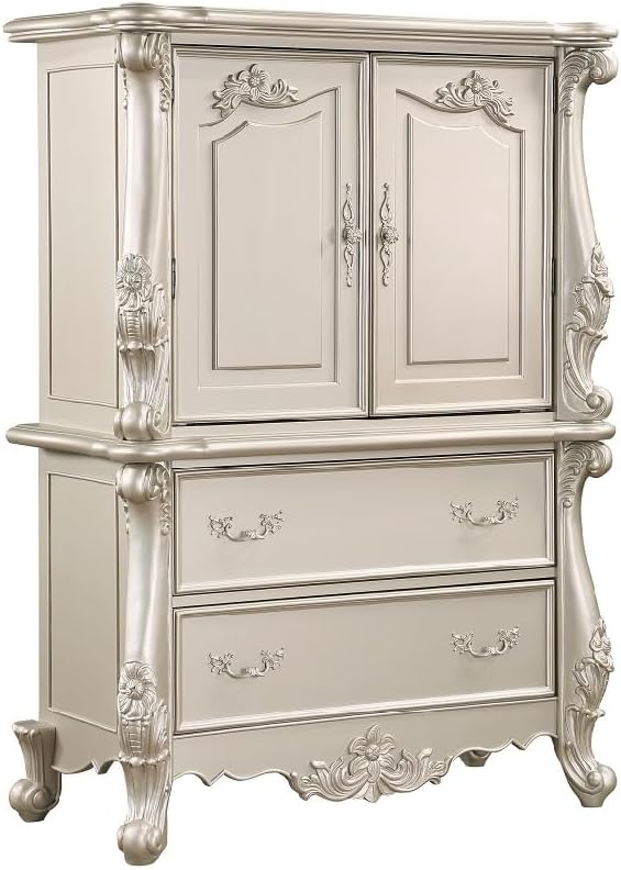 Create the bedroom of your dreams with our Bently chest, which includes a magnificent frame that is adorned with stunning floral and scrolled details. This chest features five ample drawers that will make it convenient for you to keep a clutter-free bedroom. The glides ensure that the drawers open and close smoothly. The beautiful, scalloped edges add refinement and visual interest, and the scroll legs are beautiful and sturdy. The champagne finish is rich and sophisticated.