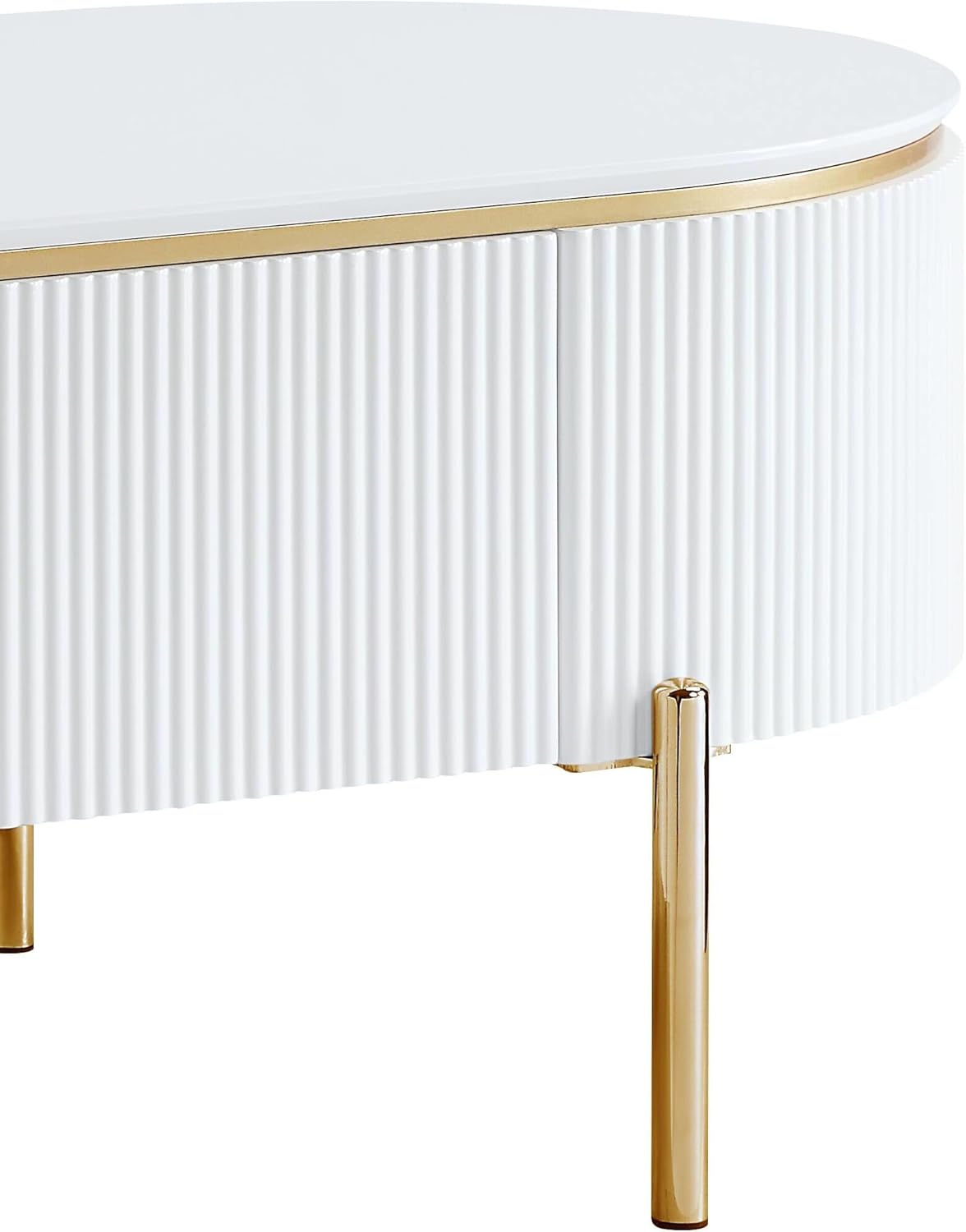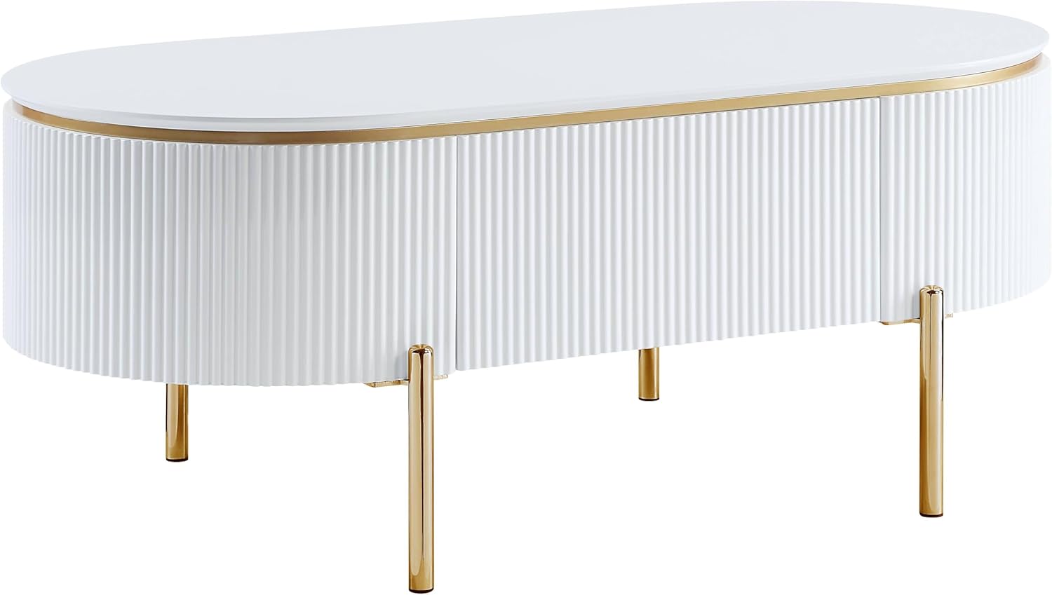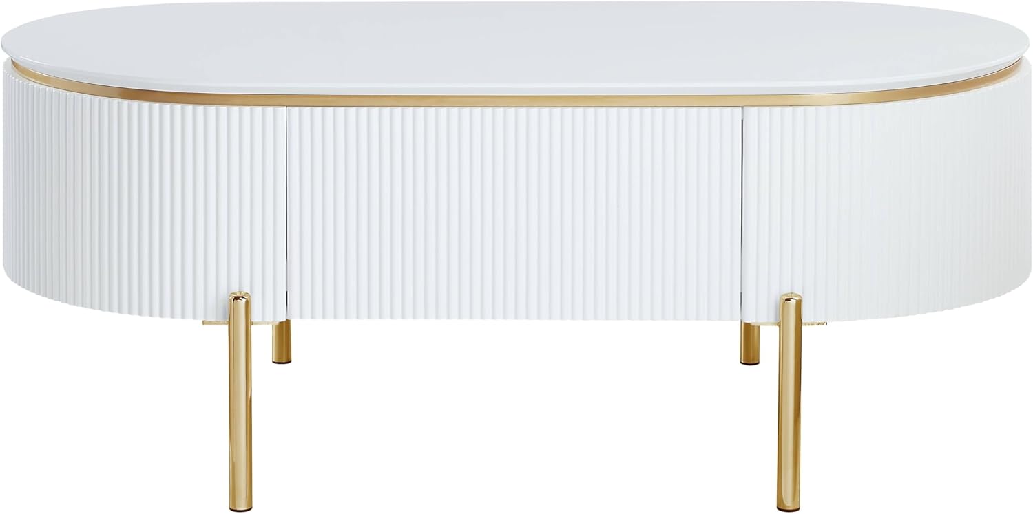 Glossy white and bright gold create a chic pairing on a modern glam storage coffee table. The oval stadium-shaped table creates a unified look in your sitting area, while offering interior storage that helps keep your space tidy and looking its best. The sides of the table are fluted, offering impeccable texture and dimensionality. Slim gold finish legs complete the look with a sense of compelling delicacy.