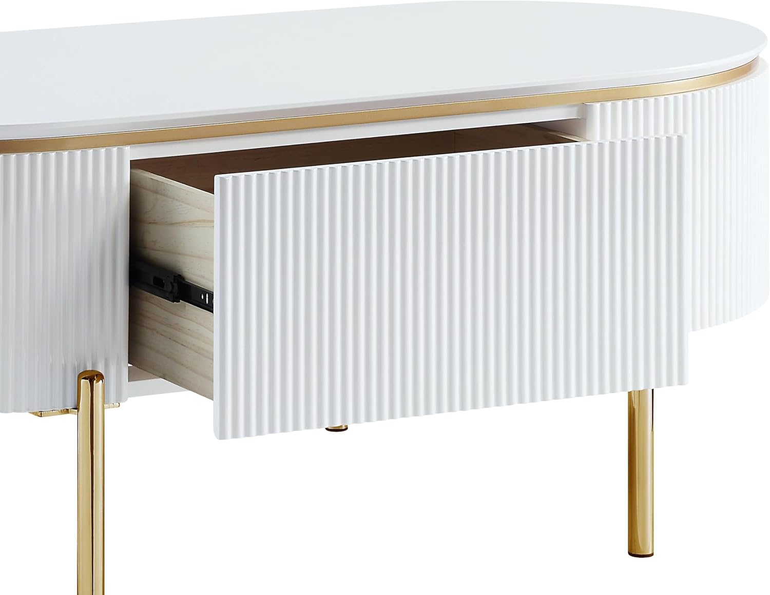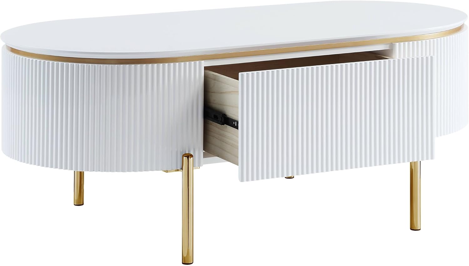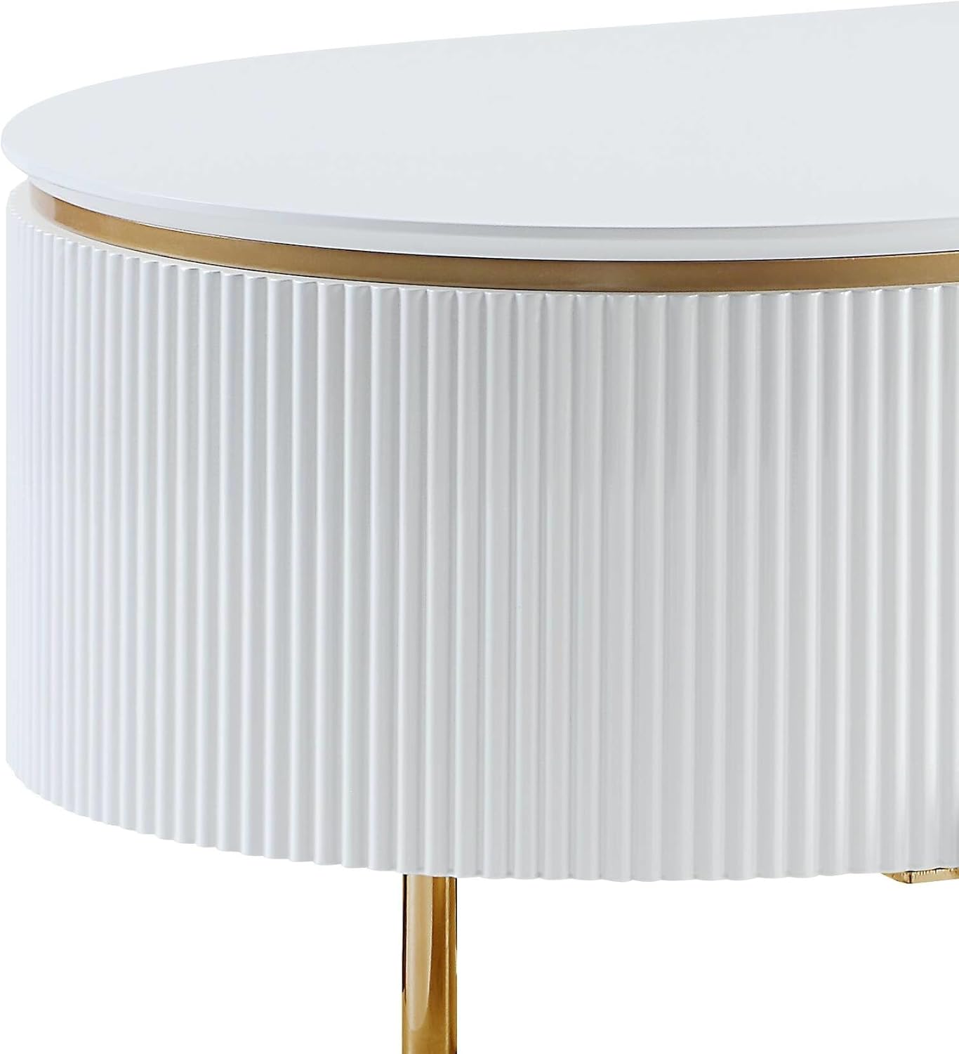 Glossy white and bright gold create a chic pairing on a modern glam storage coffee table. The oval stadium-shaped table creates a unified look in your sitting area, while offering interior storage that helps keep your space tidy and looking its best. The sides of the table are fluted, offering impeccable texture and dimensionality. Slim gold finish legs complete the look with a sense of compelling delicacy.
