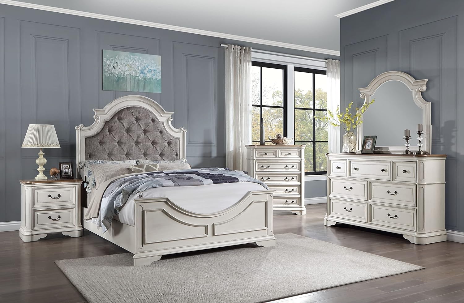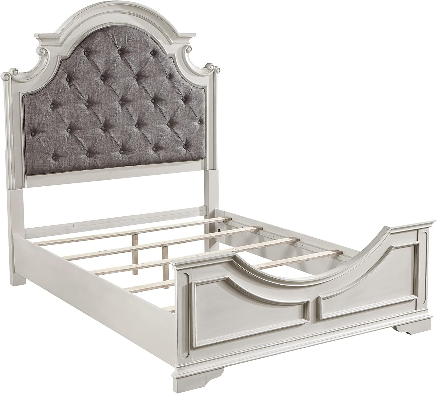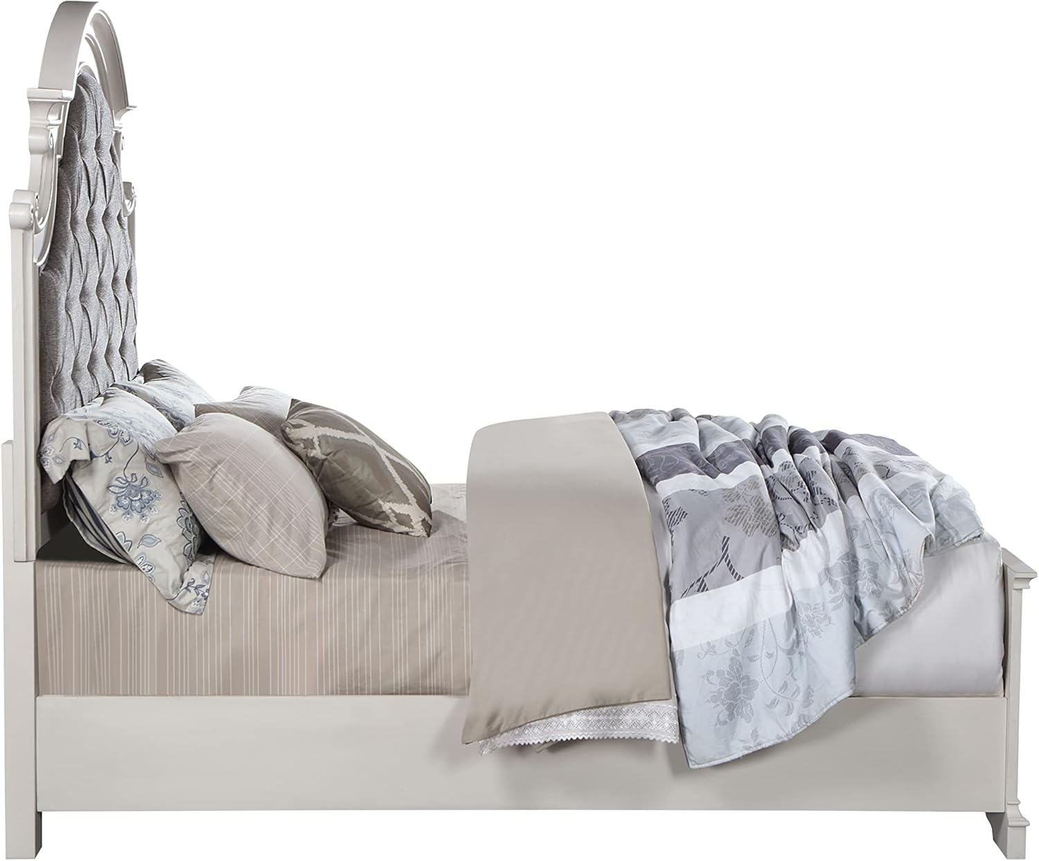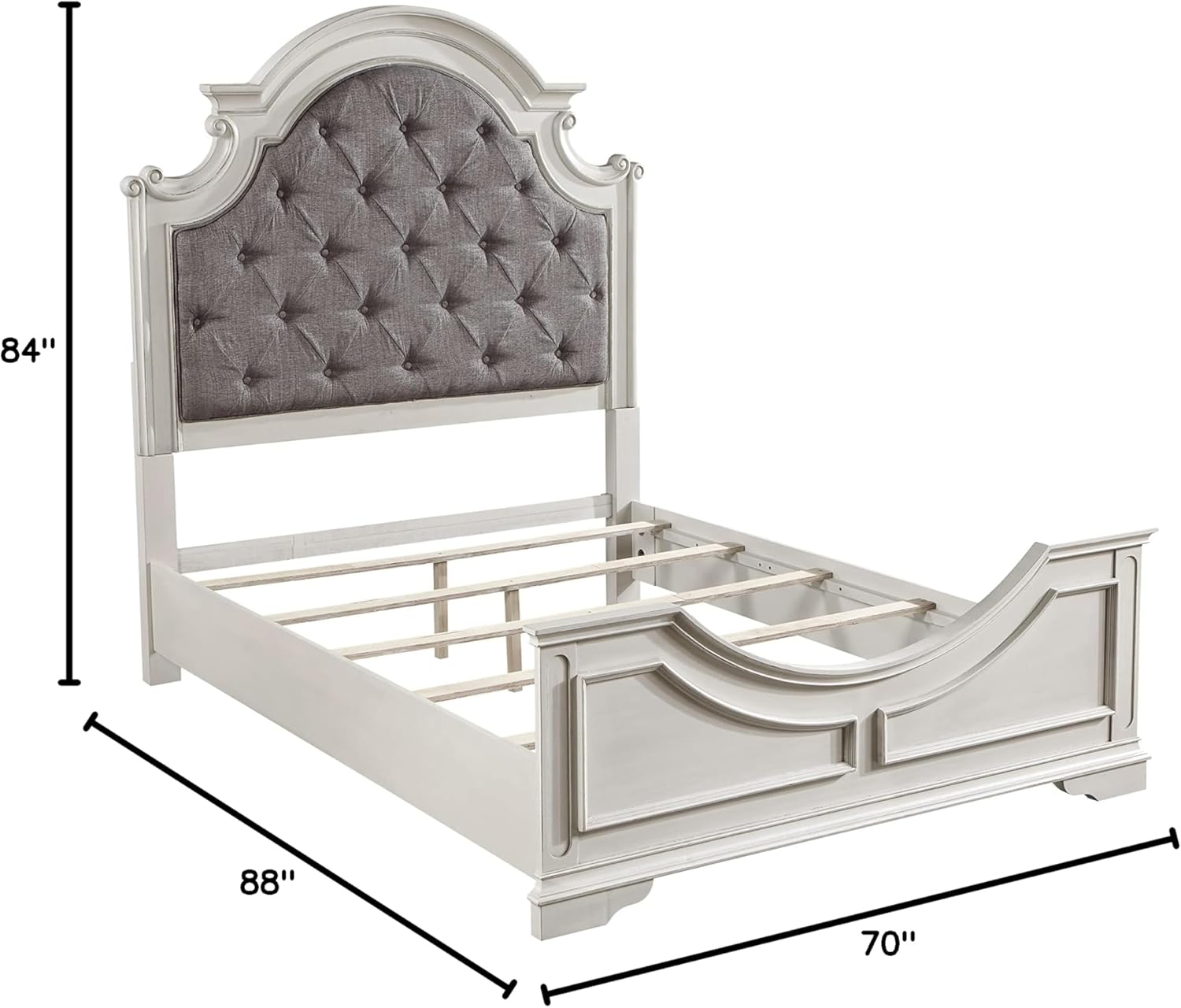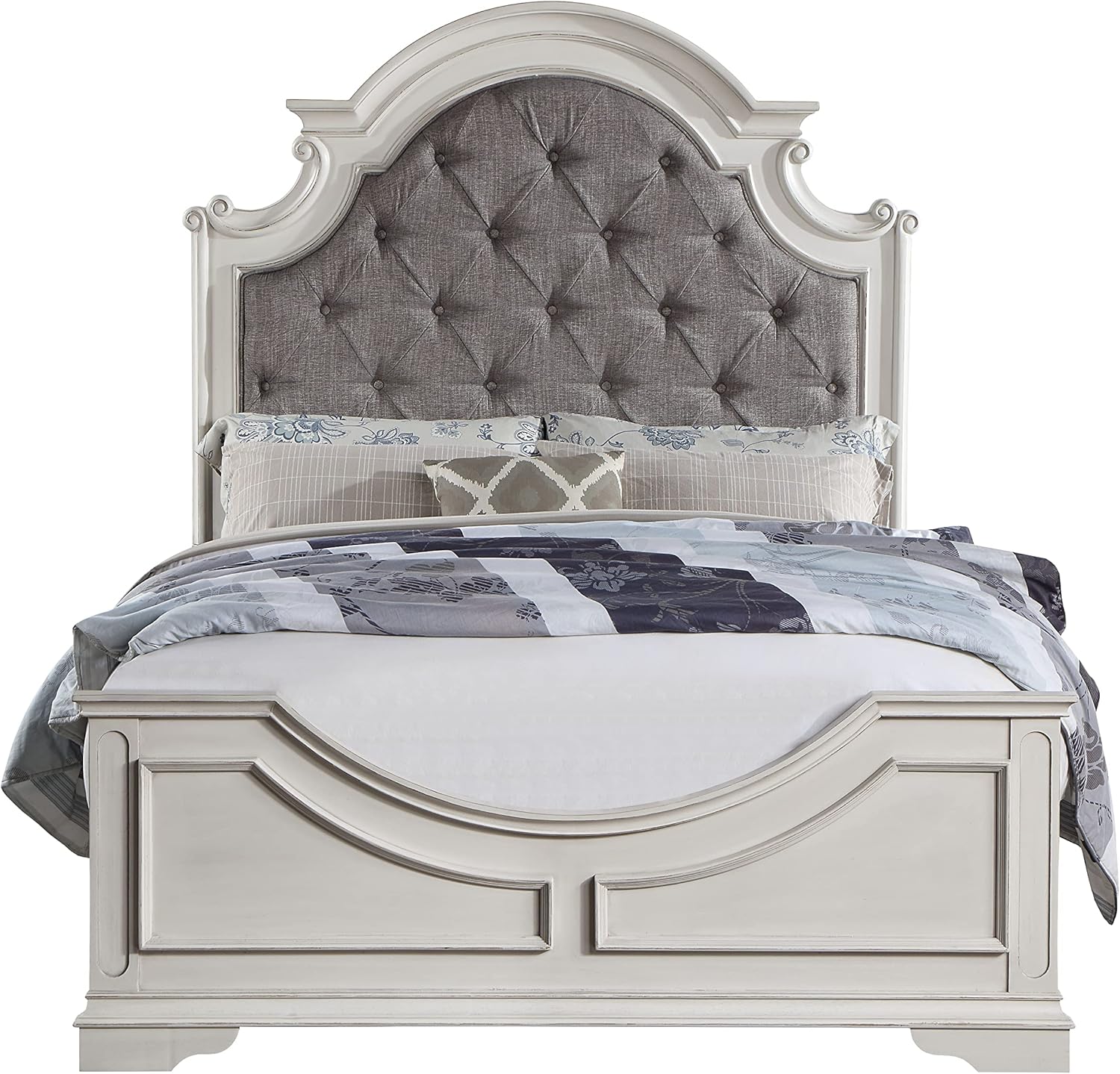 | Special Feature | Fabric color: Grey, Finish color: Antique White, Materials: Wood, Composite Wood, Upholstery, Overall dimensions: 88"L x 84"W x 70"H, Set includes: One (1) eastern king bed See more |