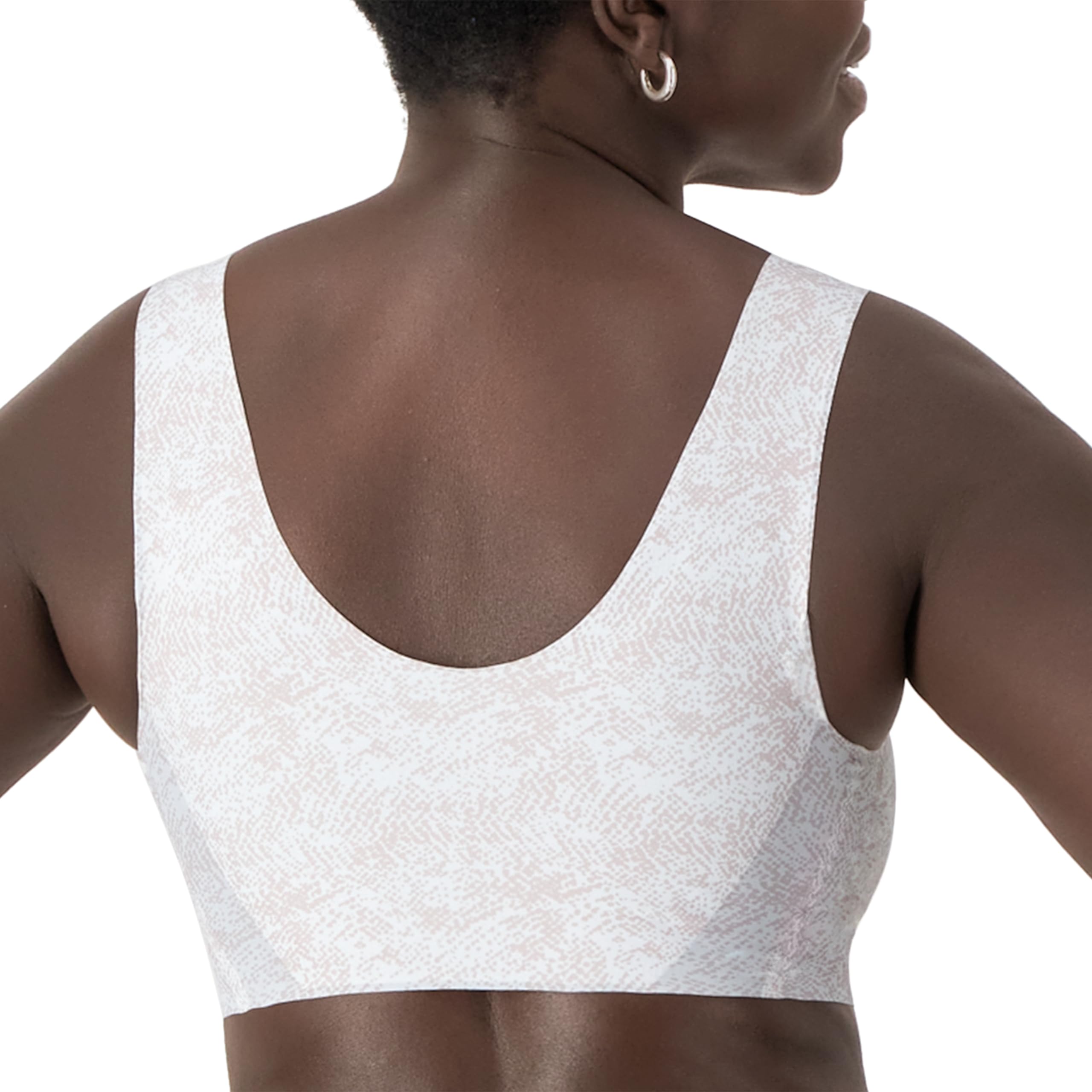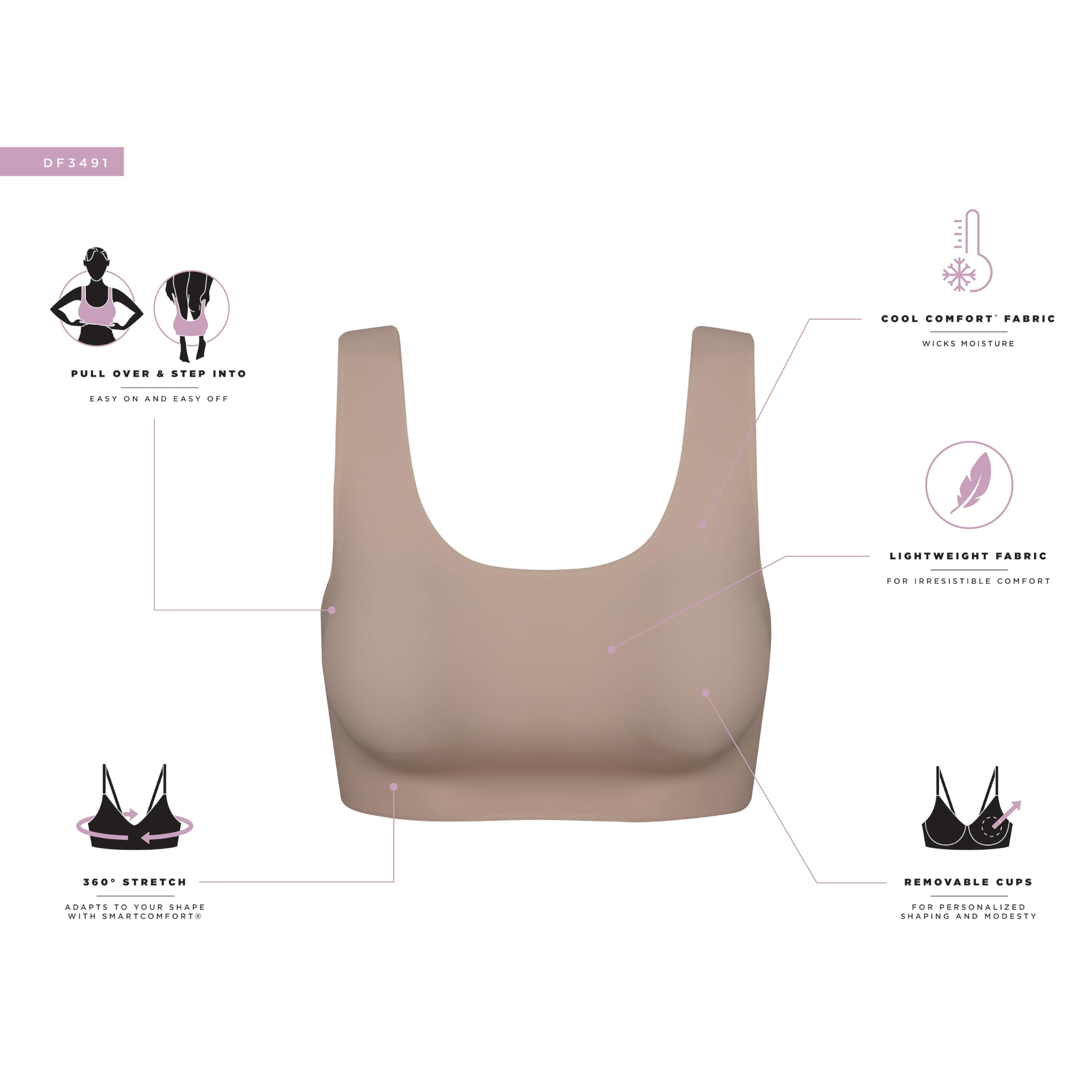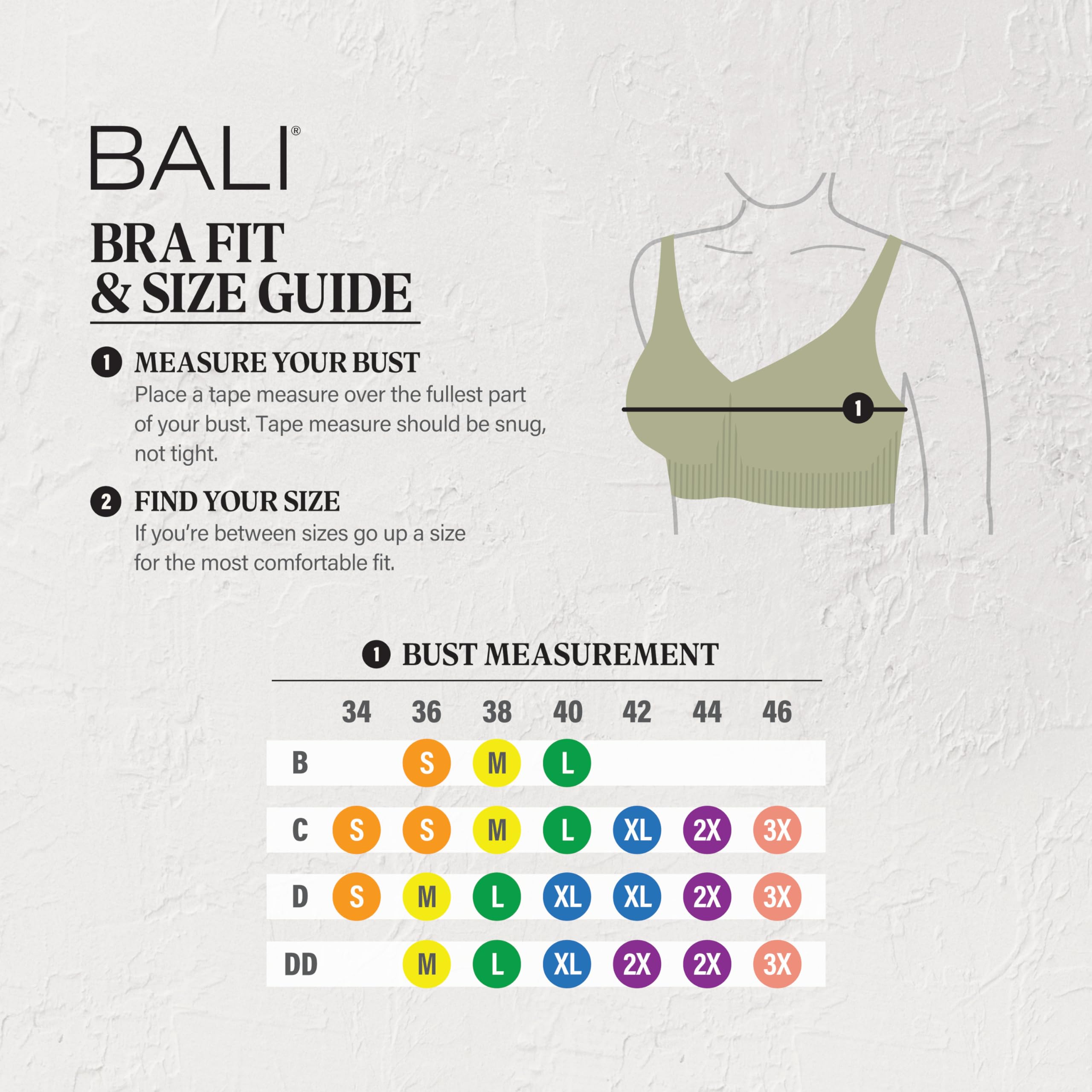 If smooth and sleek describe what you're looking for, you've found it in the Bali® Comfort Revolution® EasyLite® wirefree bra. Soft and lightweight, this must-have t-shirt bra features moisture-wicking Cool Comfort® fabric - keeping you extra comfortable. This pullover style is made with 360-degree stretch fabric without hardware or seams, just fused, flat edges for a sleek look under clothes. Two-ply cups with removable foam inserts provide shaping and modesty. You’ll especially appreciate the back smoothing with targeted support zones and the no-slip Comfort-U® design that keeps wide straps in place for a worry-free fit. The perfect lounge bra for all-day comfort and shaping? We like to think so.