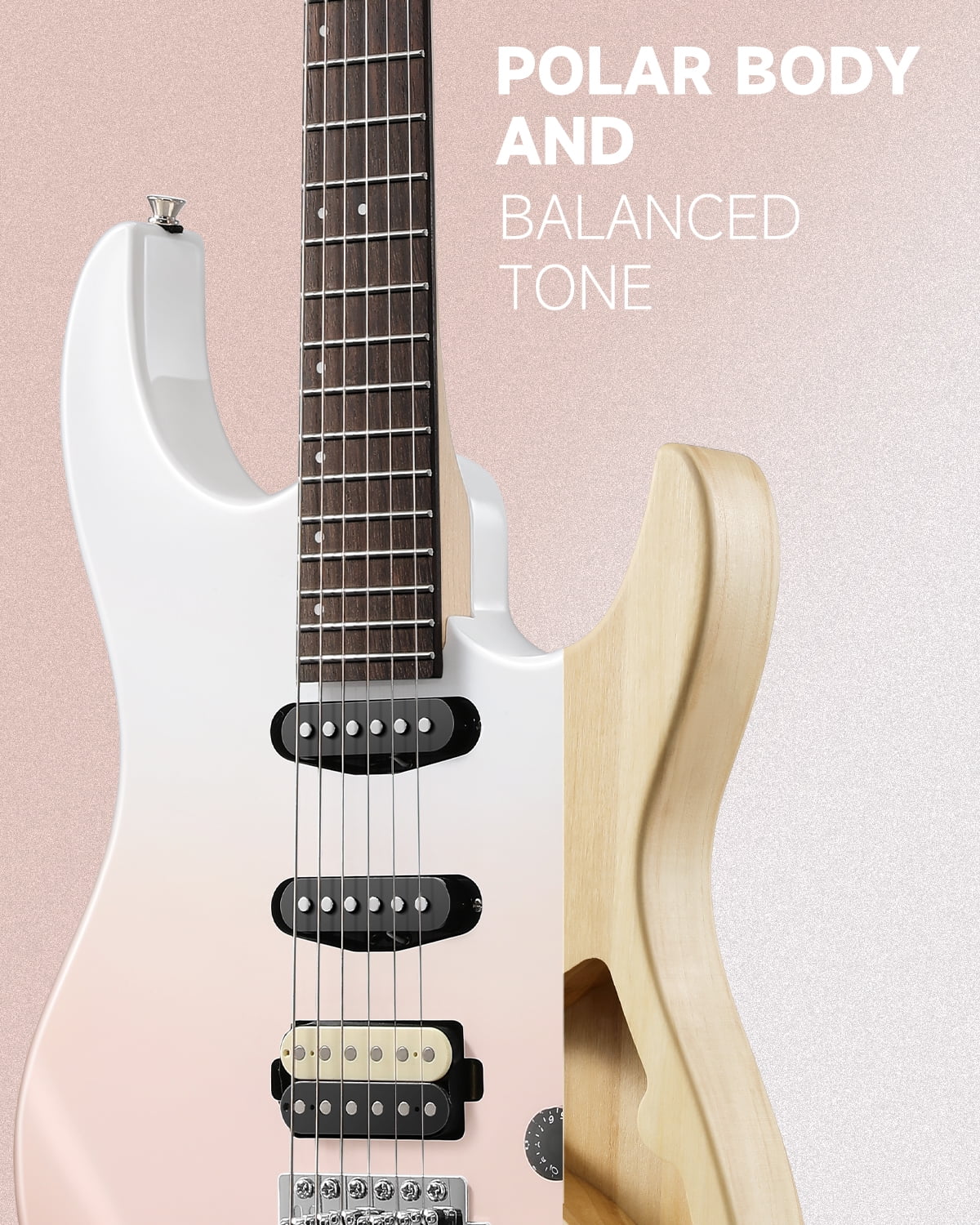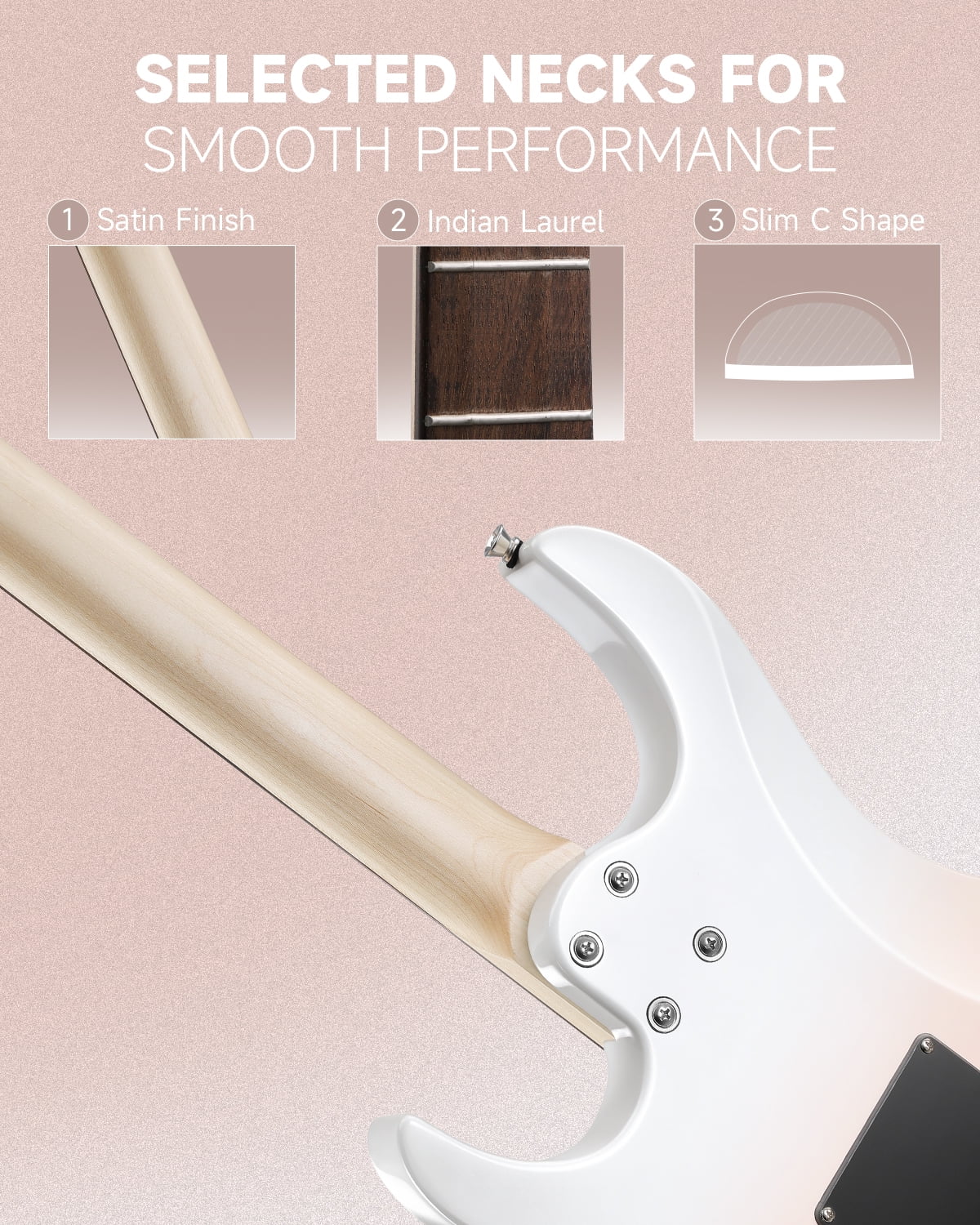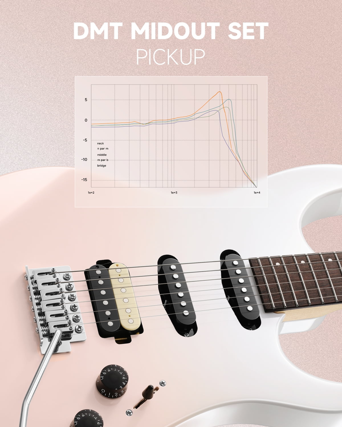The DMT-66 electric guitar combines excellent performance with beginner-friendly features. Its DMT Midout Set pickups provide clear, rich tones, and the HSS configuration ensures versatile sound options. The ultra-thin C-shaped neck with a satin finish offers comfort and reduces hand fatigue. The synchronized tremolo bridge makes it easy to adjust tuning and sustain, while the laurel fingerboard delivers warm tones and helps minimize fatigue. With a dual-action truss rod, it’s easy to maintain. Ideal for both indoor and outdoor performances, the DMT-66 is a reliable and visually appealing choice for beginners.