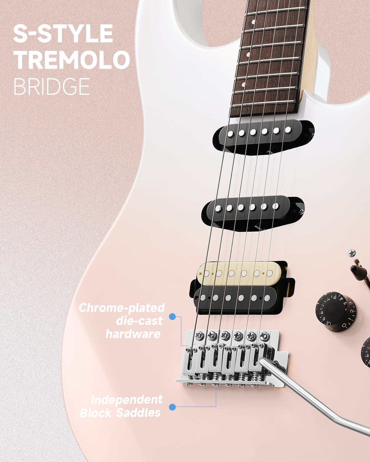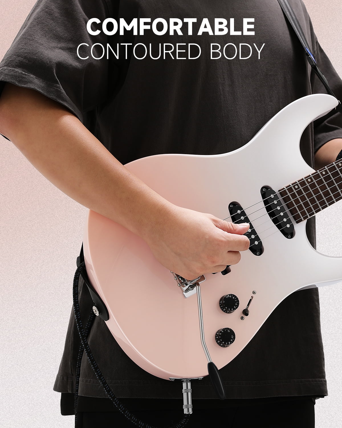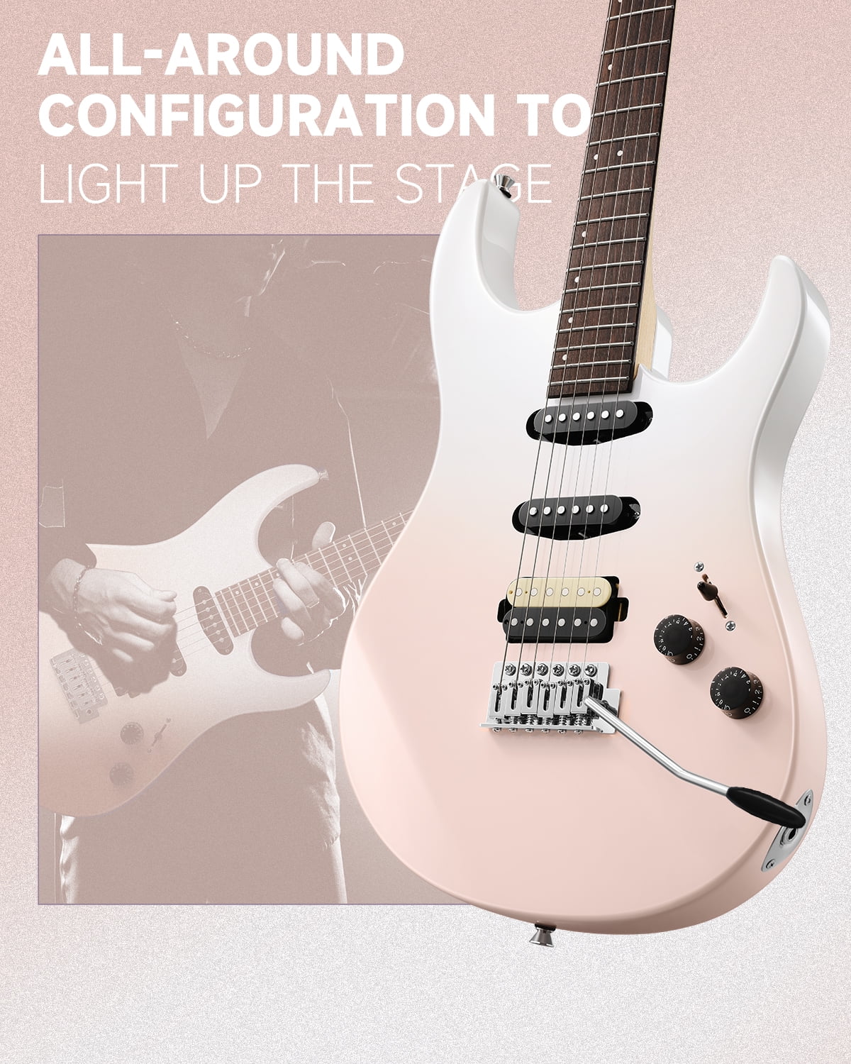 The DMT-66 electric guitar combines excellent performance with beginner-friendly features. Its DMT Midout Set pickups provide clear, rich tones, and the HSS configuration ensures versatile sound options. The ultra-thin C-shaped neck with a satin finish offers comfort and reduces hand fatigue. The synchronized tremolo bridge makes it easy to adjust tuning and sustain, while the laurel fingerboard delivers warm tones and helps minimize fatigue. With a dual-action truss rod, it’s easy to maintain. Ideal for both indoor and outdoor performances, the DMT-66 is a reliable and visually appealing choice for beginners.