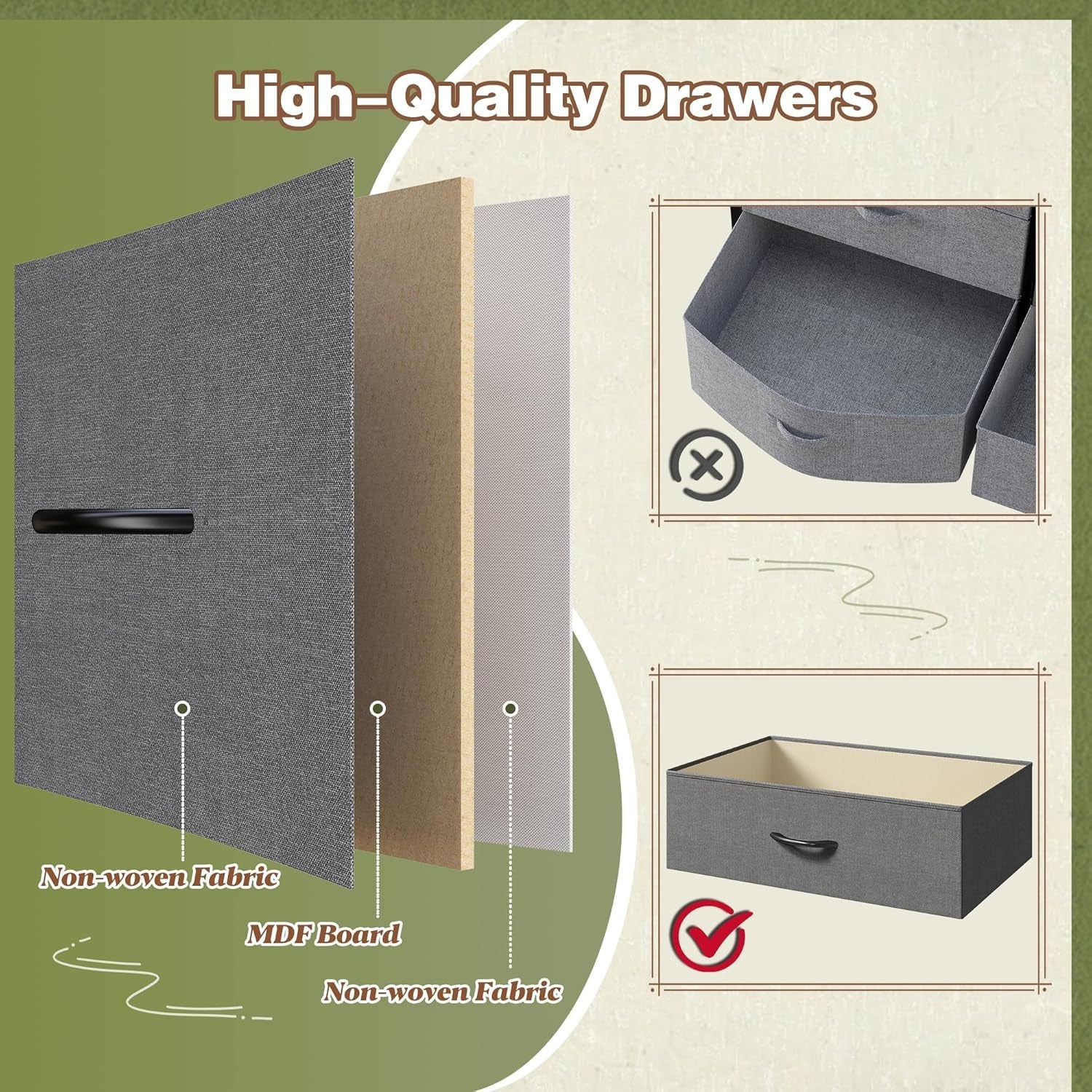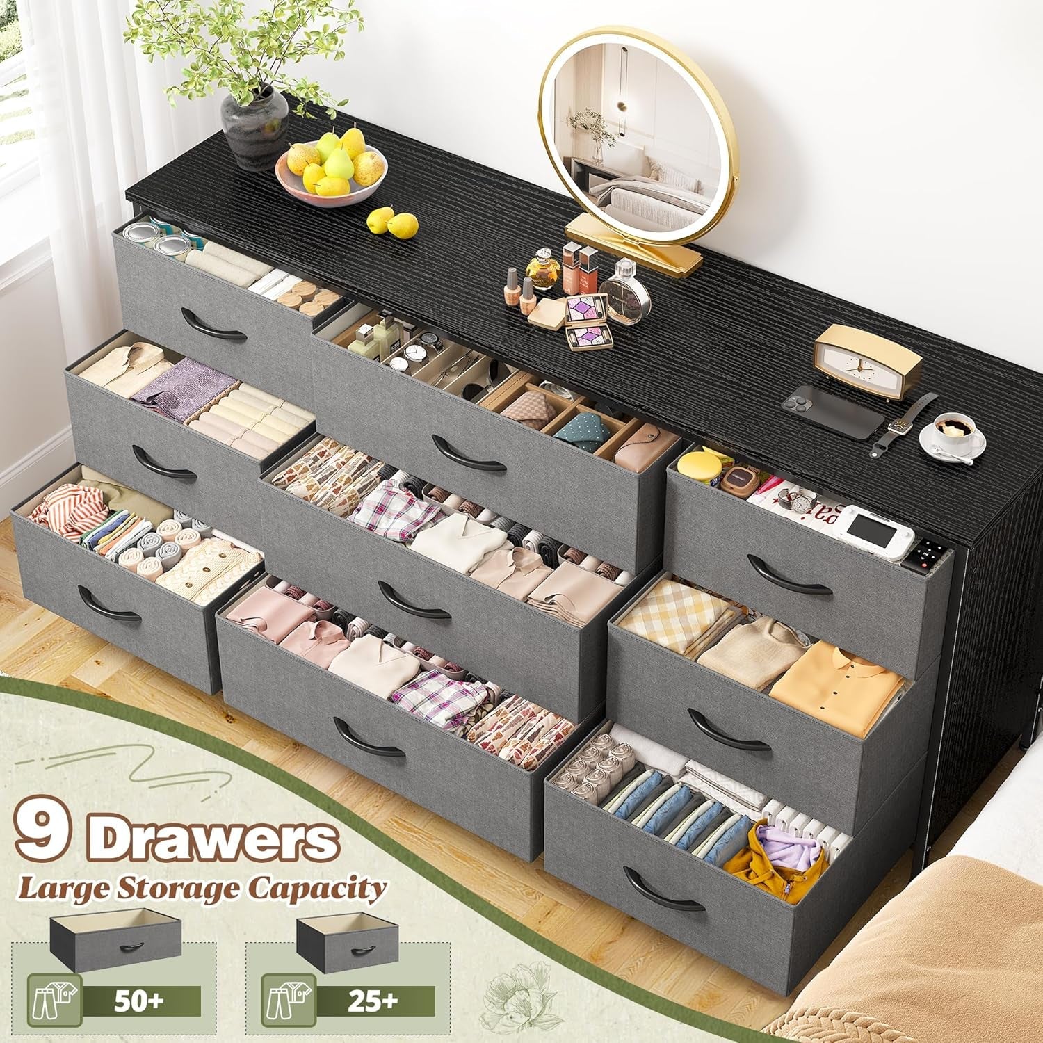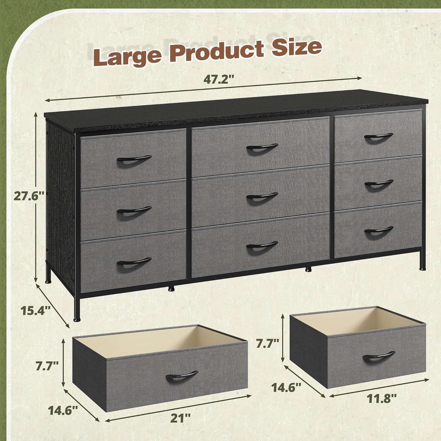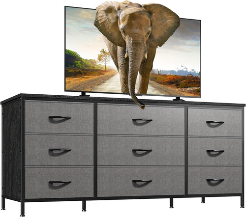 Introducing the perfect solution for your entertainment needs, the Dresser TV Stand with Drawers for 60 Inch TVs. This elegantly designed TV stand is expertly crafted to accommodate televisions up to 60 inches while providing ample storage space. With dimensions of 47.2''W x 15.4''D x 27.6''H, it features a sturdy wood top that can support up to 110 lbs, ensuring stability for all your devices. The innovative design includes nine foldable fabric drawers, making it easy to organize your CDs, DVDs, game controllers, and more, keeping your living area tidy and clutter-free.