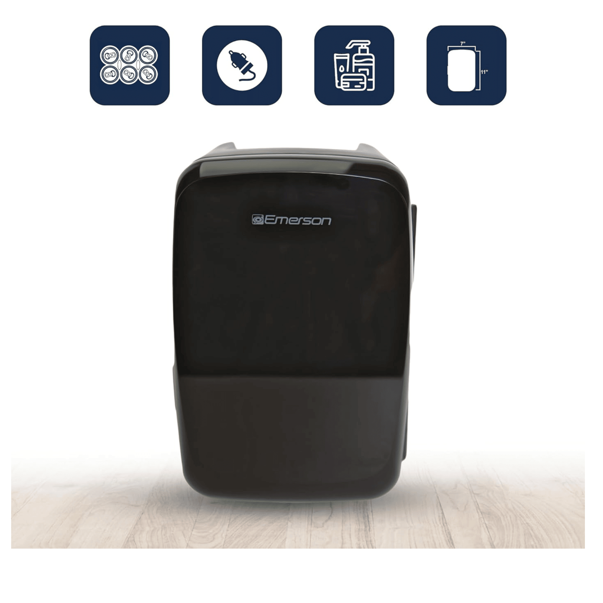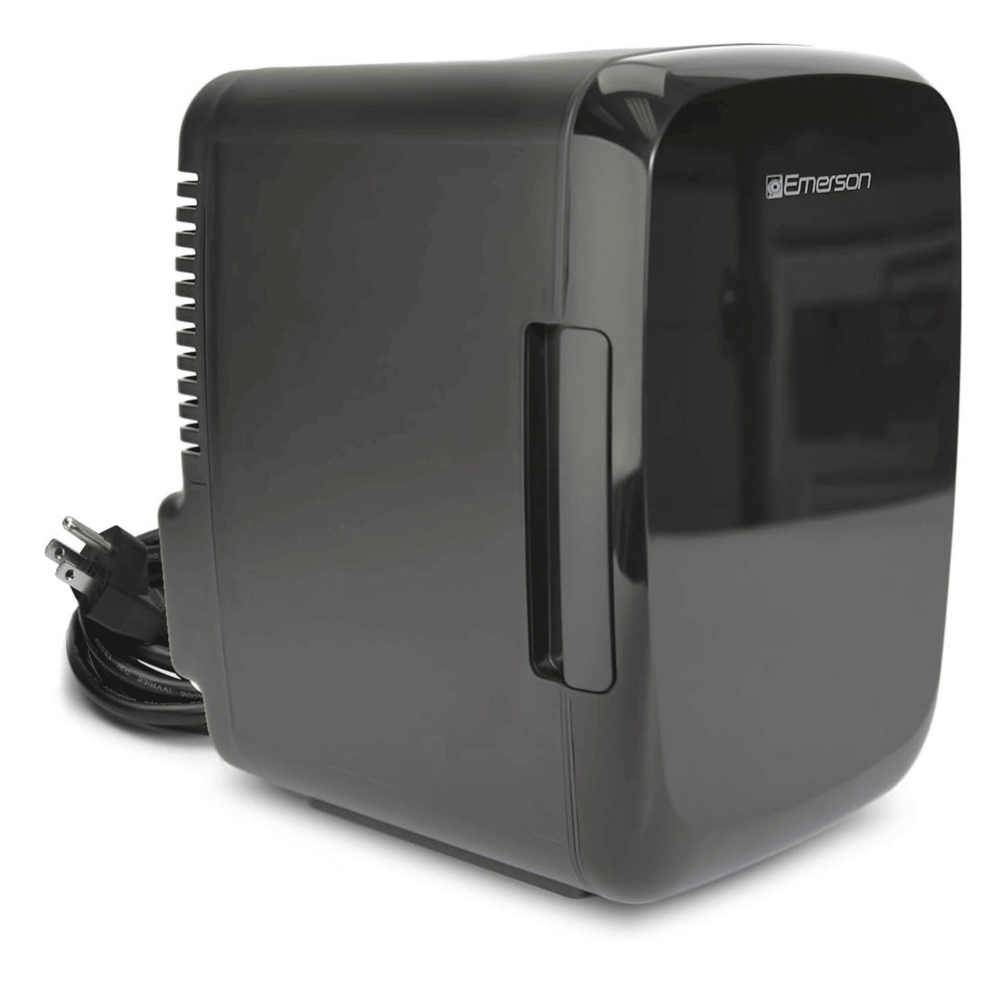 Introducing Emerson's 4-liter mini fridge - perfect for keeping up to 6 cans of beverages and snacks chilled. Its compact size and space-saving design make it ideal for any room, while its thermoelectric cooling system keeps items chilled to 28-30 degrees F below ambient temperature. The fridge operates quietly with minimal vibration and has a locking latch mechanism for added security. Experience the convenience of having chilled items within reach!