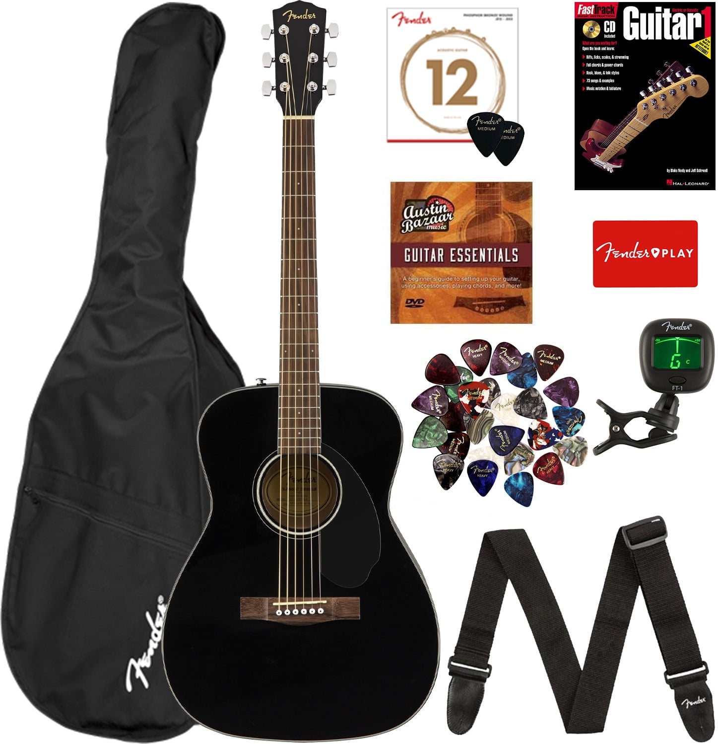 Fender CC-60S Solid Top Concert Acoustic Guitar - Black w/ Gig Bag