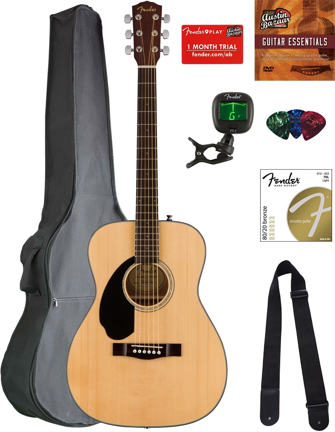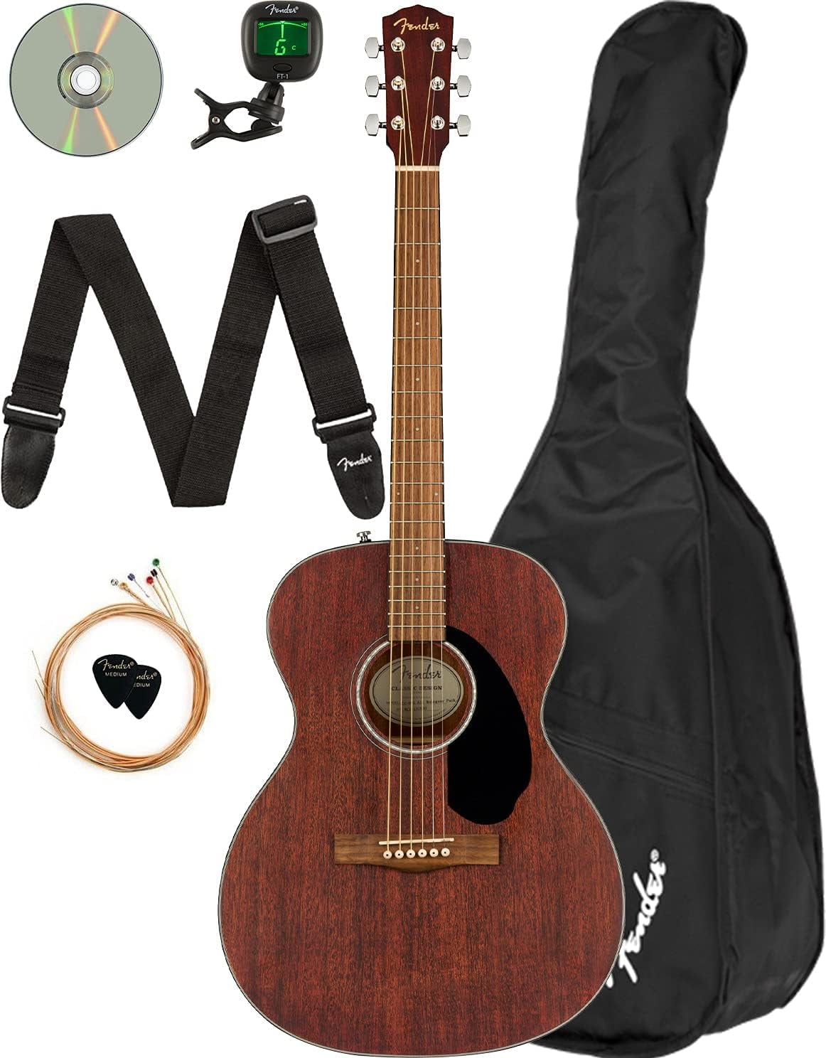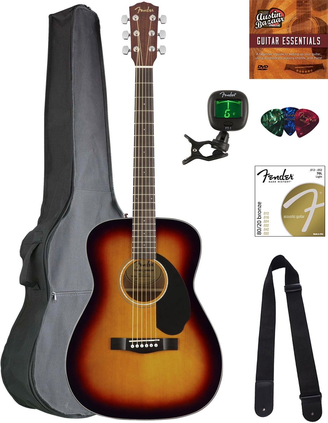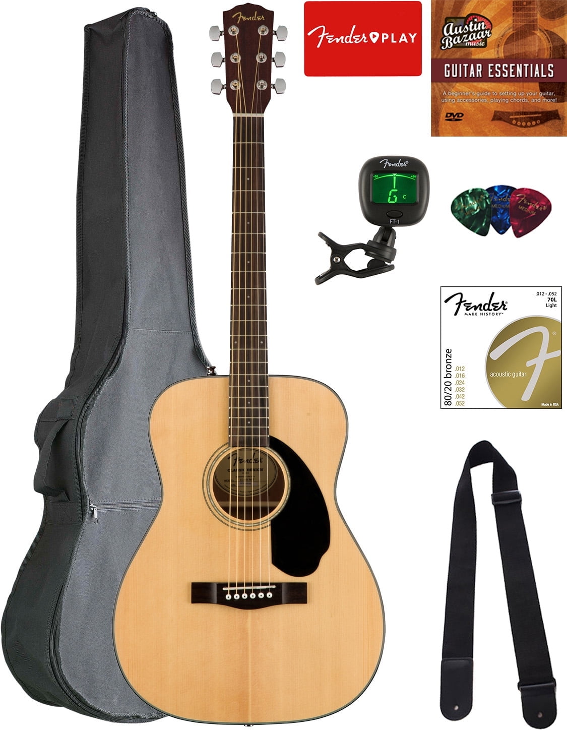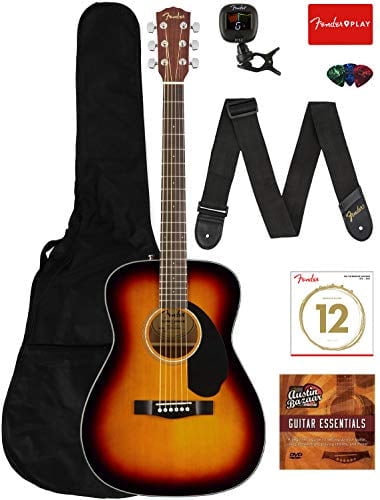 Adding value to your purchase, Austin Bazaar bundles your instrument with necessary accessories. Everything you need to start playing immediately comes in one box. Save yourself the hassle and save some money while you're at it. A gig bag is included so you can keep your instrument safely packed away when you're on the go. An easy-to-use clip-on tuner is included so you can keep your instrument in tune. A strap is included so you can practice or better yet perform while standing up. Strings are included so you have extra for later. Picks are included so you can start playing right out of the box. An instructional book is included so you can practice better. An Austin Bazaar instructional DVD is included so you can pick up some tips while learning your new instrument. Compact and comfortable, the CC-60S is ideal for beginning players. The smaller concert-sized body is easy to maneuver in any playing position, with an articulate voice that's great for fingerpicking. Its tuneful solid spruce top, easy-to-play neck, and mahogany back and sides make the CC-60S a perfect choice for the beach, the patio or the coffeehouse. Other features include a solid spruce top, mahogany back and sides, & walnut fingerboard.What does ?Concert Size? actually mean?Dating to around 1854 and the standard size around the time of the U.S. Civil War and for many years thereafter. Its bright, trebly sounding design gradually gave way to larger, more bass-heavy guitars, although the style has enjoyed a recent resurgence. General dimensions: 18" long, 4 1/4" deep, 10" upper body width, 13 1/2" lower body width.Is there a difference in sound?Generally speaking, deeper bodies add greater resonance and more resounding bass; shallower bodies have more projection and focus, with better bass-to-treble balance. The concert size is favored by players because it is well-balanced, compact, comfortable to play, and offers all the qualities of a great sounding guitar.