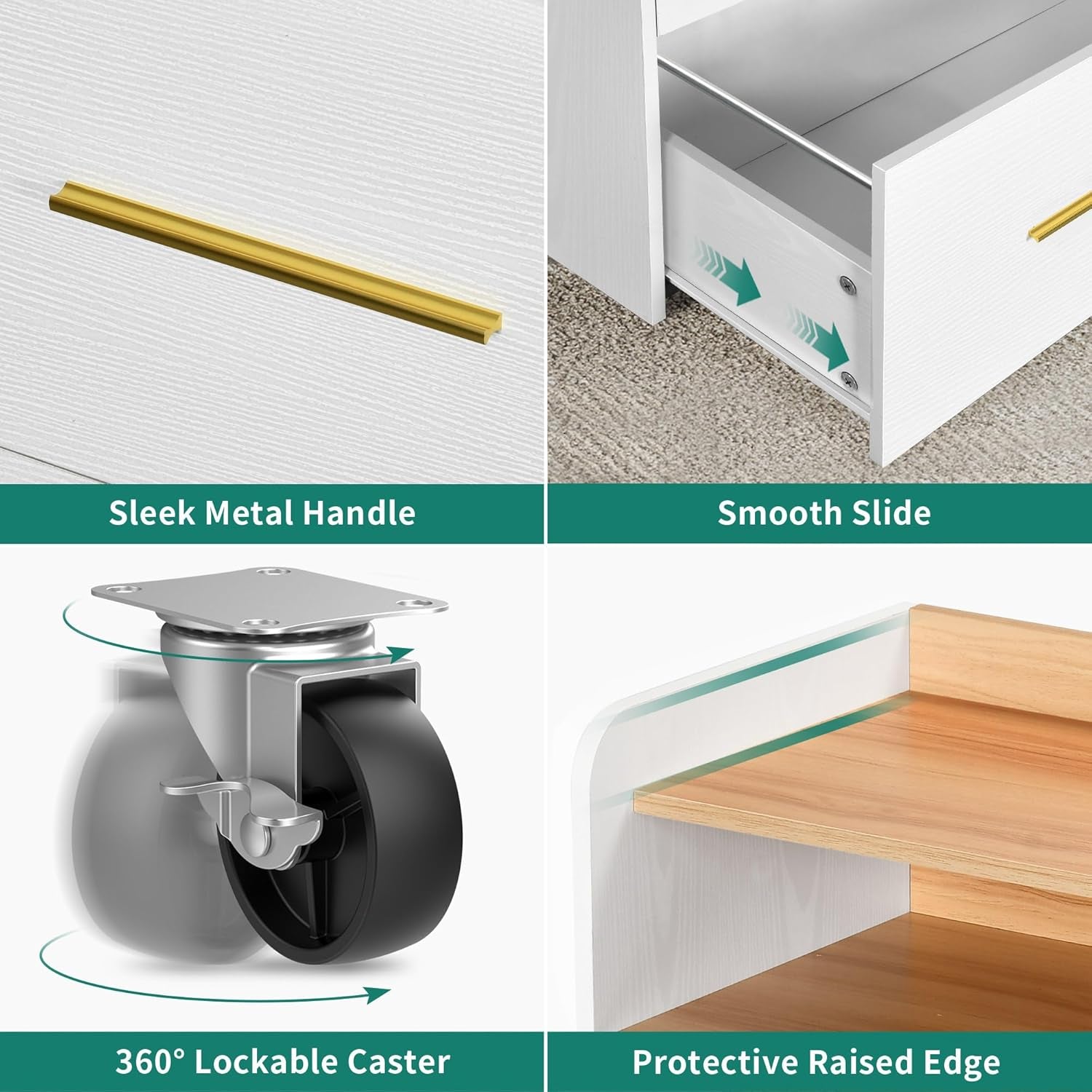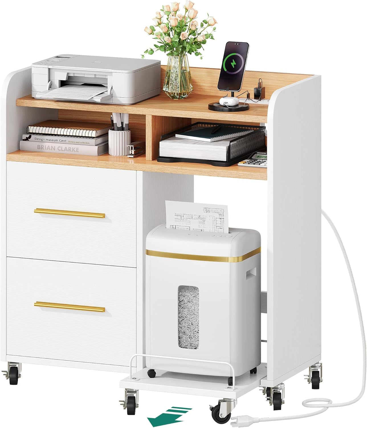 The wheeled rack of the file cabinet is designed to store a shredder or computer tower, allowing for easy access and retrieval.