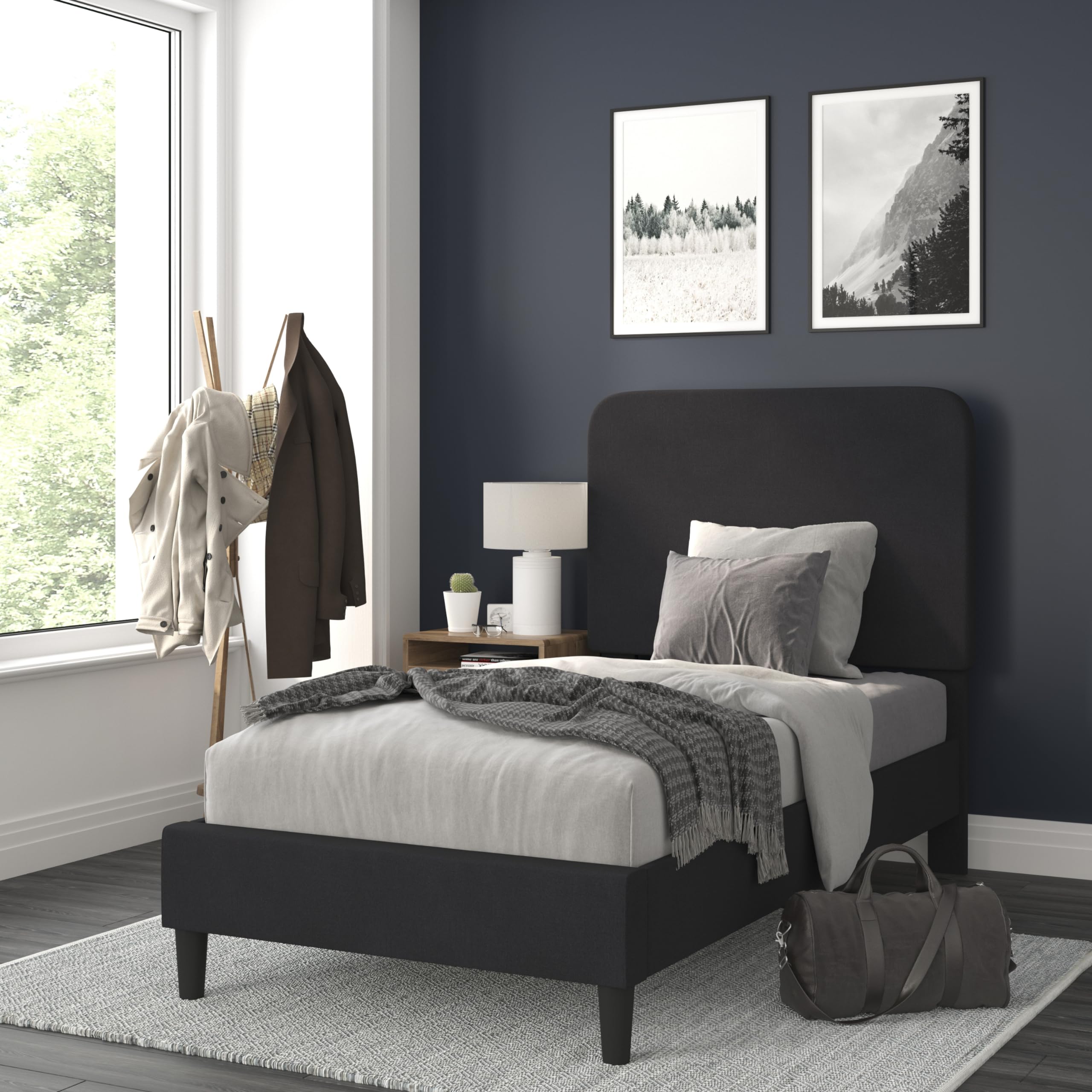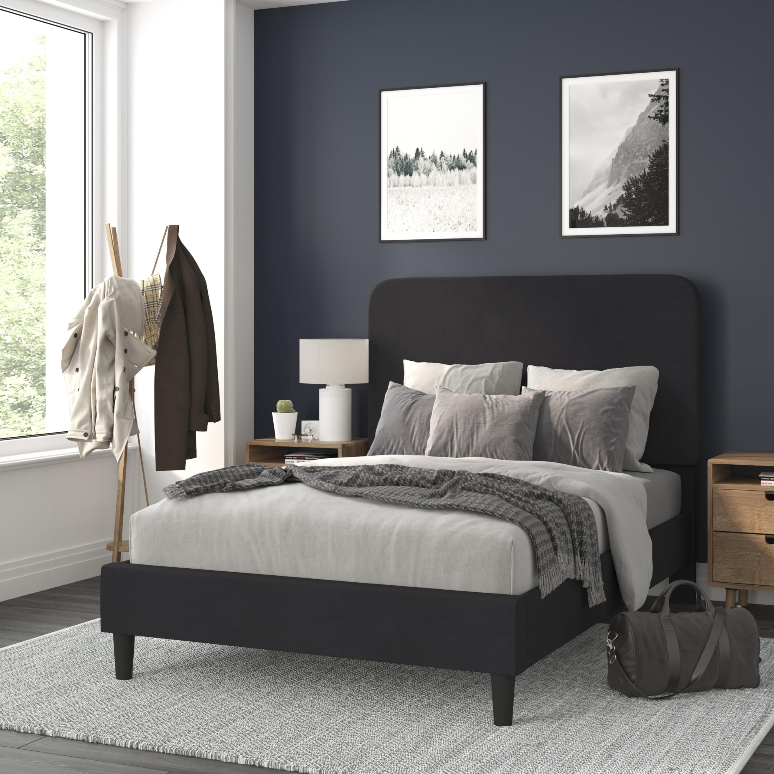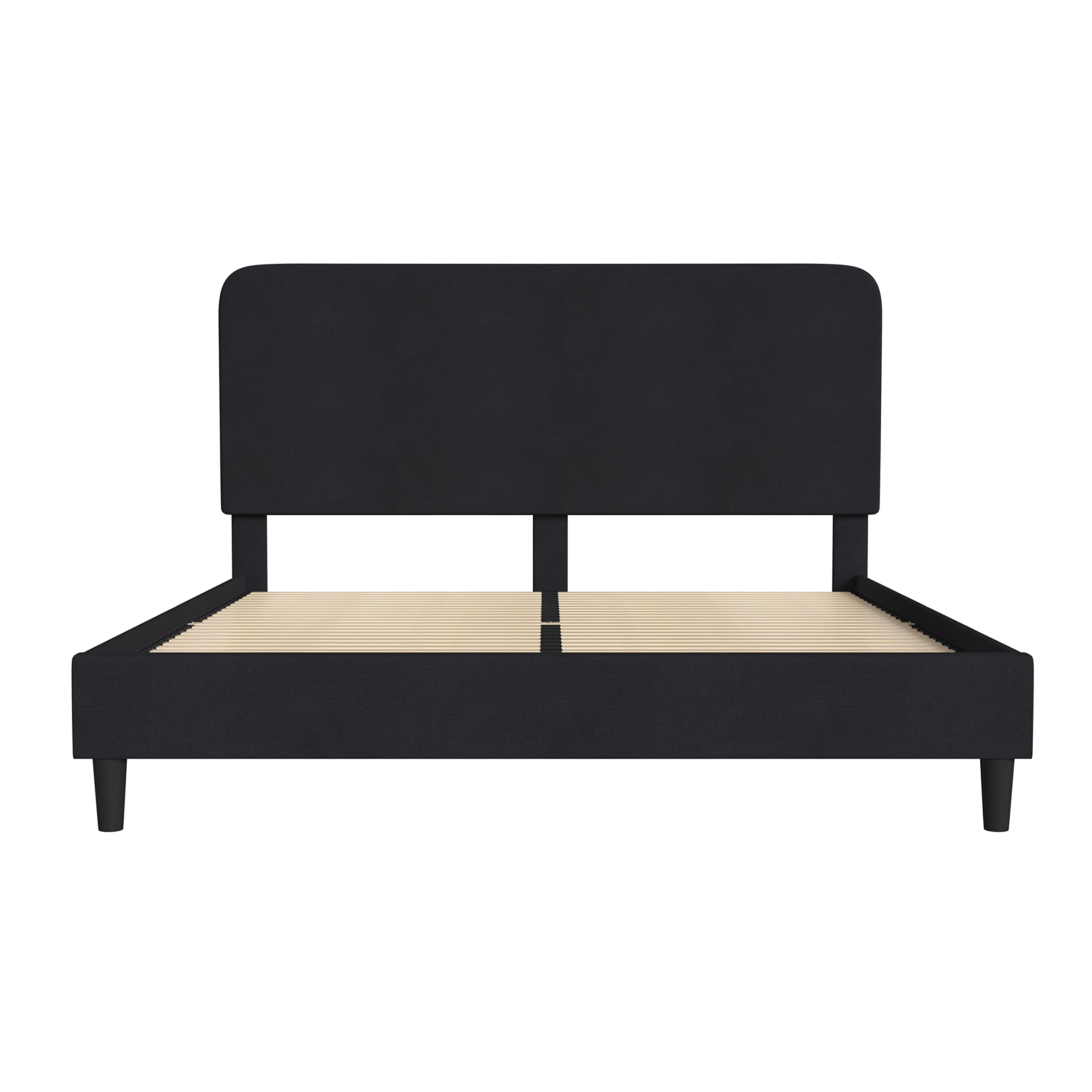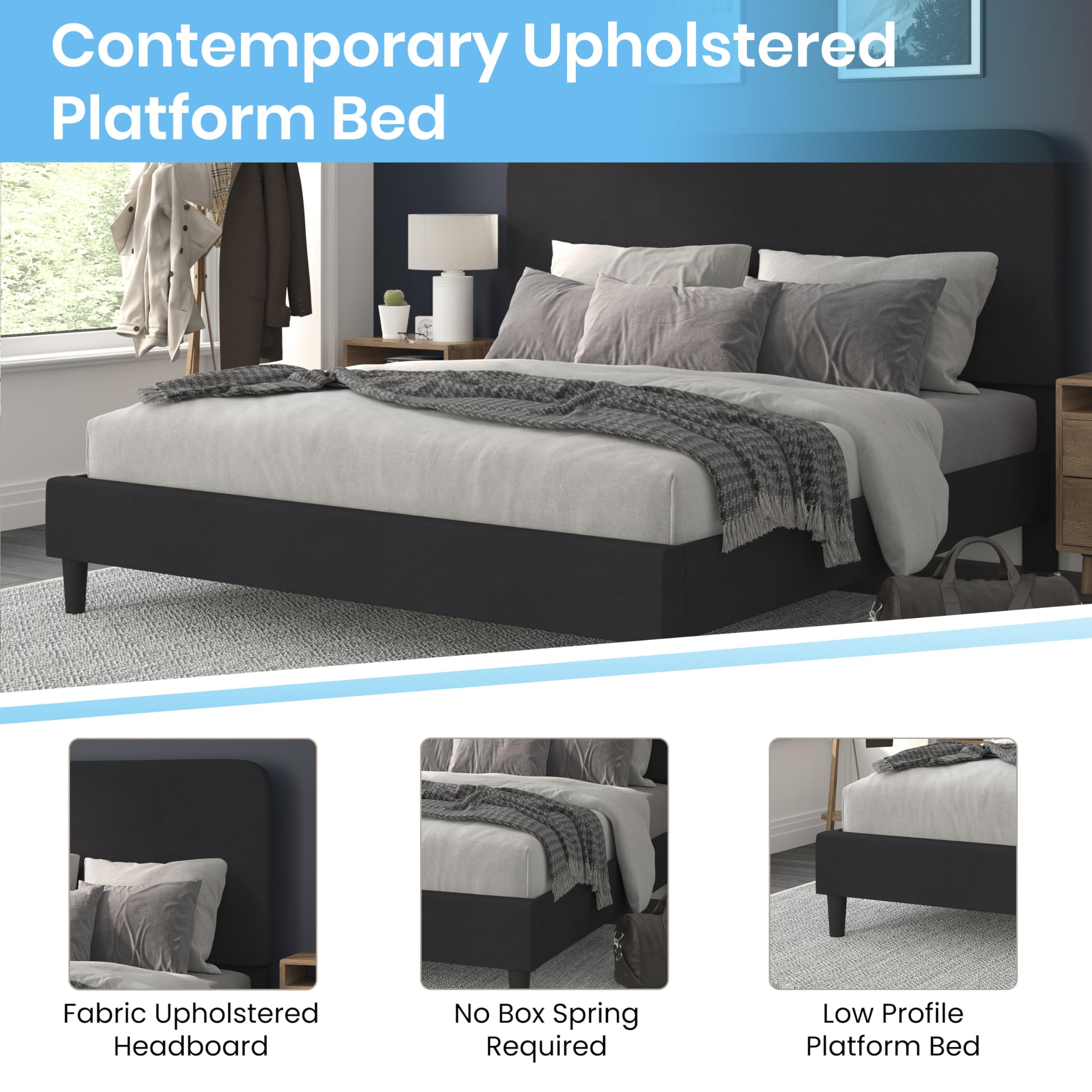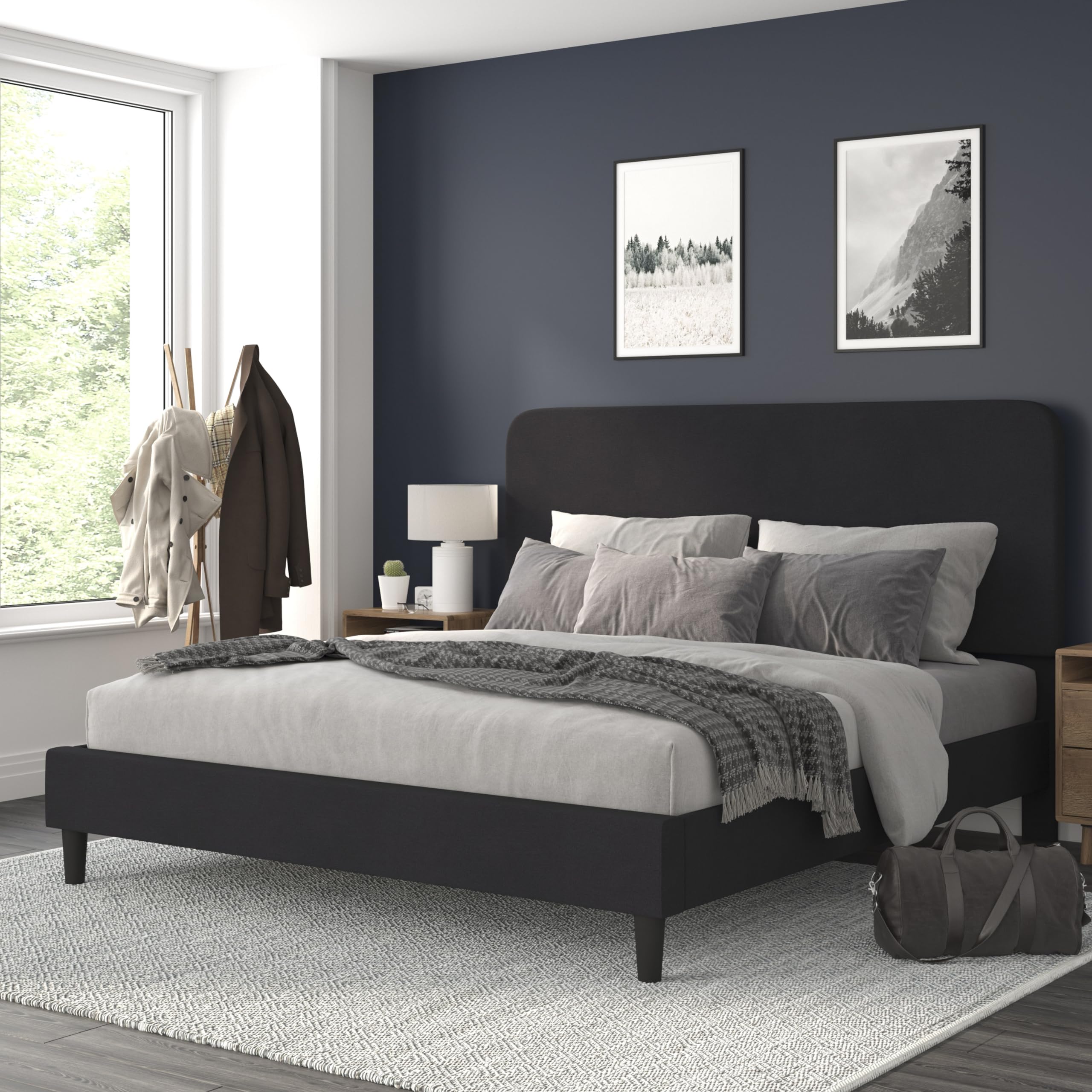Enhance any bed with the upscale look and added comfort of the Flash Furniture Addison Fabric Upholstered King Size Platform Bed. This bed boasts a classic design featuring a soft charcoal fabric upholstered headboard with gently rounded corners and a space-saving, stylish low profile footboard to add timeless elegance to any master bedroom or guest bedroom in your home. 14 sturdy wooden slats with iron side legs and a middle support leg accommodate almost any mattress, so no foundation or box spring is required. Constructed with a sturdy wood frame and steel metal brace with wood screw reinforcements, this upholstered bed holds up to 800 pounds of static weight and withstands years of quality use. Fixed plastic floor glides protect hard flooring surfaces when moving the bed, and the low profile bed can be wiped down with a damp cloth to remove dust or soil to keep it looking great. This king size bed measures 78.5"W x 85.75"D x 51"H. Assembly takes less than one hour thanks to the step-by-step illustrated assembly instructions with included tools.