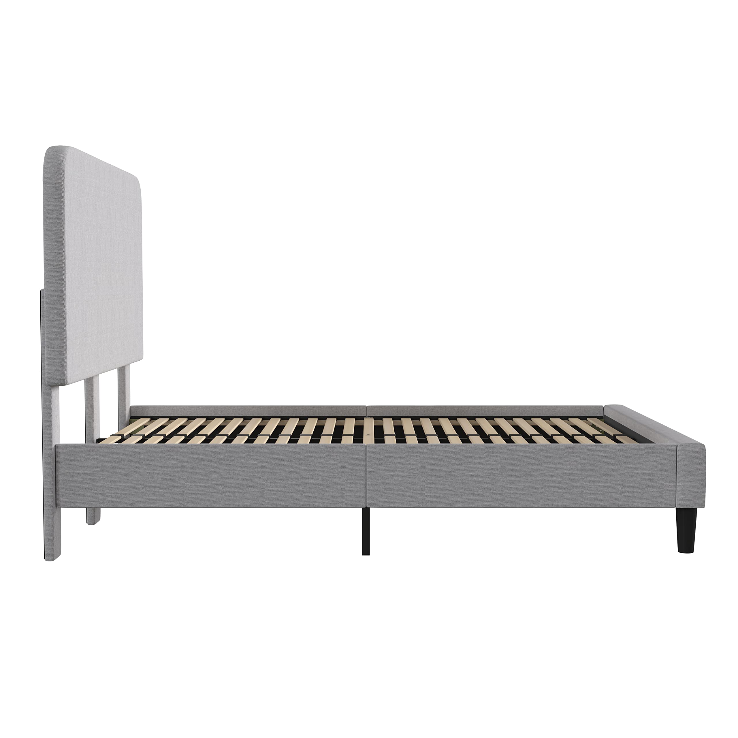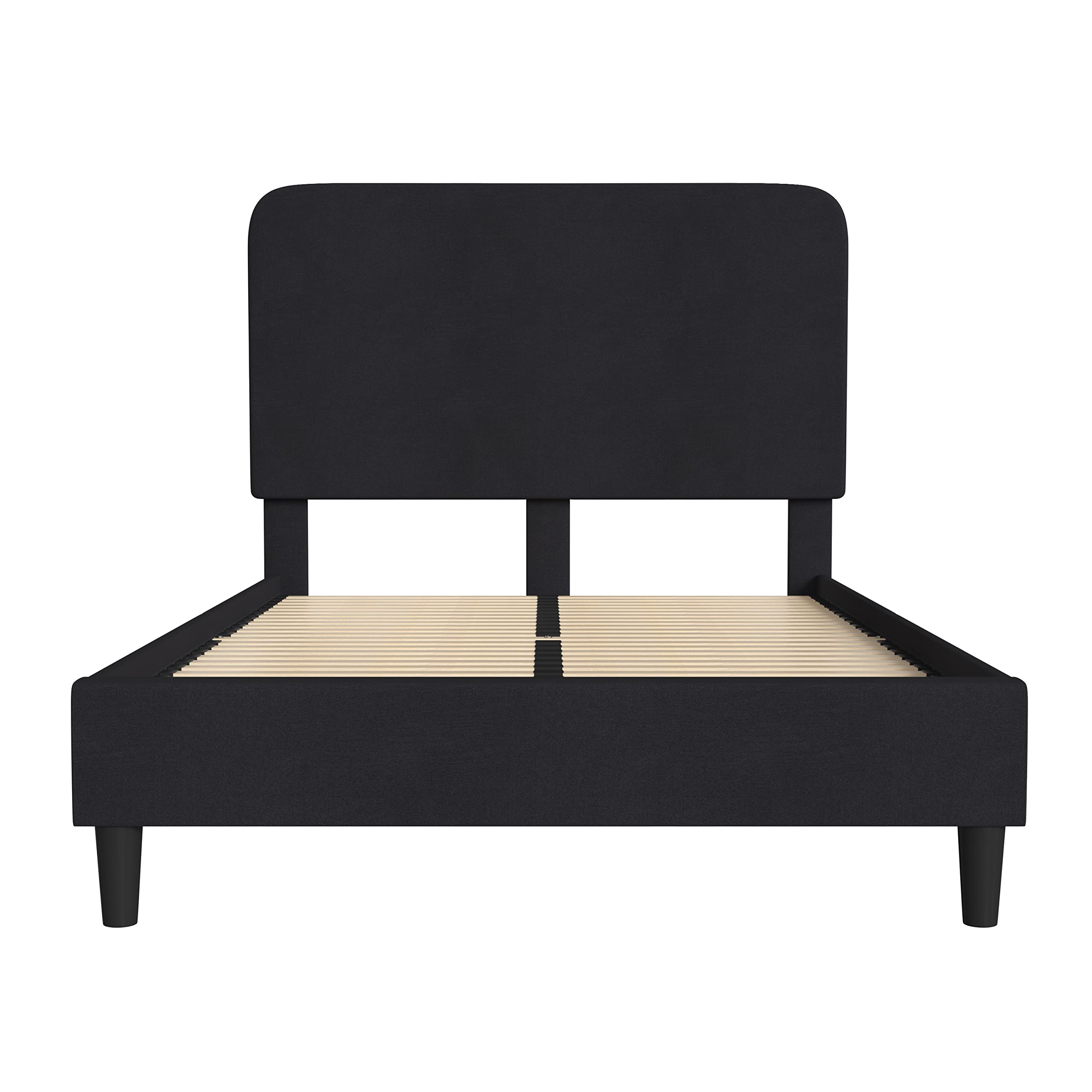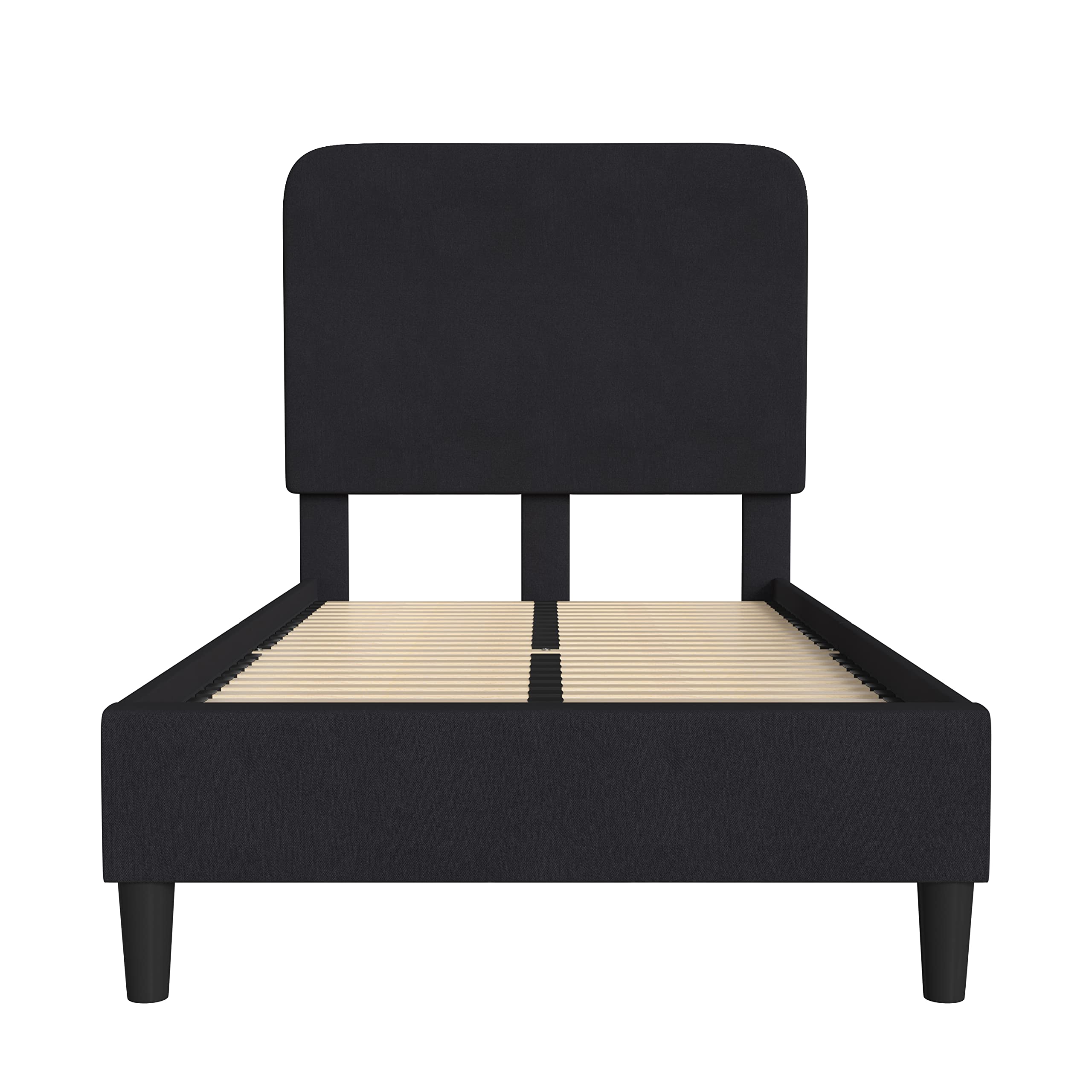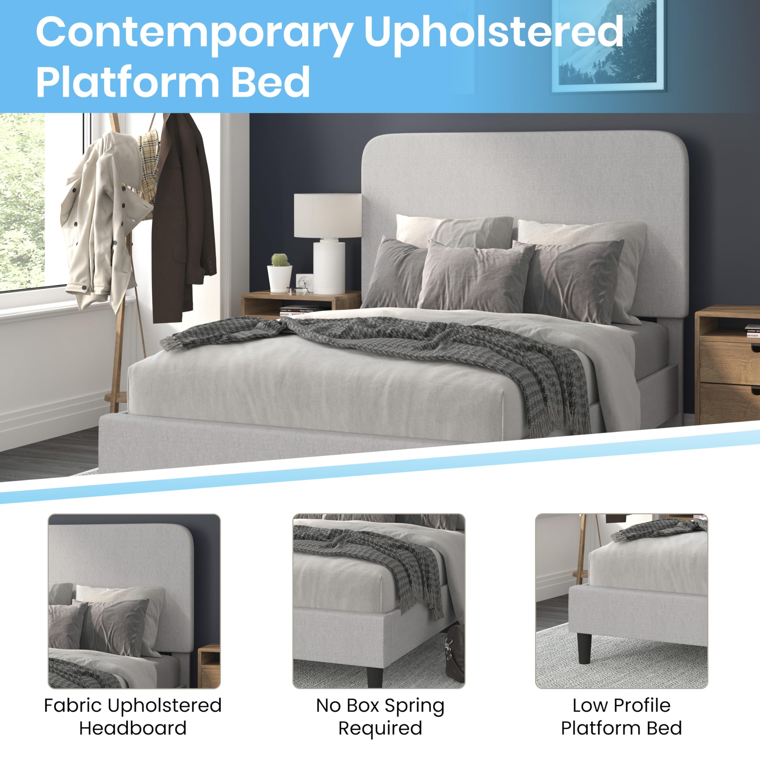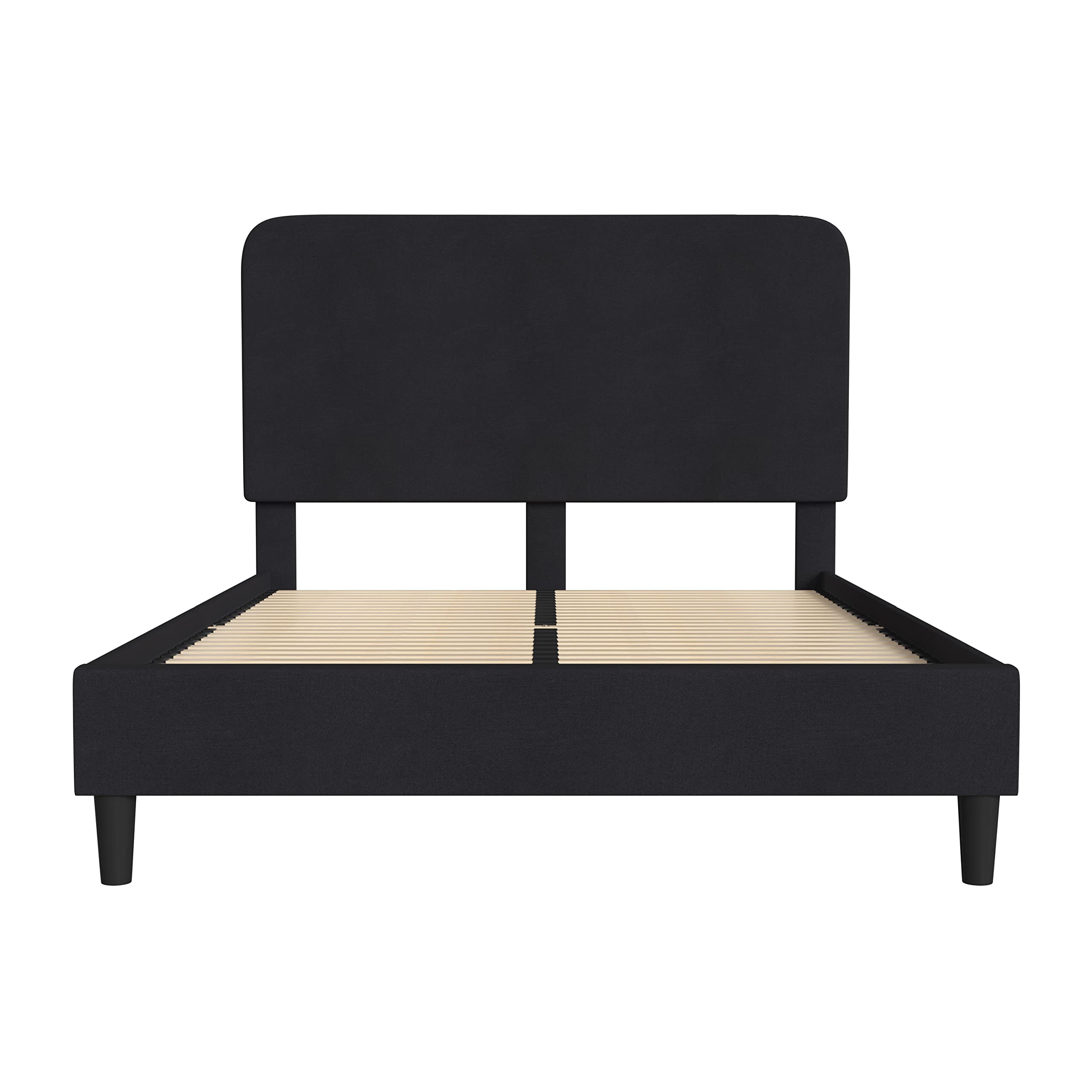 Enhance any bed with the upscale look and added comfort of the Flash Furniture Addison Fabric Upholstered King Size Platform Bed. This bed boasts a classic design featuring a soft charcoal fabric upholstered headboard with gently rounded corners and a space-saving, stylish low profile footboard to add timeless elegance to any master bedroom or guest bedroom in your home. 14 sturdy wooden slats with iron side legs and a middle support leg accommodate almost any mattress, so no foundation or box spring is required. Constructed with a sturdy wood frame and steel metal brace with wood screw reinforcements, this upholstered bed holds up to 800 pounds of static weight and withstands years of quality use. Fixed plastic floor glides protect hard flooring surfaces when moving the bed, and the low profile bed can be wiped down with a damp cloth to remove dust or soil to keep it looking great. This king size bed measures 78.5"W x 85.75"D x 51"H. Assembly takes less than one hour thanks to the step-by-step illustrated assembly instructions with included tools.