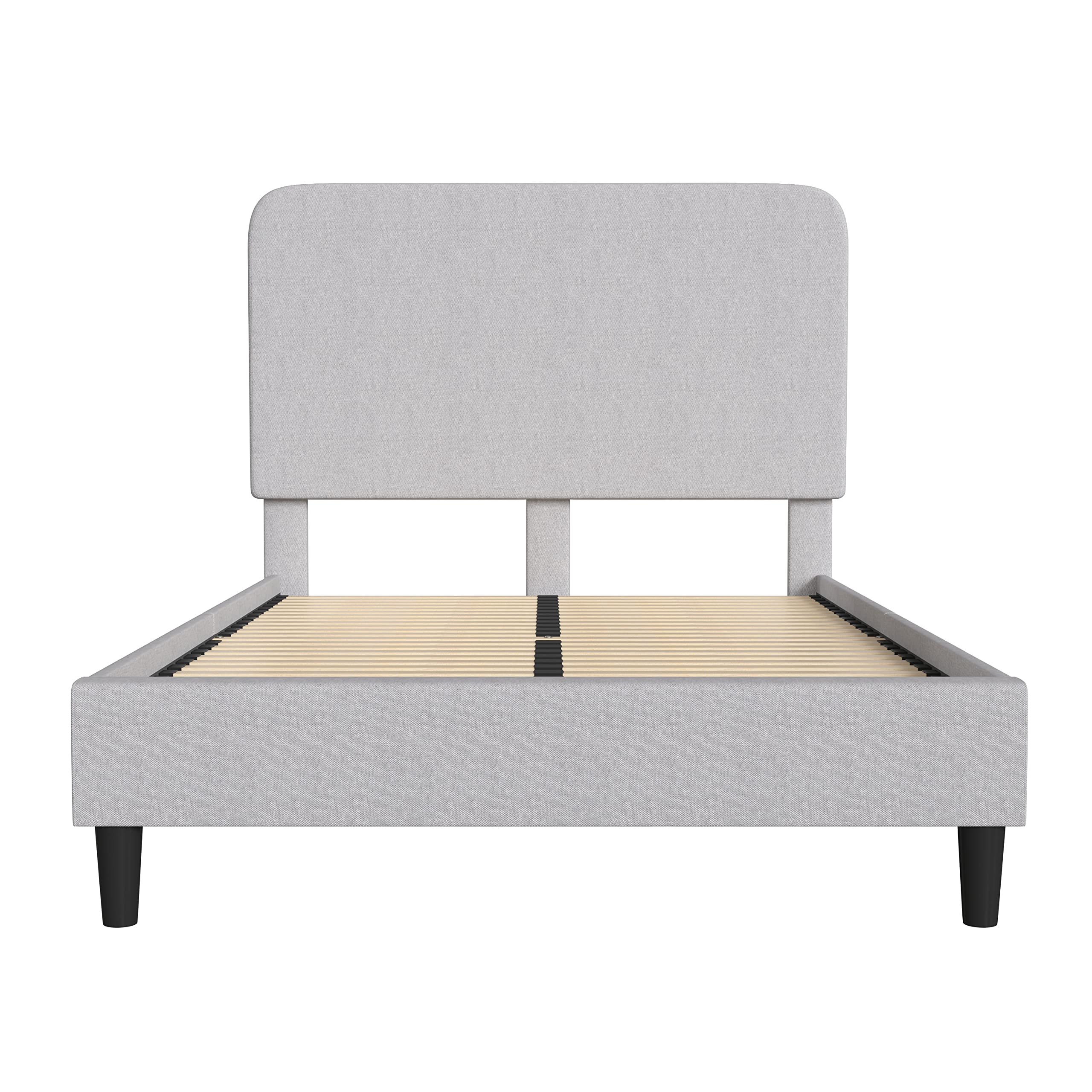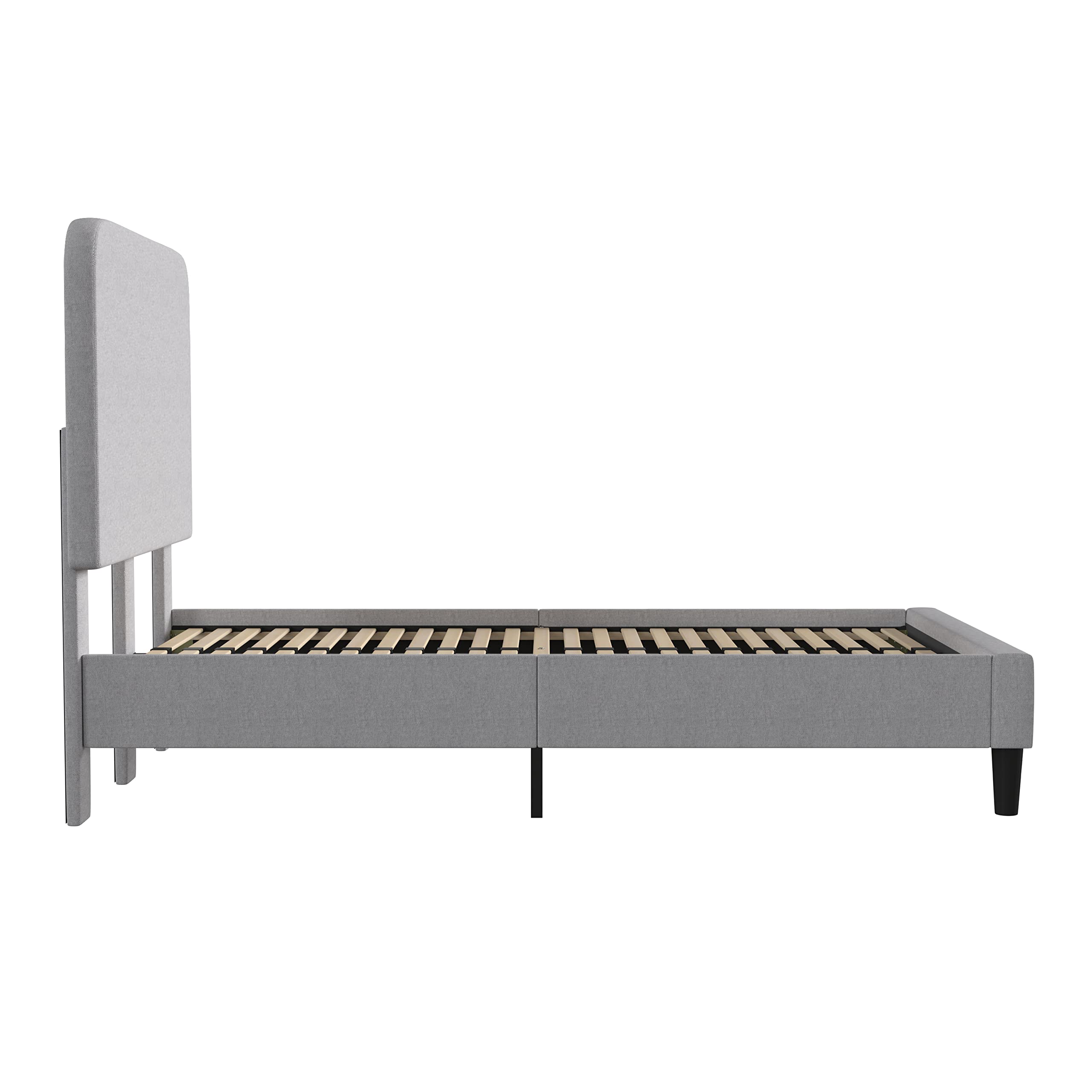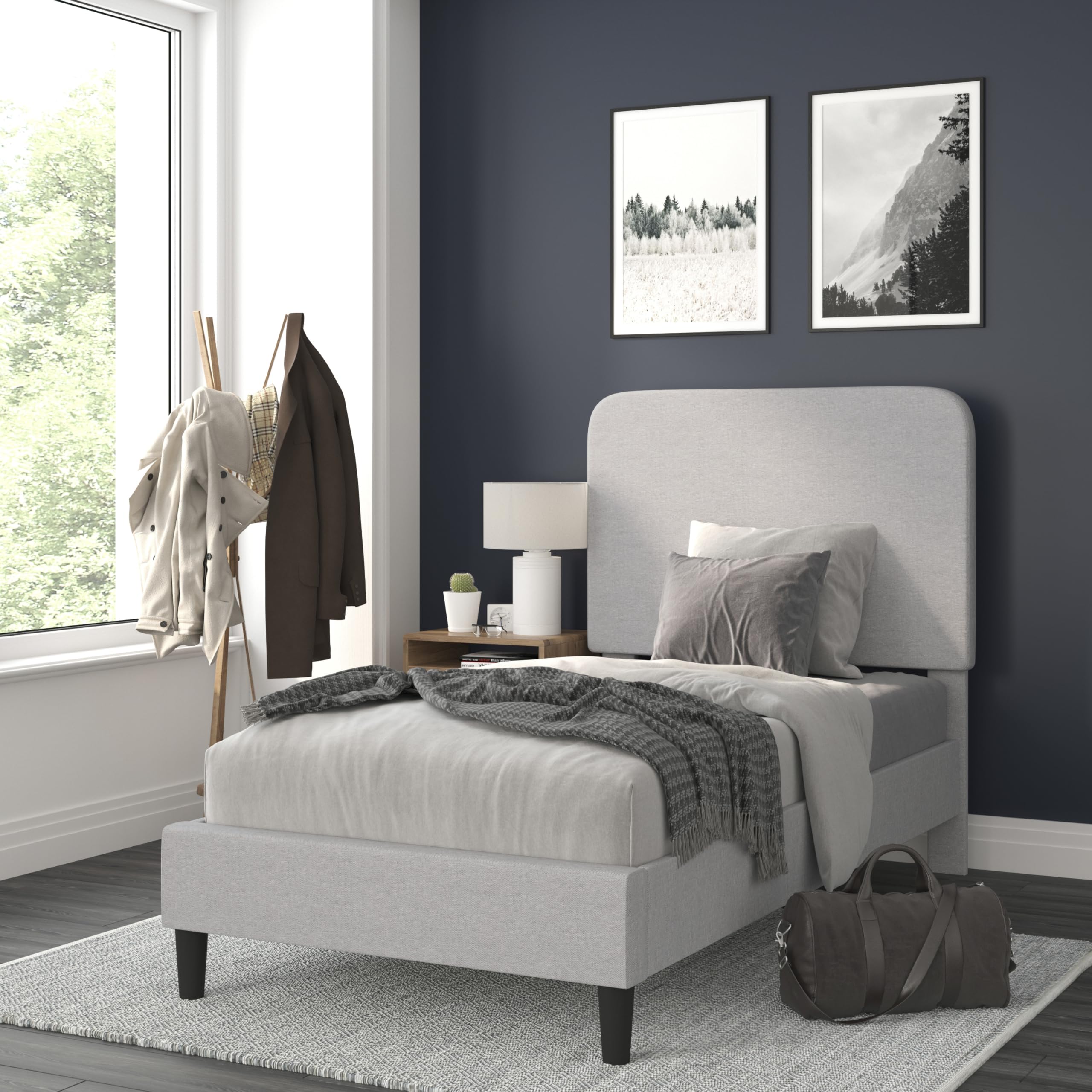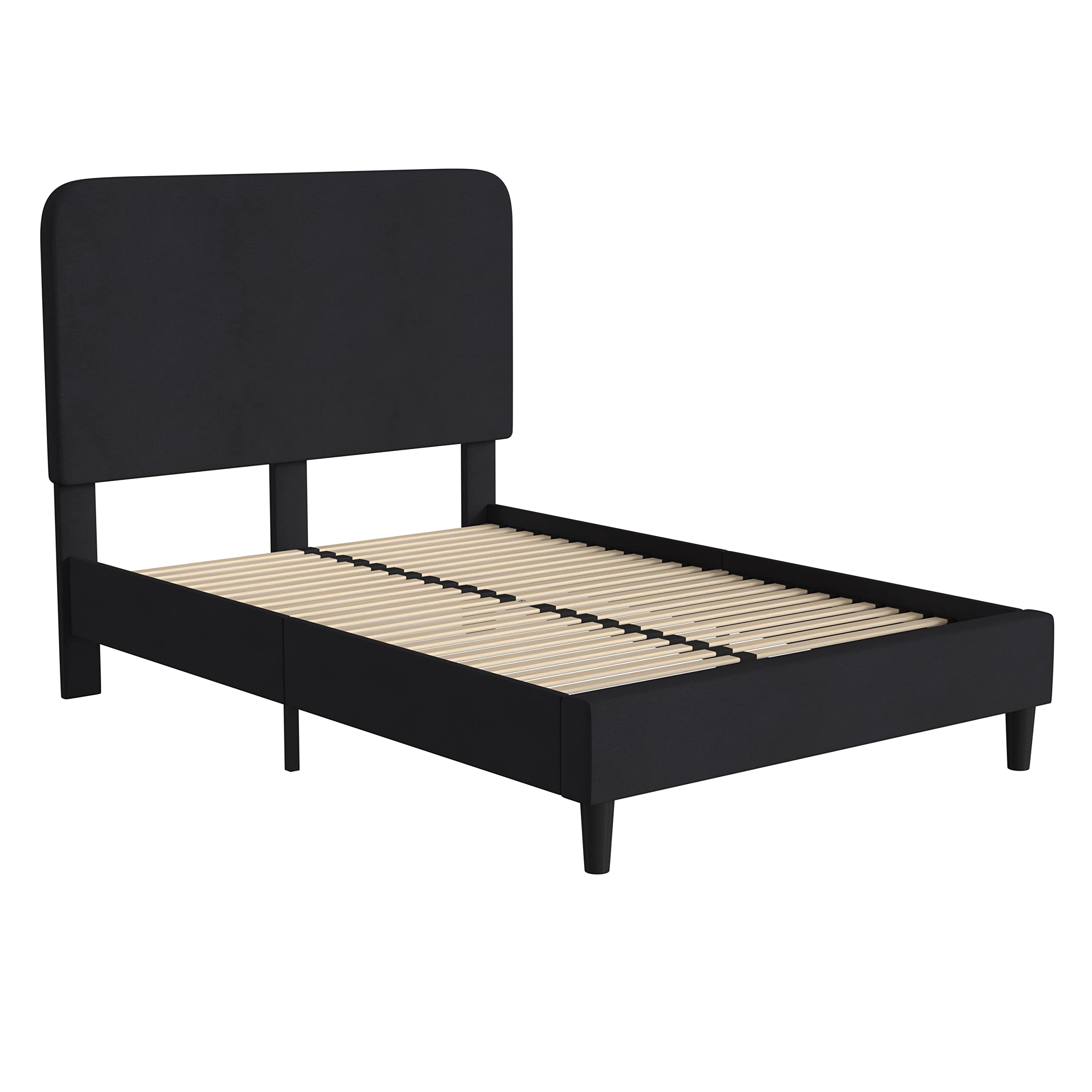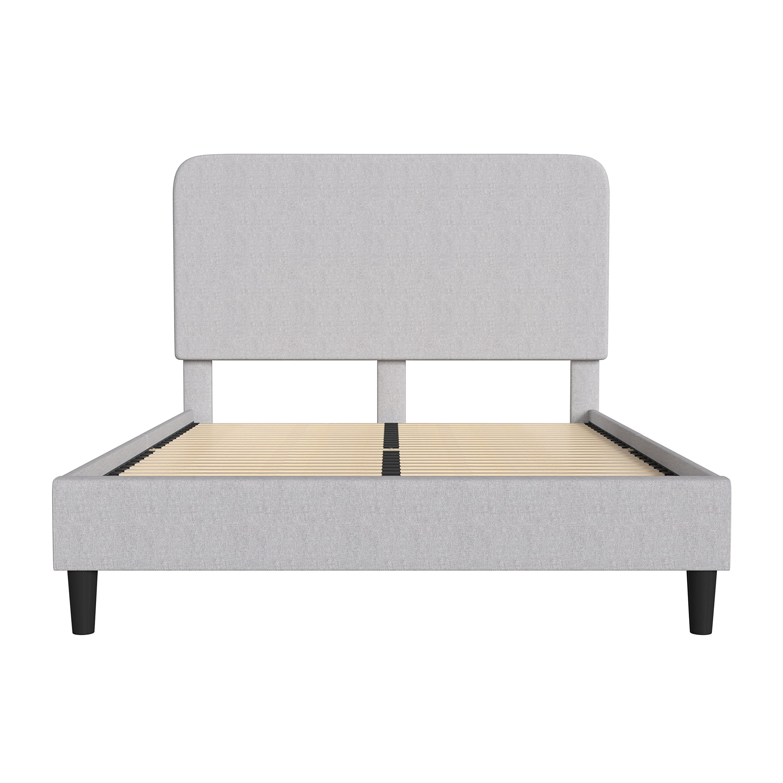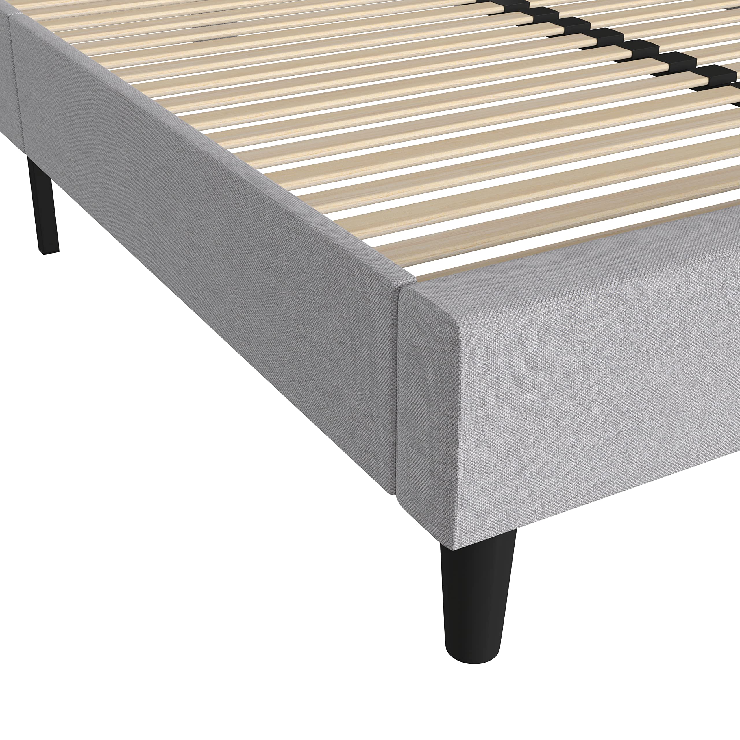Enhance any bed with the upscale look and added comfort of the Flash Furniture Addison Fabric Upholstered King Size Platform Bed. This bed boasts a classic design featuring a soft charcoal fabric upholstered headboard with gently rounded corners and a space-saving, stylish low profile footboard to add timeless elegance to any master bedroom or guest bedroom in your home. 14 sturdy wooden slats with iron side legs and a middle support leg accommodate almost any mattress, so no foundation or box spring is required. Constructed with a sturdy wood frame and steel metal brace with wood screw reinforcements, this upholstered bed holds up to 800 pounds of static weight and withstands years of quality use. Fixed plastic floor glides protect hard flooring surfaces when moving the bed, and the low profile bed can be wiped down with a damp cloth to remove dust or soil to keep it looking great. This king size bed measures 78.5"W x 85.75"D x 51"H. Assembly takes less than one hour thanks to the step-by-step illustrated assembly instructions with included tools.