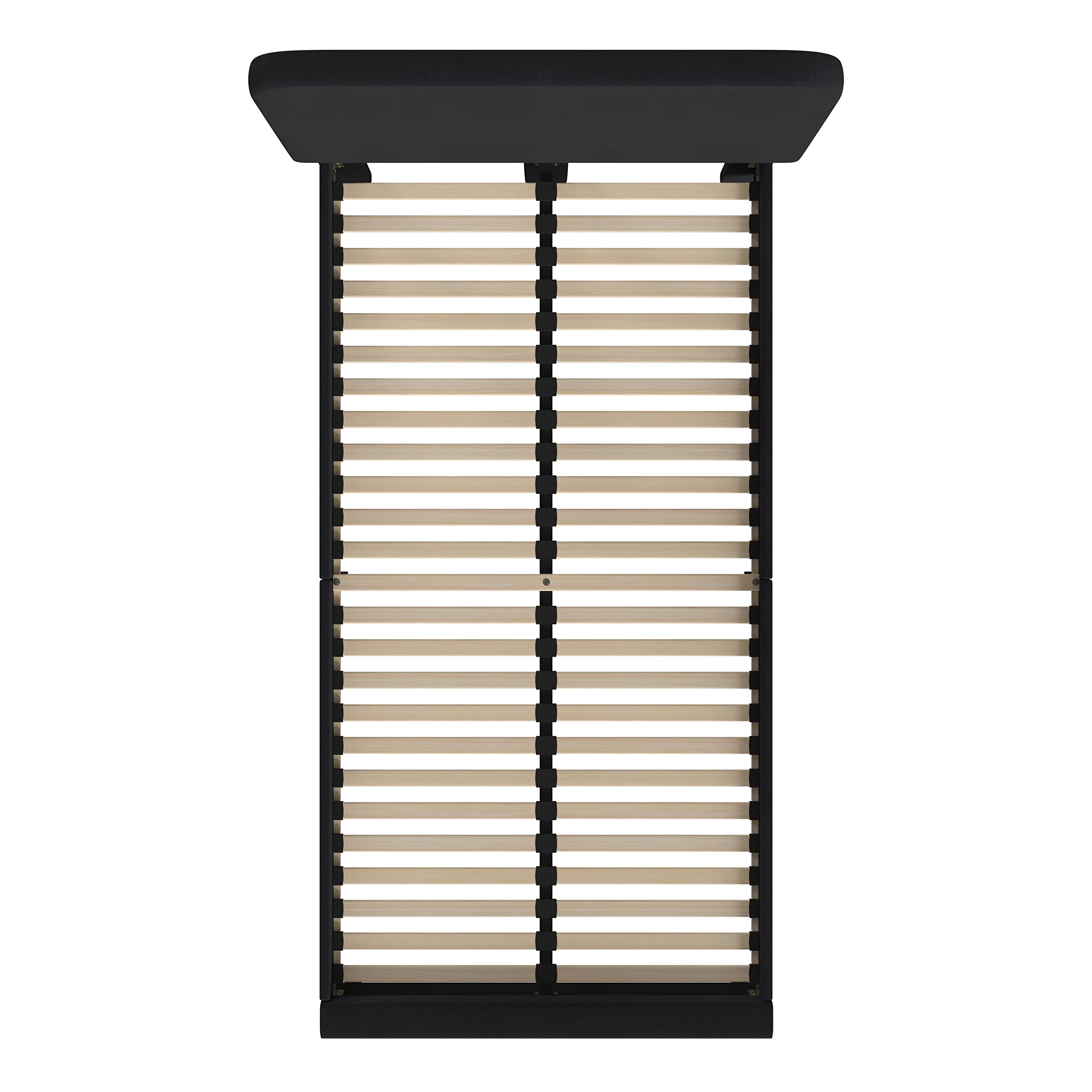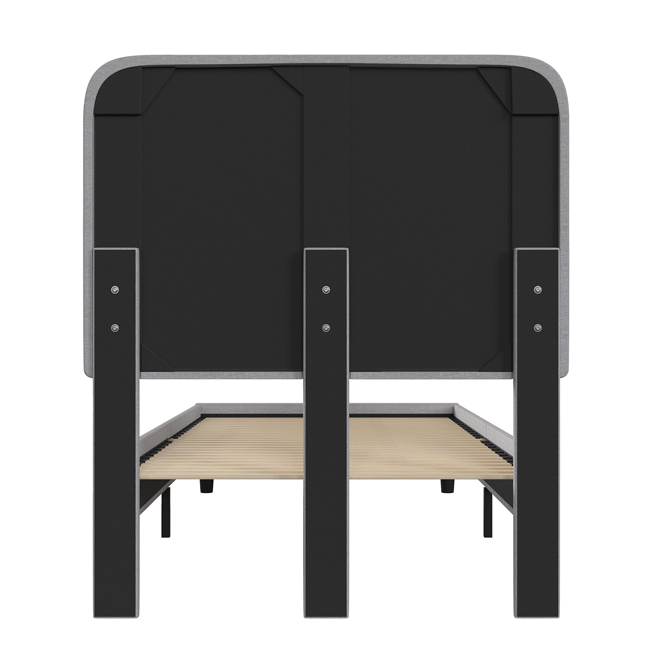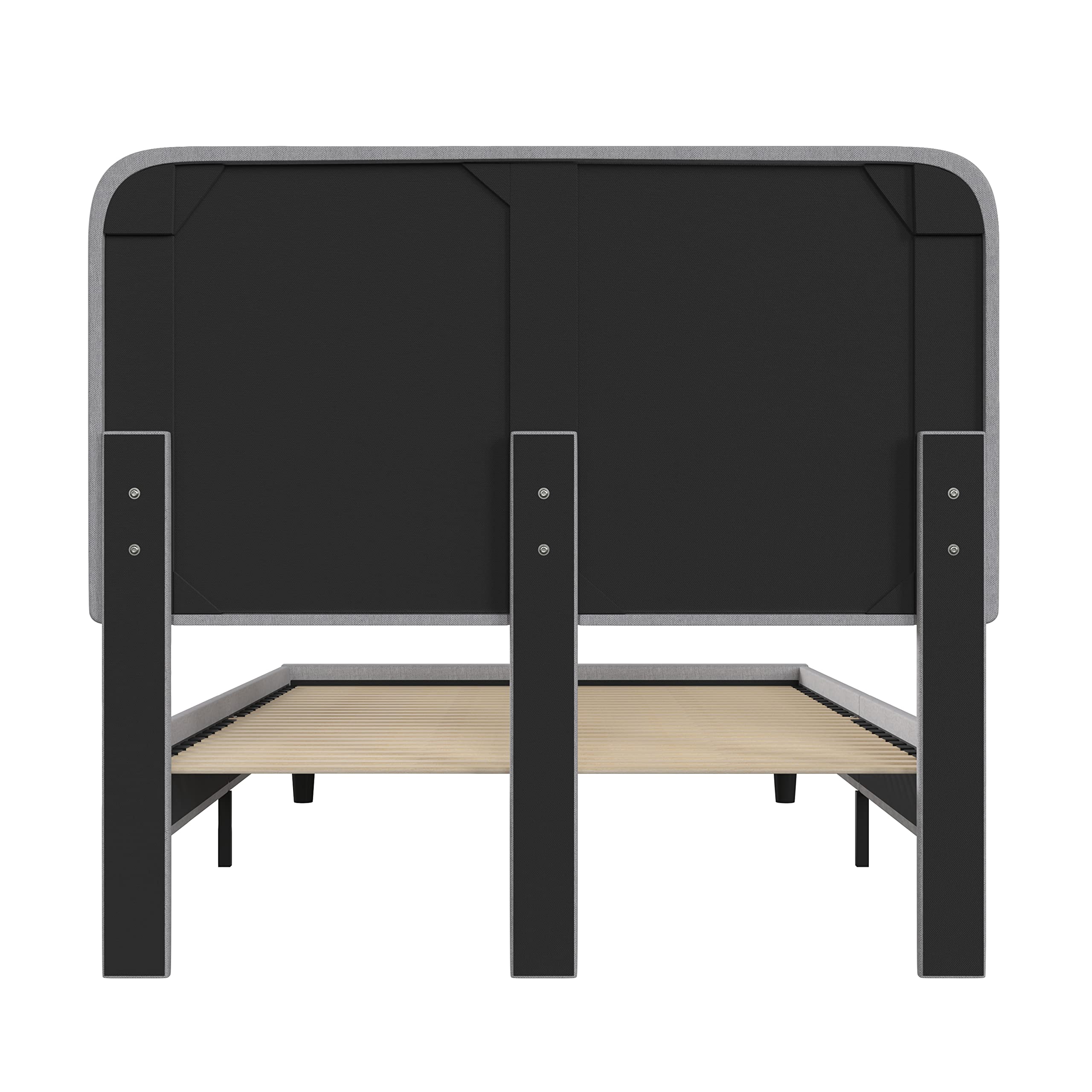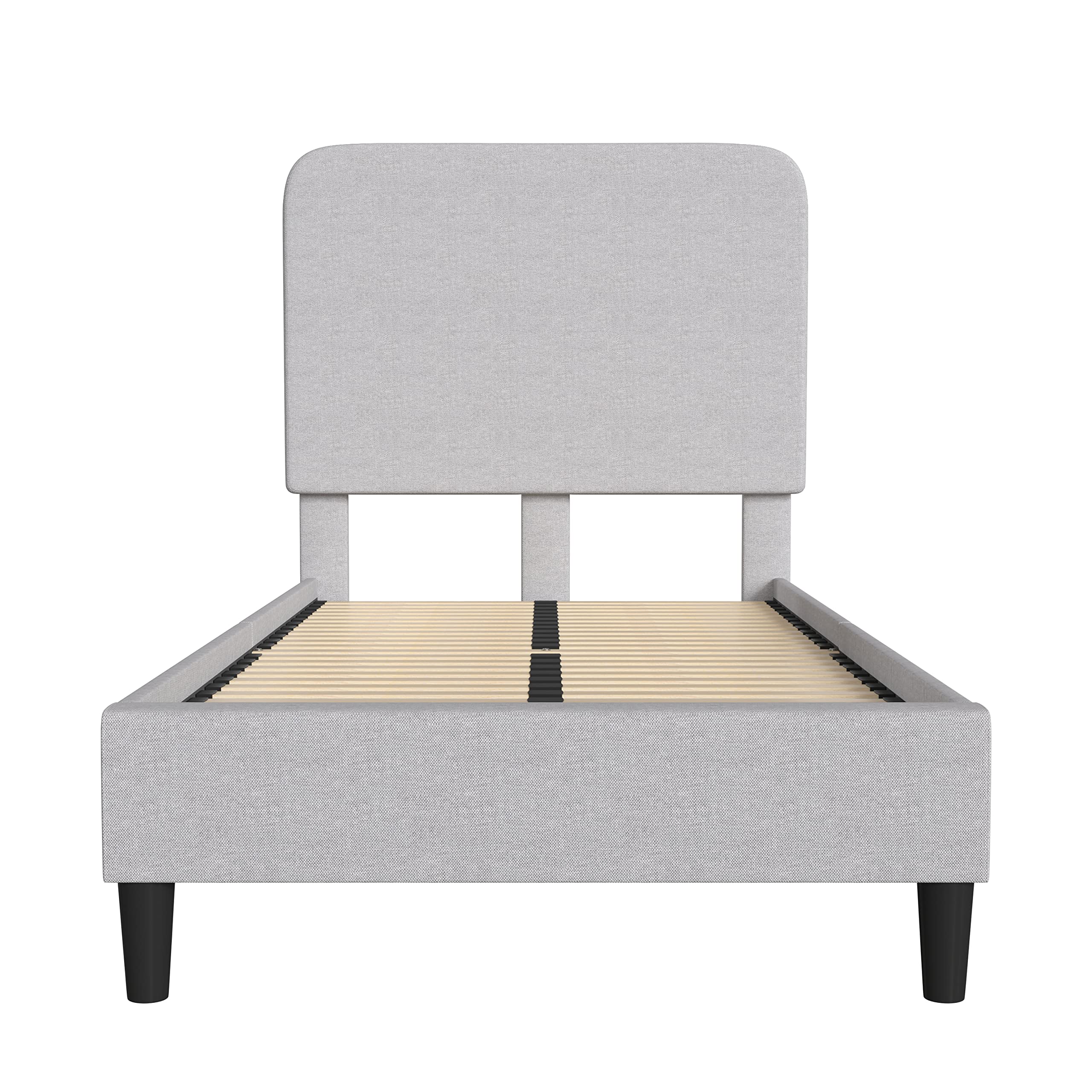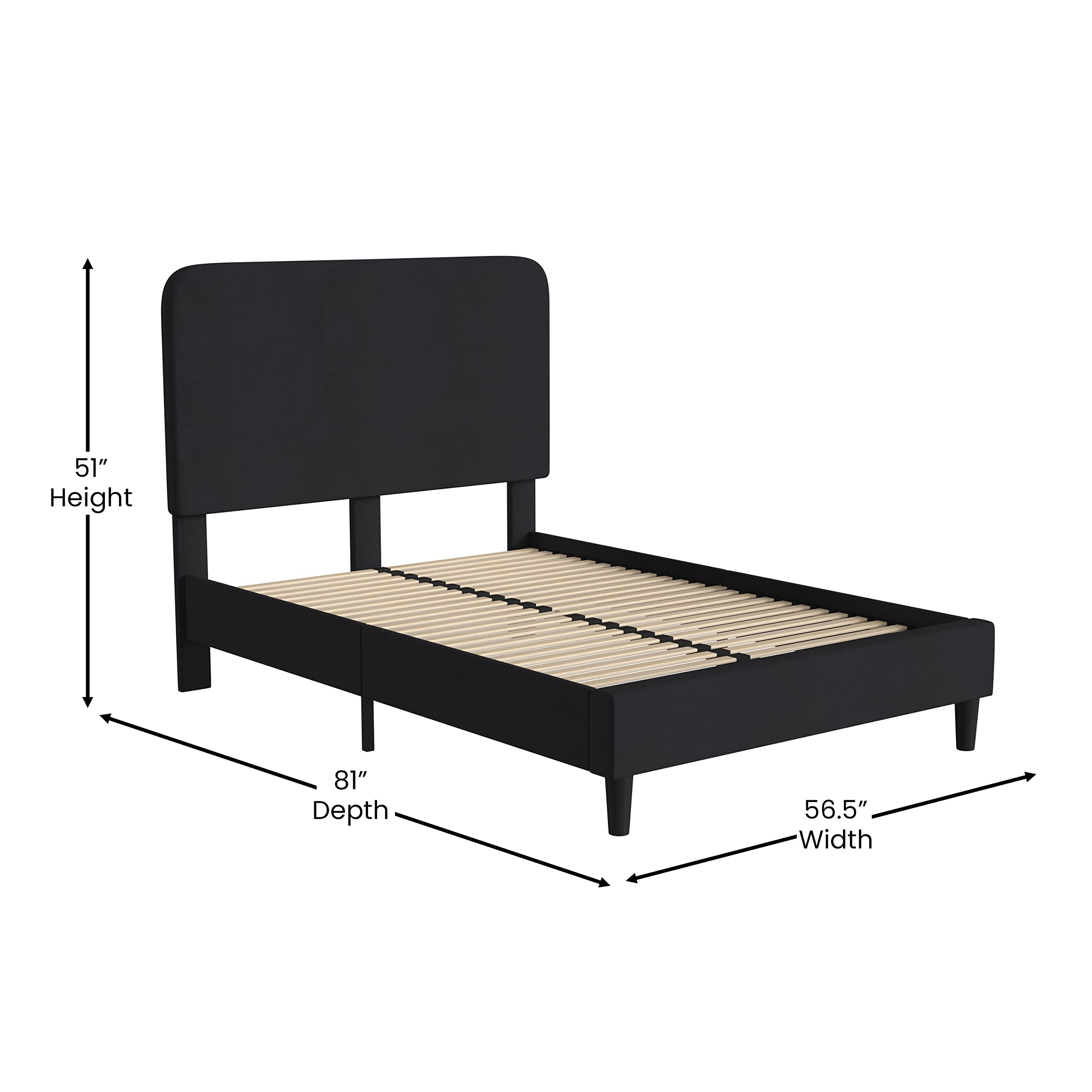 Enhance any bed with the upscale look and added comfort of the Flash Furniture Addison Fabric Upholstered King Size Platform Bed. This bed boasts a classic design featuring a soft charcoal fabric upholstered headboard with gently rounded corners and a space-saving, stylish low profile footboard to add timeless elegance to any master bedroom or guest bedroom in your home. 14 sturdy wooden slats with iron side legs and a middle support leg accommodate almost any mattress, so no foundation or box spring is required. Constructed with a sturdy wood frame and steel metal brace with wood screw reinforcements, this upholstered bed holds up to 800 pounds of static weight and withstands years of quality use. Fixed plastic floor glides protect hard flooring surfaces when moving the bed, and the low profile bed can be wiped down with a damp cloth to remove dust or soil to keep it looking great. This king size bed measures 78.5"W x 85.75"D x 51"H. Assembly takes less than one hour thanks to the step-by-step illustrated assembly instructions with included tools.