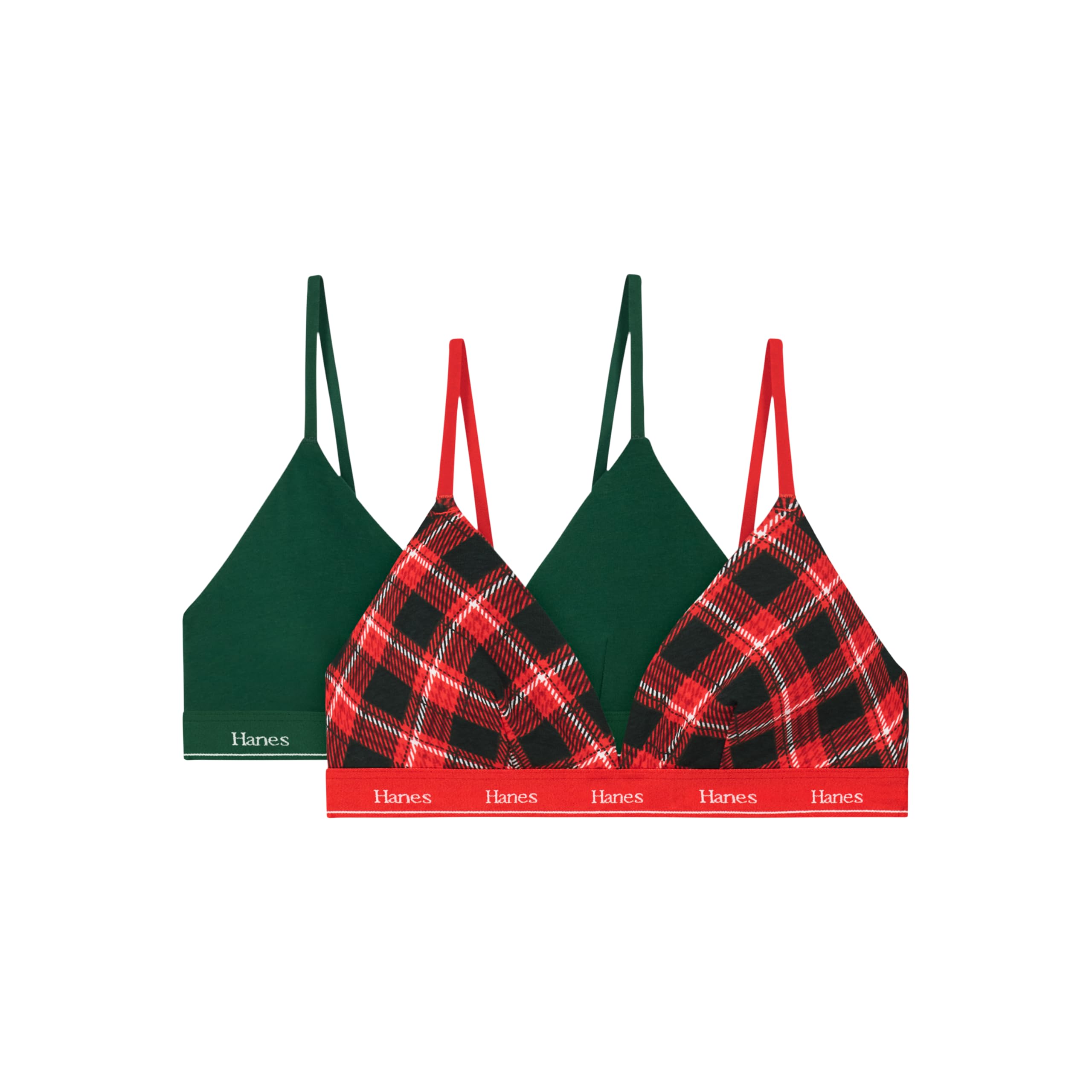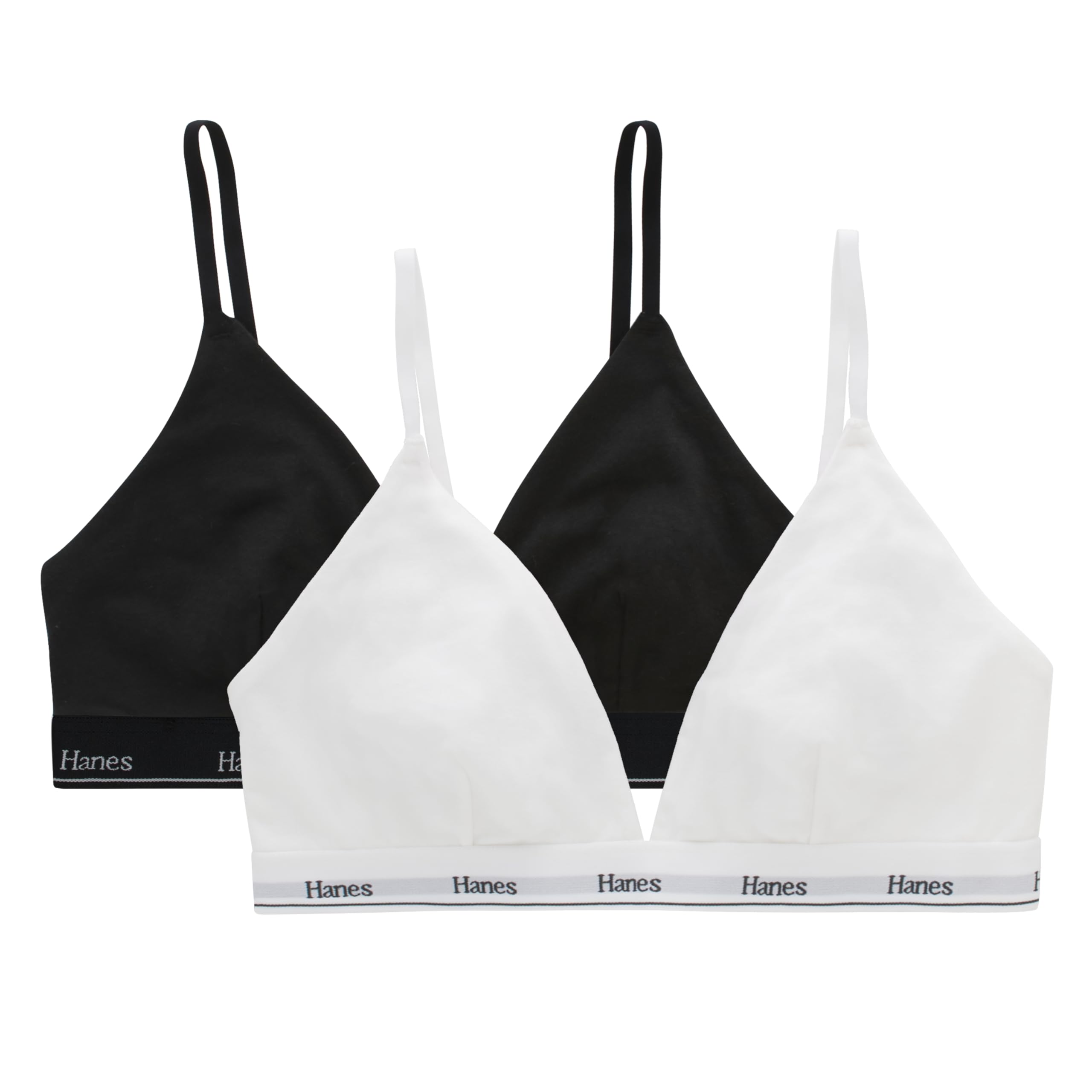 Meet the everyday bralette for women that does it all — the Hanes Originals Triangle Bralette 2-Pack delivers breathable comfort, soft stretch, and a naturally flattering fit. Made from a cotton-rich blend, this wireless bra for women feels smooth against the skin while providing light support for daily wear. Designed with ComfortFlex Fit® fabric, these cotton bralettes move with you and shape to fit your body perfectly. The Cool Comfort™ moisture-wicking lining helps lift moisture from the skin to keep you cool and dry, while adjustable straps and a hook-and-eye closure make it easy to find your ideal fit. Finished with a flattering V-neckline and a soft comfortband that stays in place, this versatile cotton wireless bra pairs perfectly under tees, tanks, or low-cut tops. Get everyday comfort and value in this 2-pack of breathable bralettes for women that feel as good as they look.