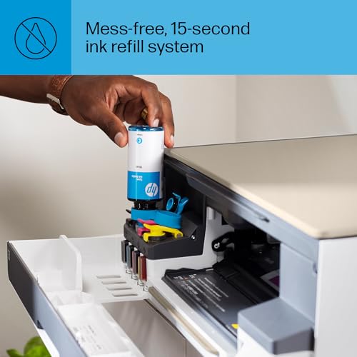 • MESS-FREE REFILL – Replenish ink with HP's easy-access, mess-free refill system. Simply plug the ink bottles into the ink tank and let them drain—no squeezing, no spilling