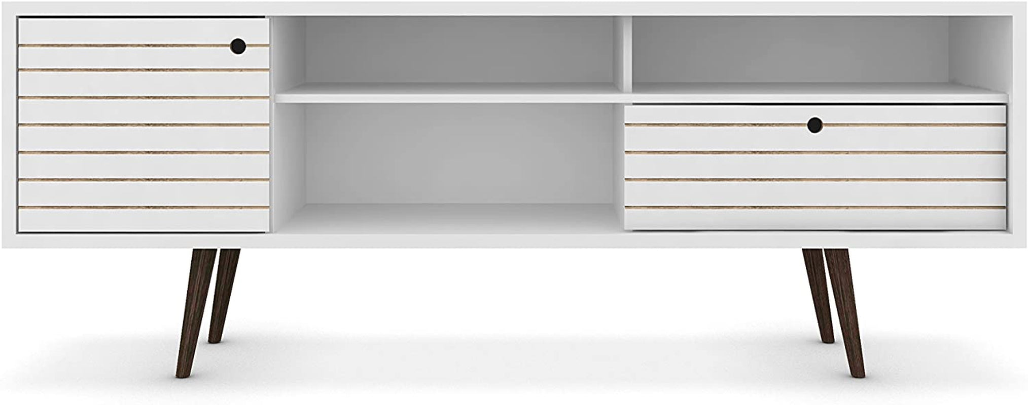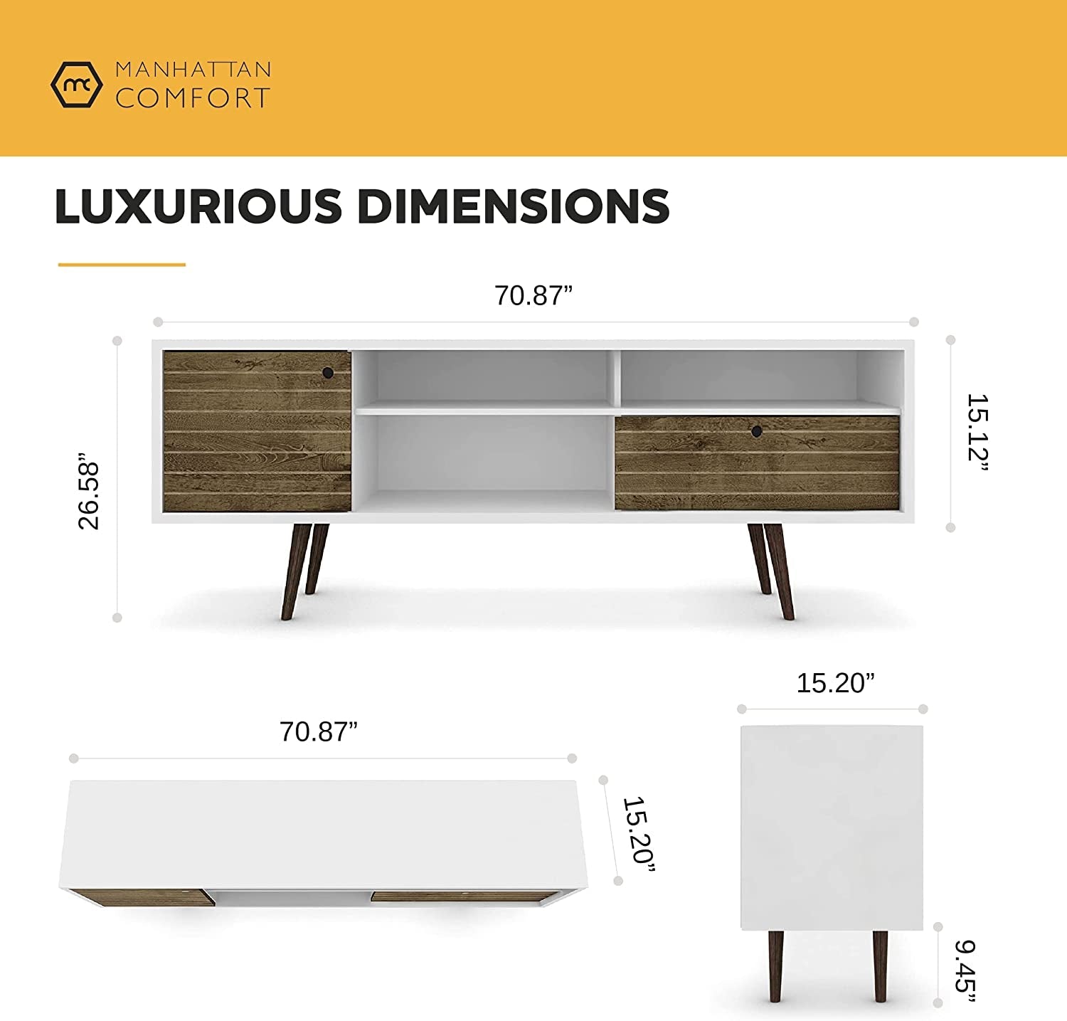 Bring the Big Apple into your home with Manhattan Comfort. Our Liberty media stand will fit into even the smallest of apartments while still bringing sleek and practical style. It includes a console cabinet that can house gaming consoles, movies, and games and has shelves that can hold board games, books, and any other items that need a home. This low TV stand also offers space to display your favorite collectibles. It won’t take up much room but will seriously deliver on quality and style. This console is made with high-quality MDF to ensure durability and lasting beauty and comes in a variety of colors and finishes, allowing you to choose the best television stand for your space. Try it in your bedroom, living room, or media room. Undeniable quality, a stunning look, and convenient storage come together to make this piece a must-have for any home or apartment. Complete your space with a Manhattan Comfort TV stand with storage!
