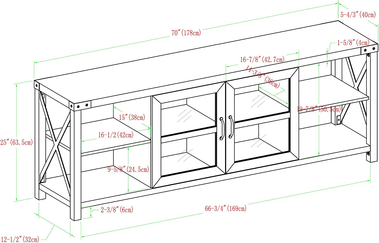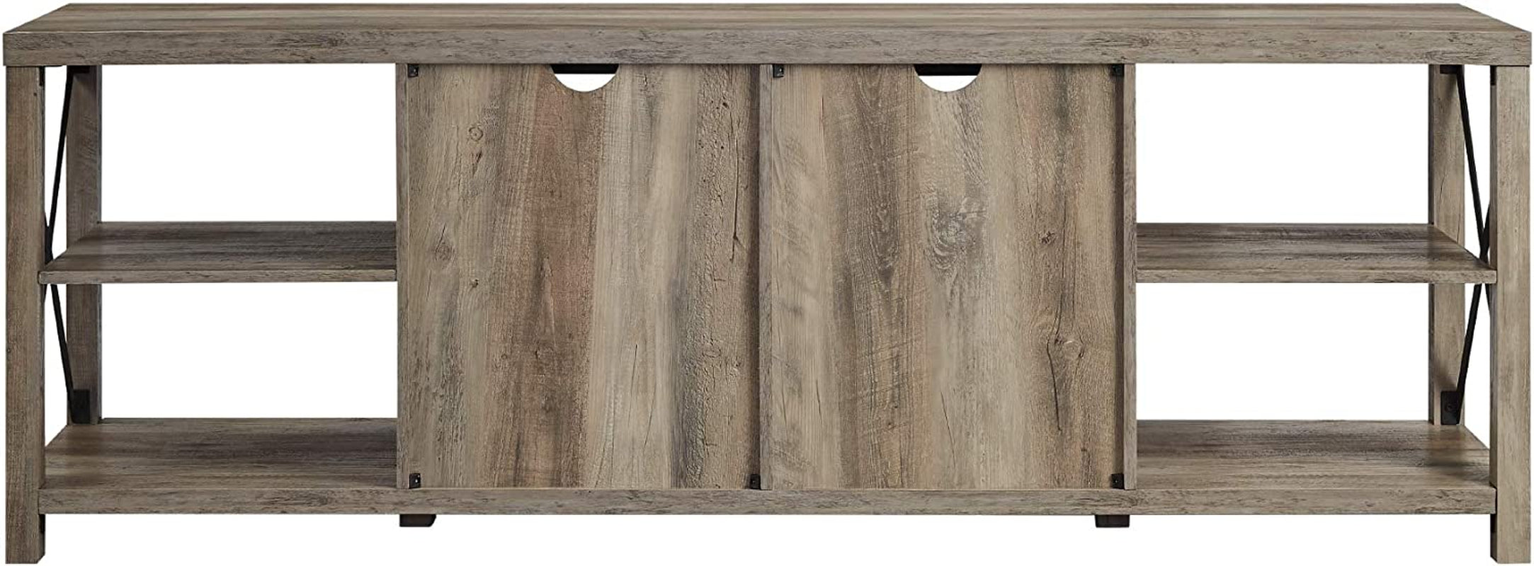 Find the ideal entertainment unit at the intersection between style and functionality with this metal x 70-inch TV console. Putting an industrial spin on the farmhouse design trend this media console features open and closed storage that’s framed with exposed metal accents on the sides and top corners of the piece. Behind the tempered glass front doors with soft close hinges are adjustable shelves. The side shelves are fixed. This media stand features cord management options and can accommodate TVs up to 78-inches.