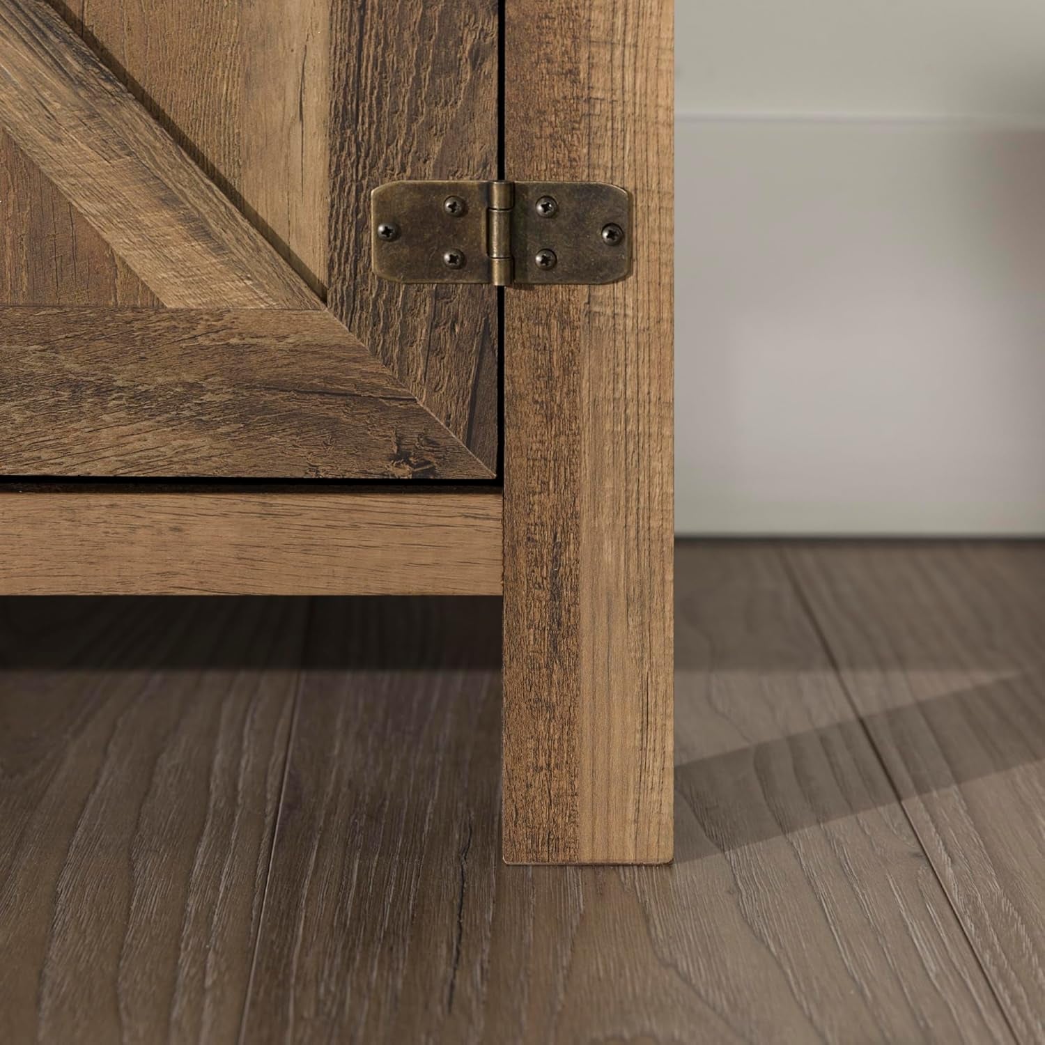 Introduce a charming modern farmhouse style for a friendly, welcoming addition to your home with this 70-inch TV stand. Of high-grade MDF, durable laminate with gorgeous wood grain detailing, and metal accents on the hinges and handles, this entertainment center exudes a rustic and traditional appeal. With barn door style cabinet doors, open and closed storage, and adjustable shelving for overall functionality in style. Hide away your books, DVDs, and more behind the side cabinet doors and your electronics on the open shelving. Including cord management to keep electronic wires organized. Use in your bedroom as a storage console, in your living room as a TV stand to hold up to a 78-inch TV, or as a buffet table in your dining room for décor and extra kitchenware.