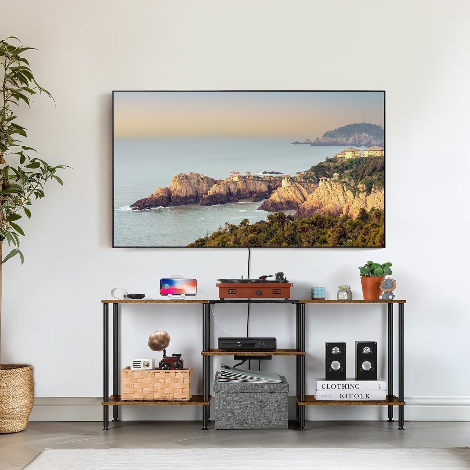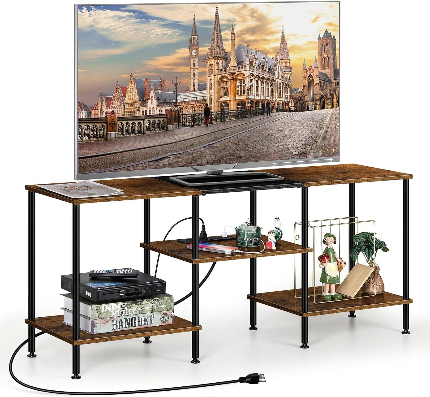 • Integrated Charging Station: Stay connected with 3 AC outlets and 2 USB ports, perfect for charging your TV, gaming consoles, and other devices.