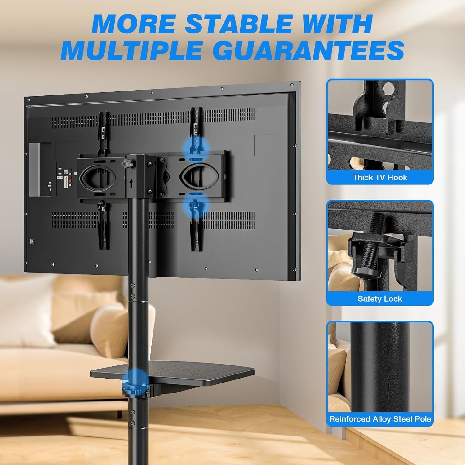 With its adjustable features and durable construction, our mobile TV stand is perfect for home theaters, offices, hotels, and more. Enjoy a clutter-free environment while having the flexibility to move your TV wherever you need it.
