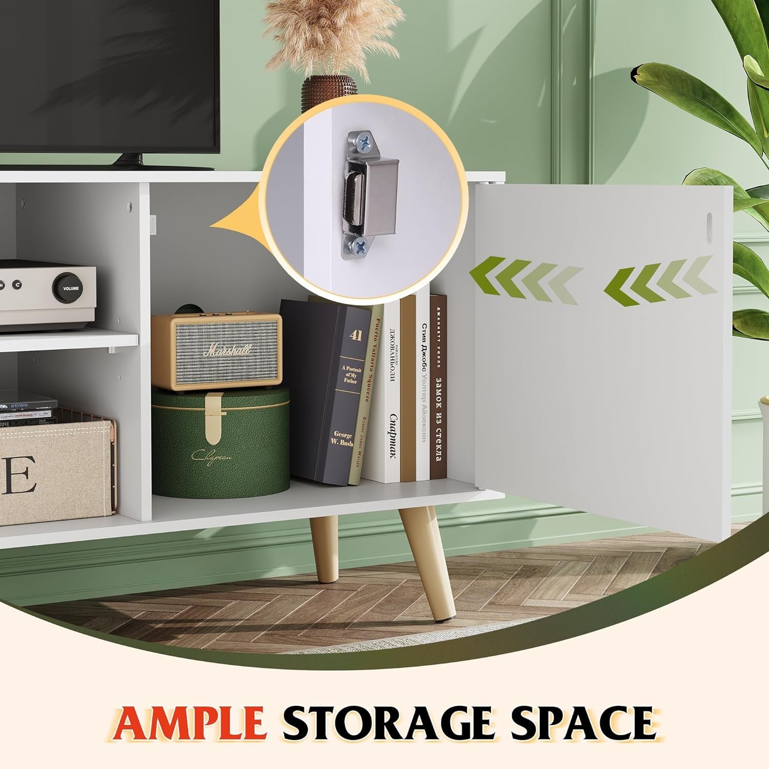 Elevate your living space with our stylish Mid-Century Modern TV Stand, designed to accommodate televisions up to 55 inches. Featuring a sleek design with tapered angled legs, this entertainment center adds a retro charm to your home decor.