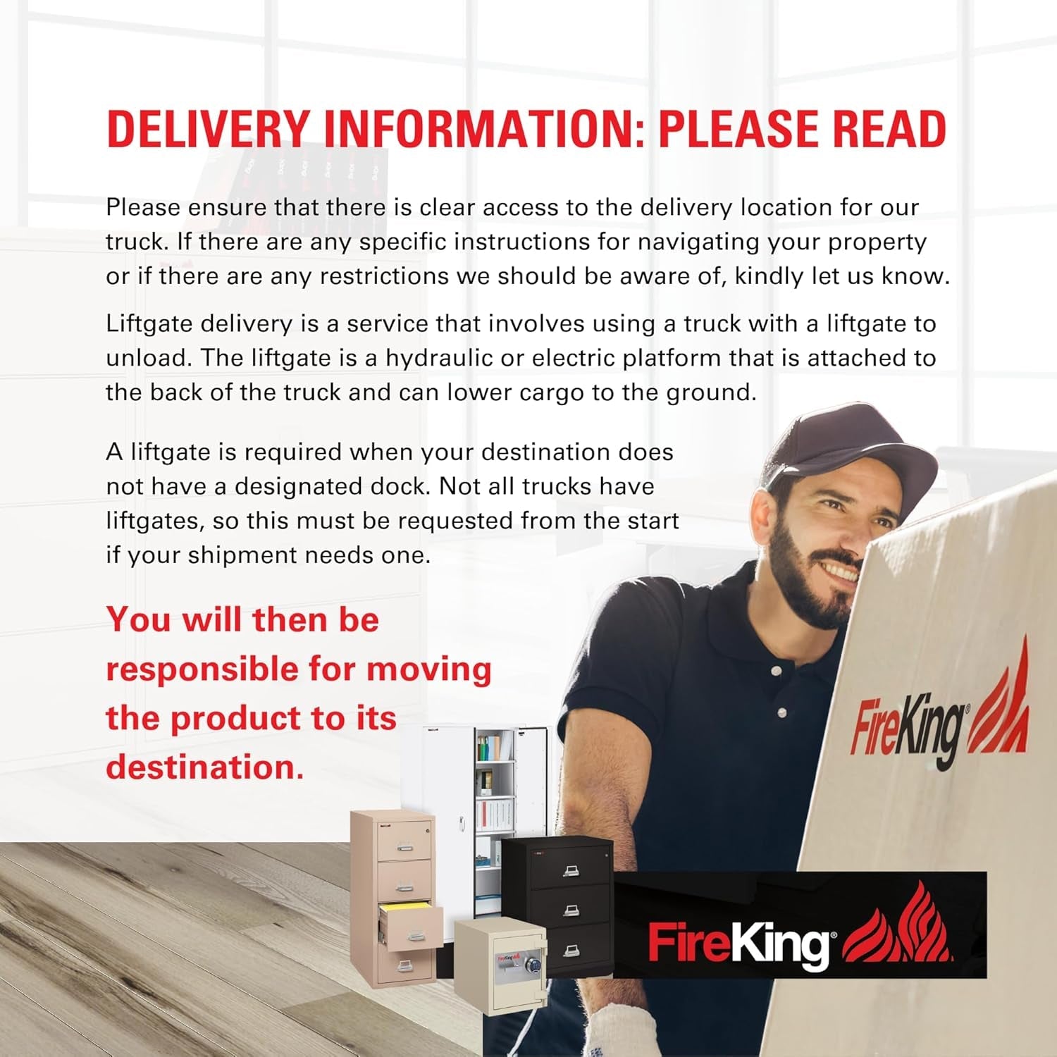 When you are protecting valuable documents you want the best. When it comes to fire protection, half as good is no good. It features four legal-size 31" deep file drawers built with high sides for use with hanging folders and 1 follower block per drawer. One high-security UL listed key lock top drawer is used to control all drawers. Fireproof insulation is 100% gypsum reinforced by a 1” x 2” lattice made of 14-gauge galvanized welded steel wire, providing complete peace of mind from fire, impact, or explosion. 1-Hour Class 350 Fire with Impact UL label. Tests include 1 hour exterior file exposure at 1700°F, a 2000°F explosion test, and a 30 foot drop to test impact integrity. ETL Verified Listed Water Resistant means files are designed to prevent water damage resulting from sprinklers and fire hoses. ETL Verified Mark 1/2 hour fire protection for hard drives, CDs, DVDs, flash drives, and HIPPA documents. 2-position drawer catch allows access to certain drawers while others remain locked. Drawer heads are formed of welded steel and filled with fireproof insulation, and are field replaceable. Finish is an environmentally-friendly electrostatic powder coating applied to all sides, including bottom. The finish is scratch-resistant, providing a lifetime quality appearance. Fireking's Limited lifetime warranty on all mechanical or operable parts. Associated labor costs will be paid by FireKing for two years from the date of purchase. If your FireKing file sustains any damage while protecting documents from a fire, FireKing will replace the file free of charge.