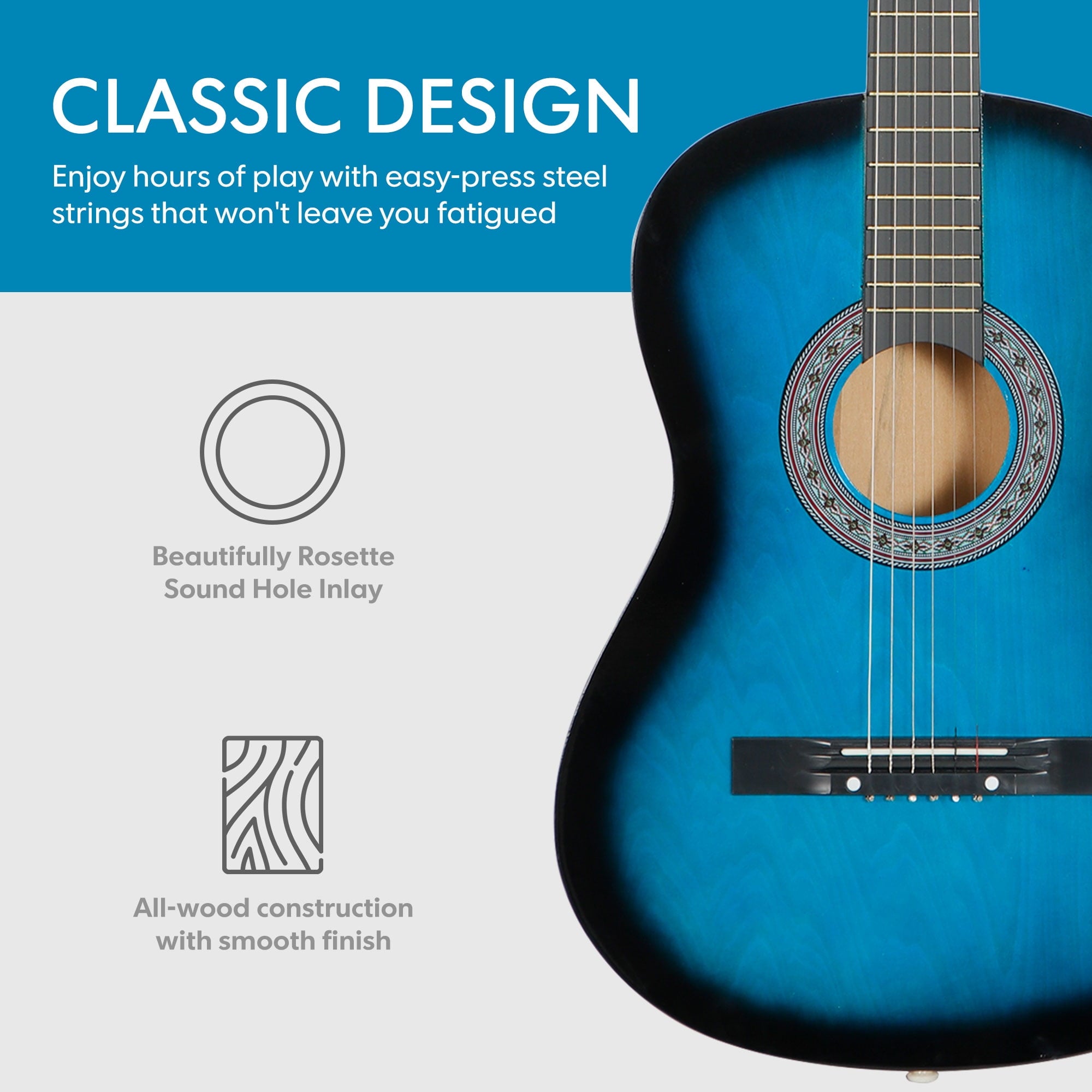 ZenSports 38-inch Acoustic Guitar is designed with a smaller size and lighter weight, easy to handle for those with smaller hands or new to guitar playing. Crafted from all-wood construction with high-gloss finish that looks stylish and protects it from scratches. The 19 frets let you play different chords and melodies, and the steel strings sound bright and crisp. It includes a carrying case, a guitar pick for precise plucking, a pitch pipe for tuning accuracy, a shoulder strap, and extra strings. Combines quality, playability, and style, this guitar is great for kids starting to play music or grown-ups who want a guitar that's easy to handle.